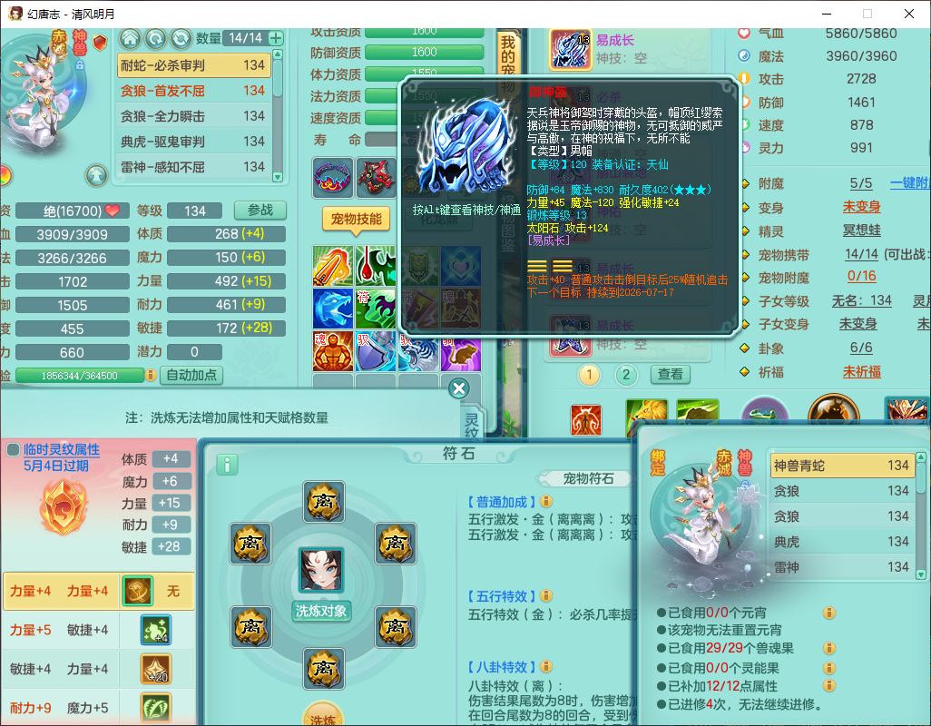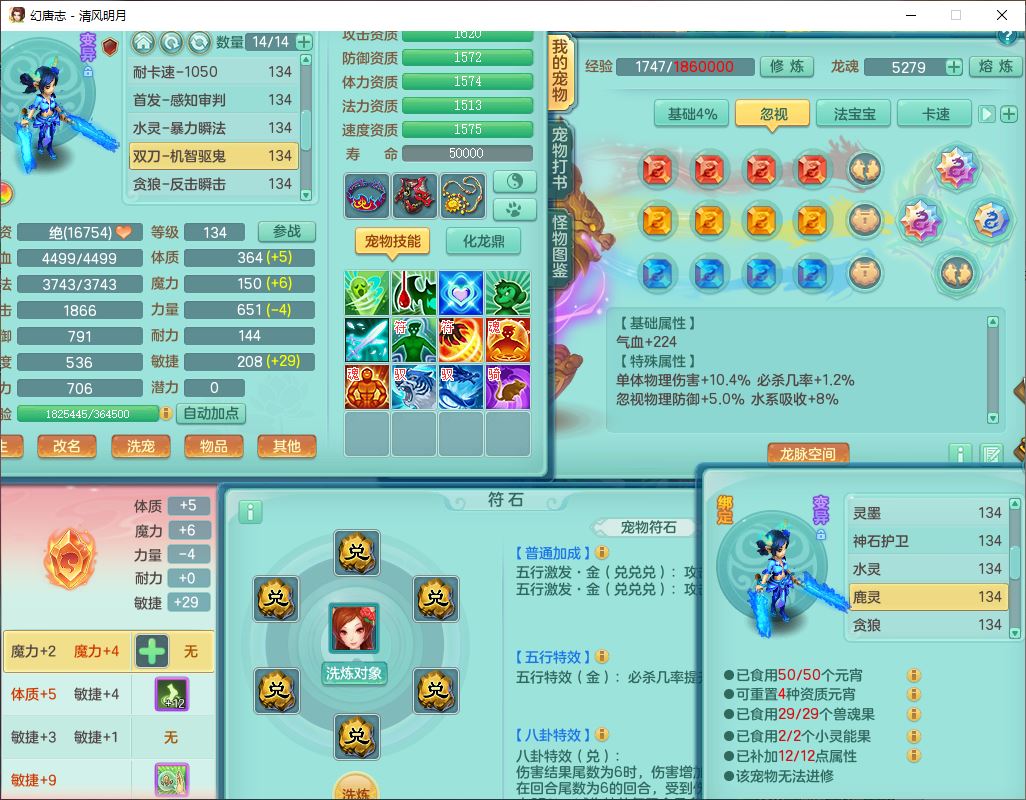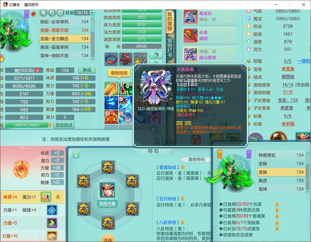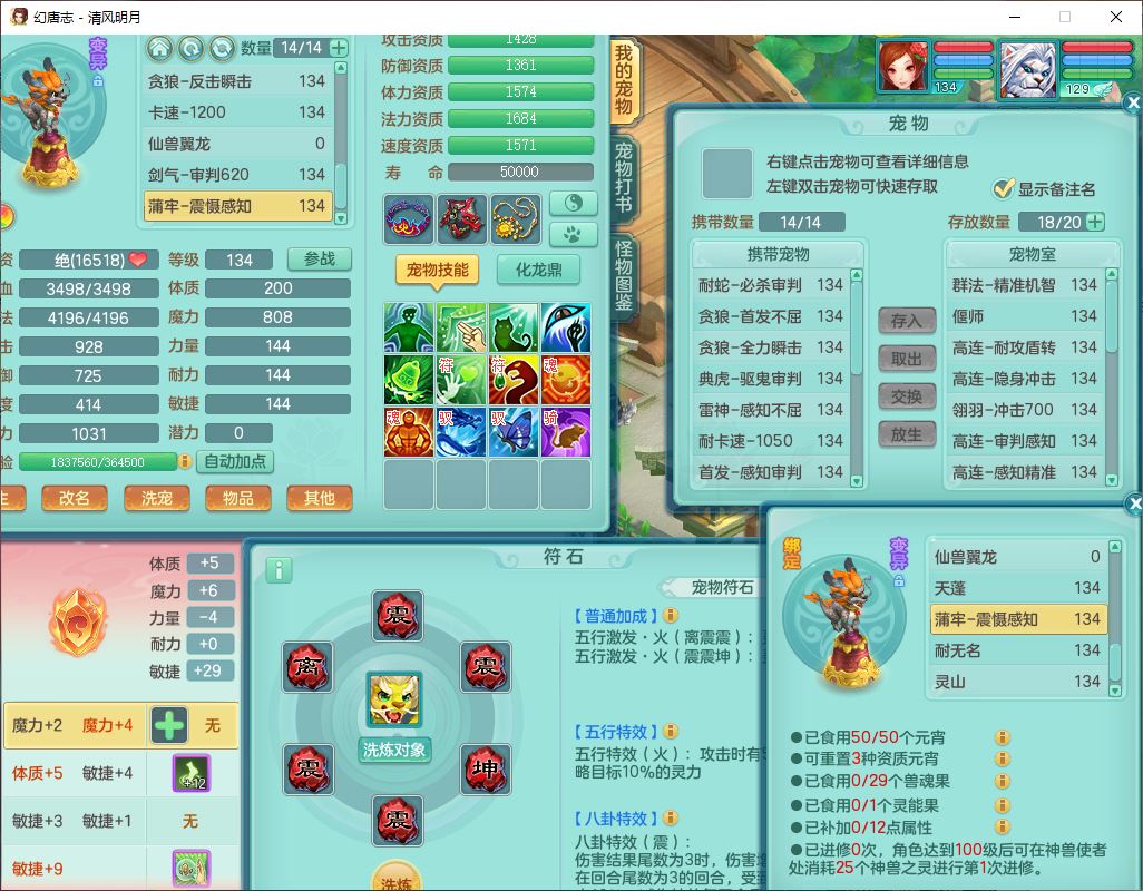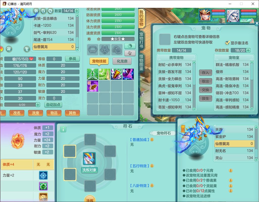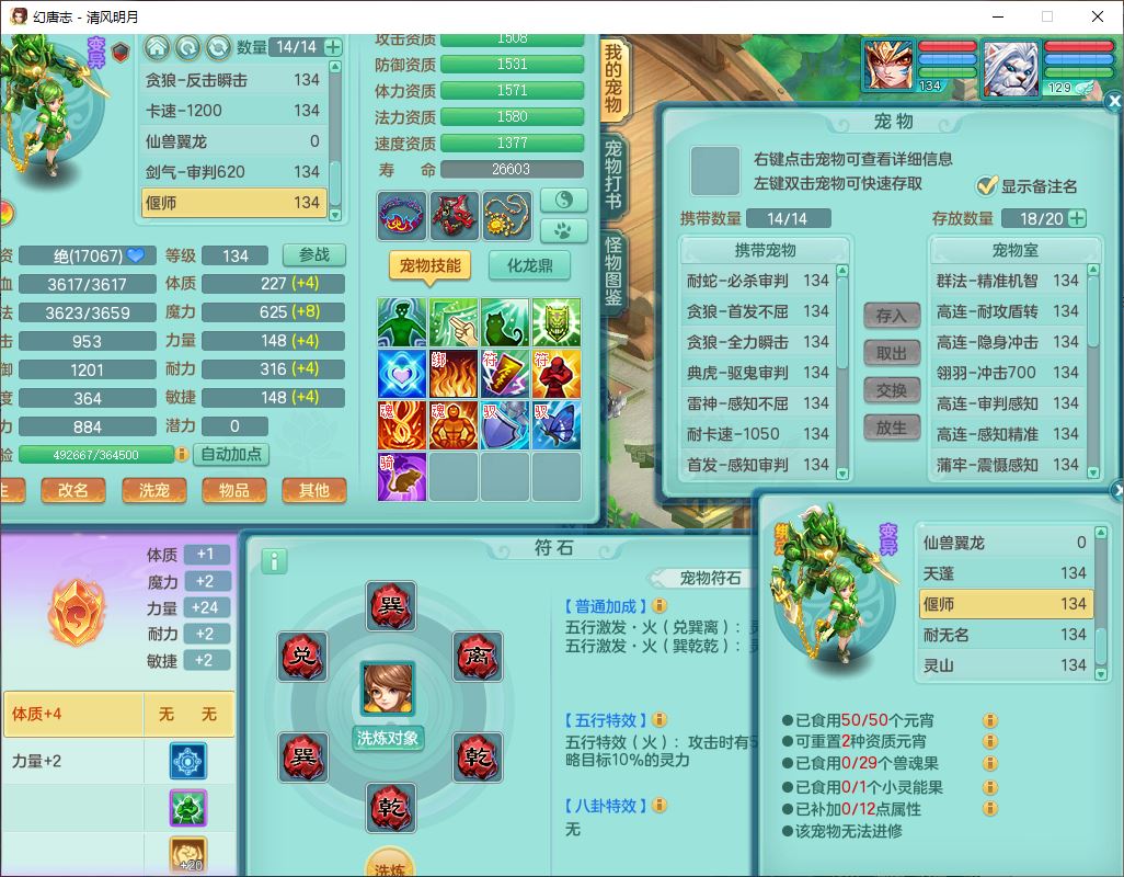 24297清风明月129男万兽【准潜龙号,差1只宝宝3条主符石1条附加】精灵歌,1龙(换、无内)1内丹青蛇3贪狼1神石1金炉,6觉醒7六字1五字13四字13只满果子,8红装备,必杀激励武器,崩山衣服,神佑项链,Y慈航腰带,仓库多双红,可搭星辰只有法系装,法爆回天武器,幸运法缭笑里衣服,鼎4.5+56+224,23个内丹碎片,1双人飞行坐骑