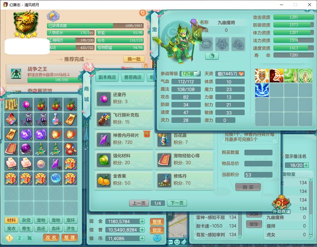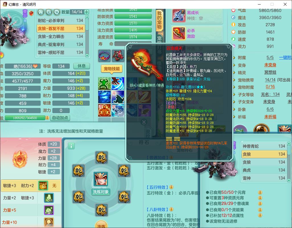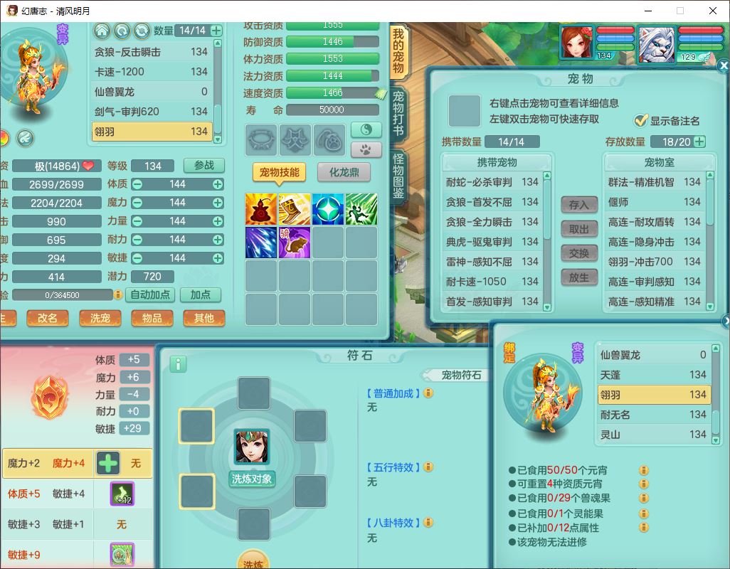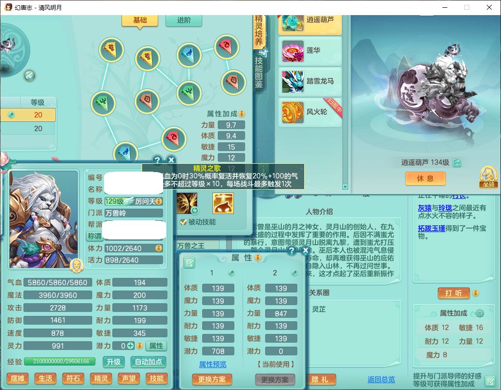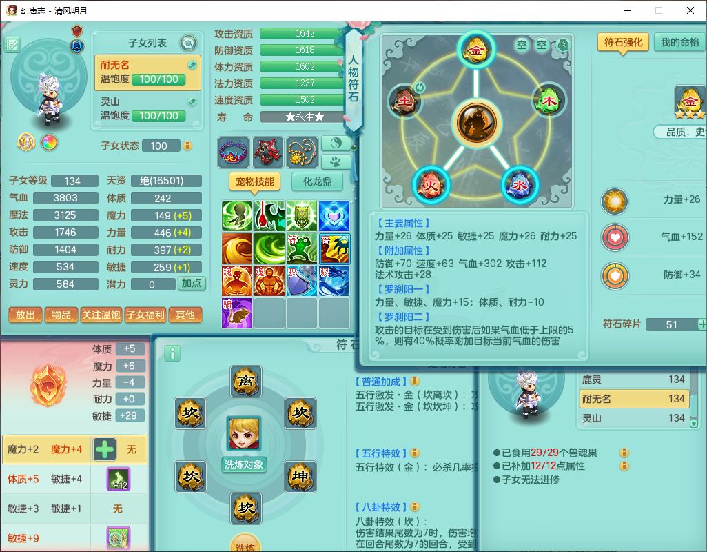 24297清风明月129男万兽【准潜龙号,差1只宝宝3条主符石1条附加】精灵歌,1龙(换、无内)1内丹青蛇3贪狼1神石1金炉,6觉醒7六字1五字13四字13只满果子,8红装备,必杀激励武器,崩山衣服,神佑项链,Y慈航腰带,仓库多双红,可搭星辰只有法系装,法爆回天武器,幸运法缭笑里衣服,鼎4.5+56+224,23个内丹碎片,1双人飞行坐骑