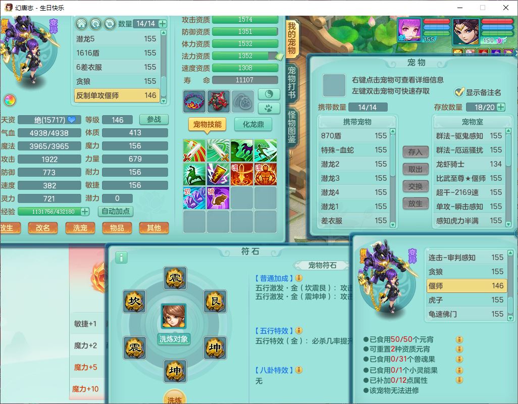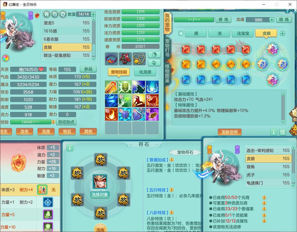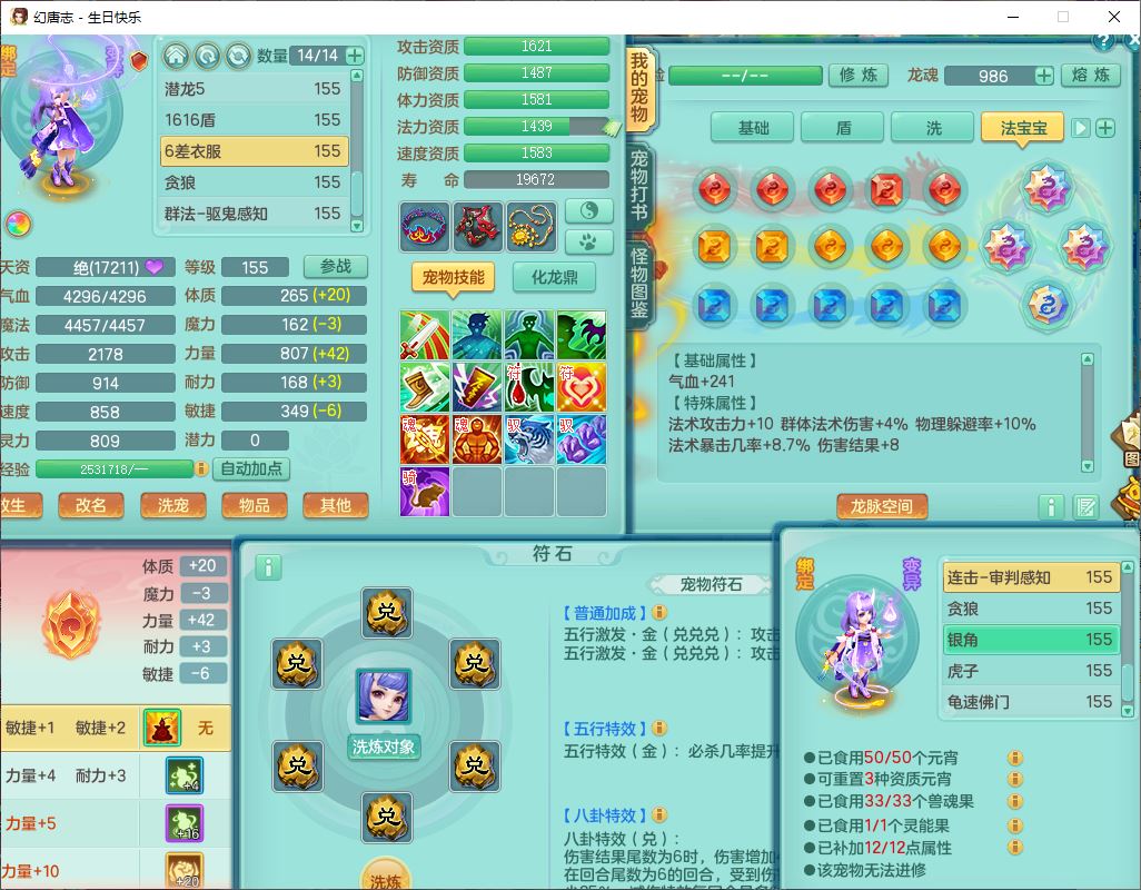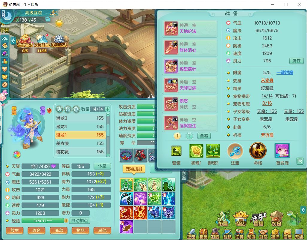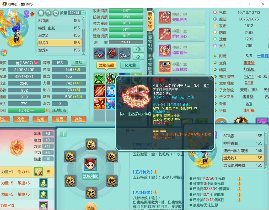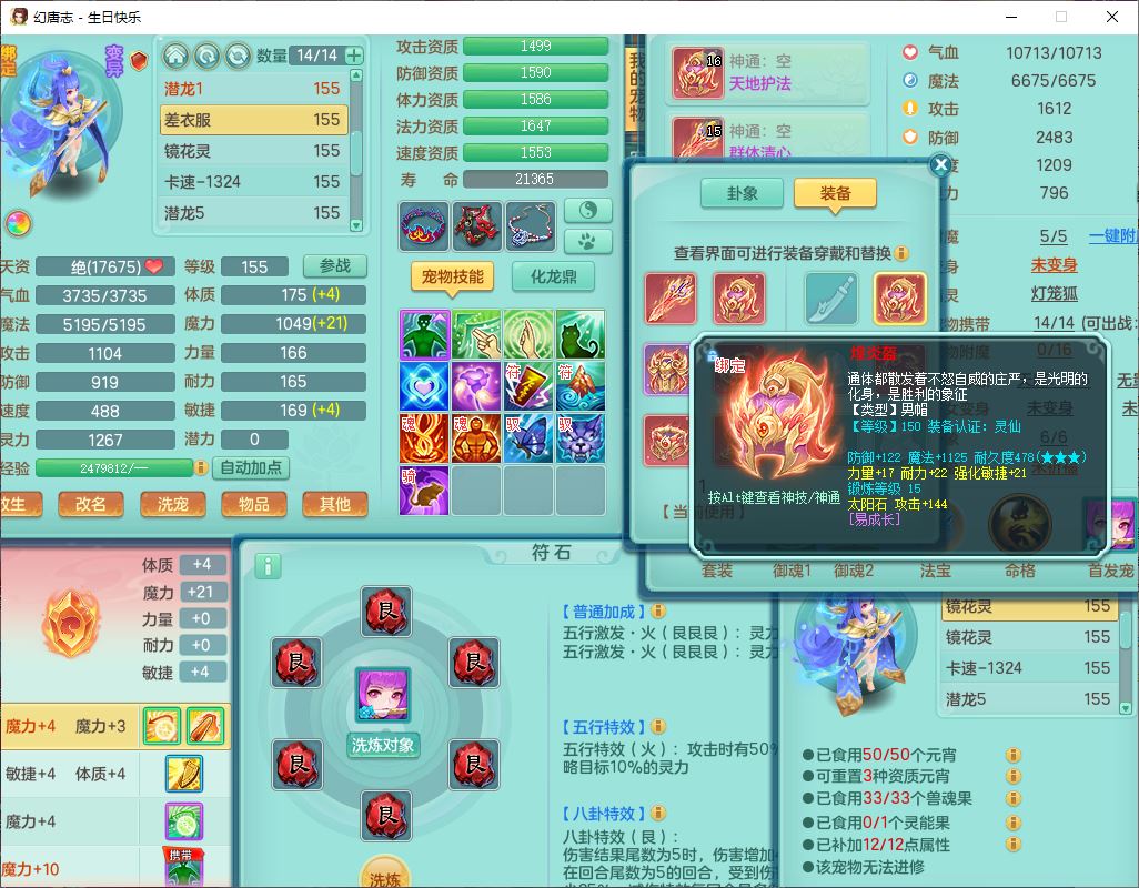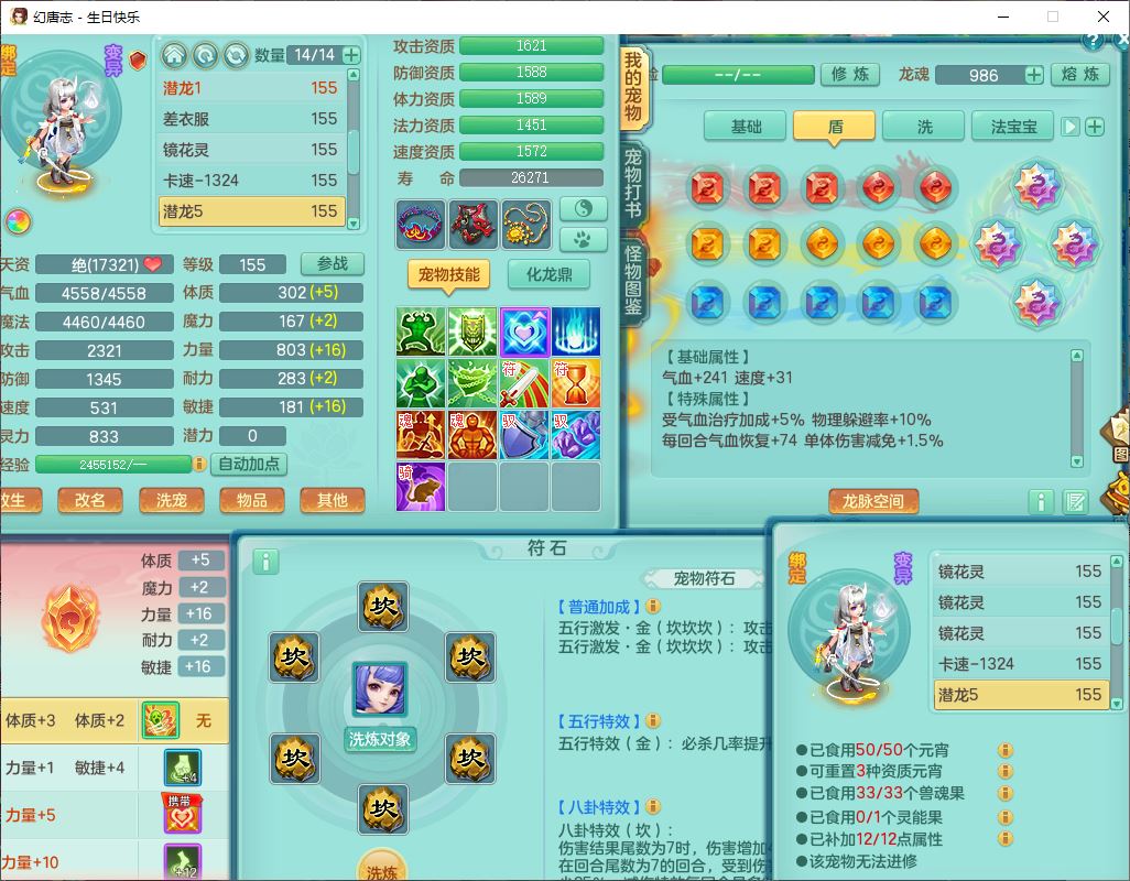 62433生日快乐159男普陀【准潜龙号,差2只宝宝2颗厚土】精灵舞,1龙(换、无内)1内丹青蛇3镜花1望归,9觉醒1宠皮8六字1五字5四字综合14只满果子,愤怒五特装备,有物理装,Y帽子,神佑项链,鼎4.5+70,法爆8.7,150天月卡,永久外观,14个内丹碎片,1双人飞行坐骑