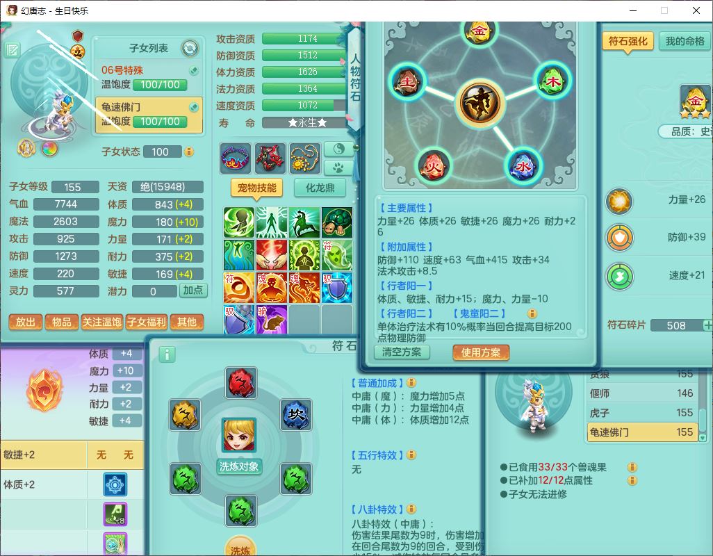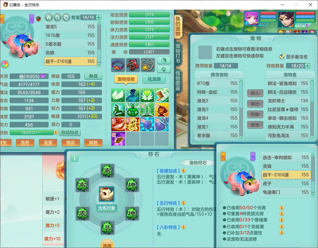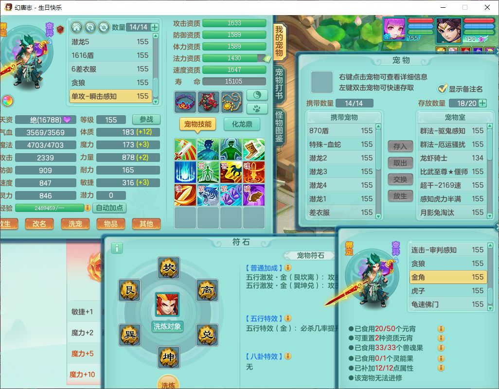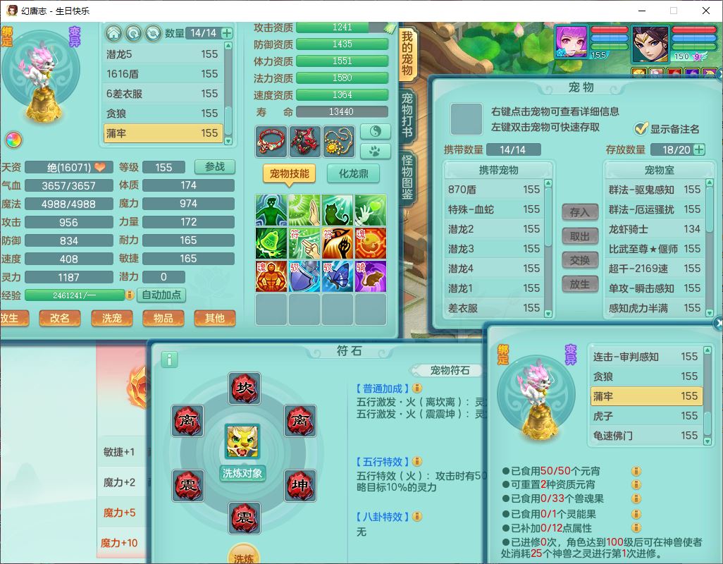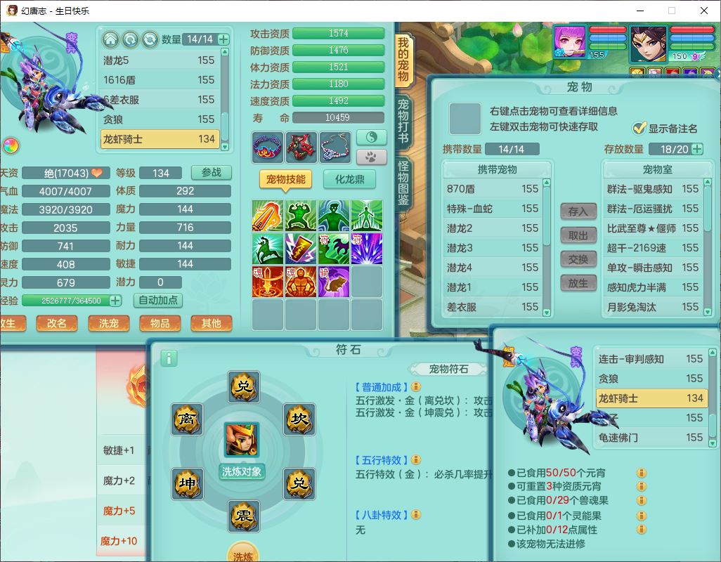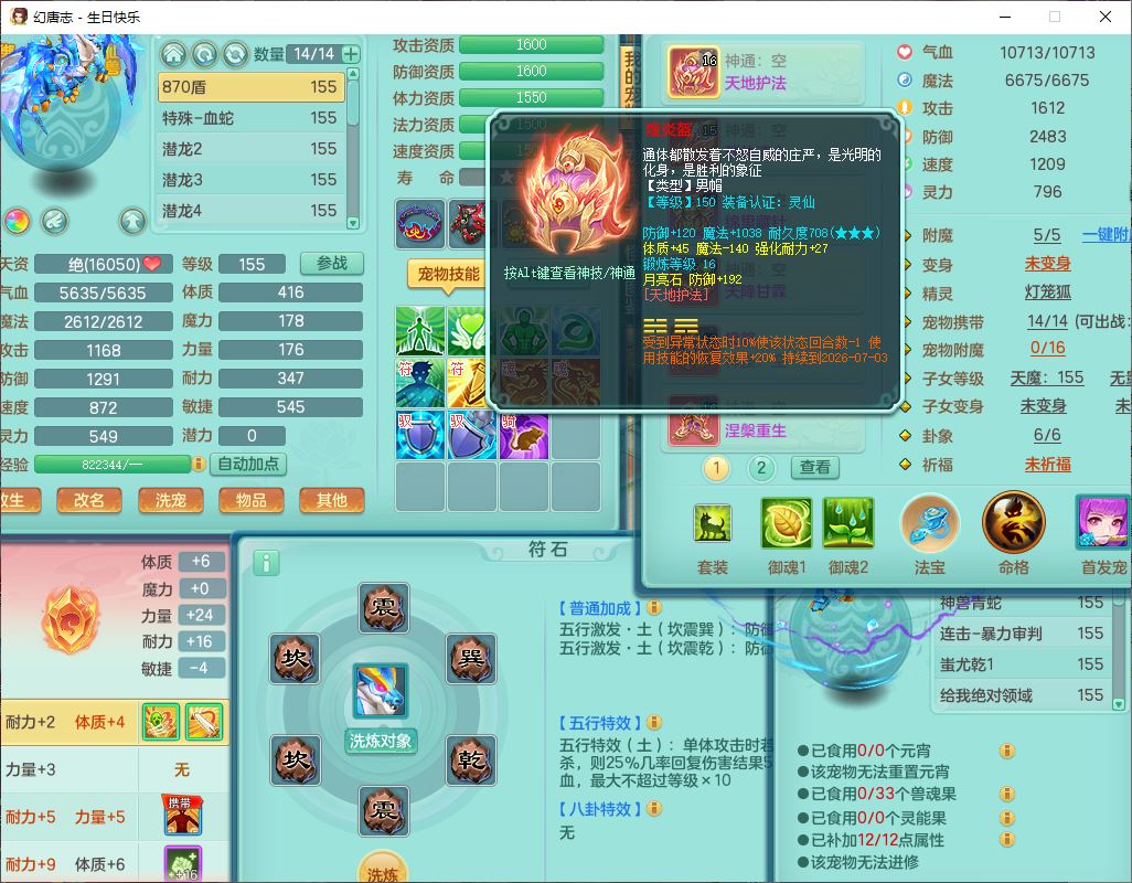 62433生日快乐159男普陀【准潜龙号,差2只宝宝2颗厚土】精灵舞,1龙(换、无内)1内丹青蛇3镜花1望归,9觉醒1宠皮8六字1五字5四字综合14只满果子,愤怒五特装备,有物理装,Y帽子,神佑项链,鼎4.5+70,法爆8.7,150天月卡,永久外观,14个内丹碎片,1双人飞行坐骑