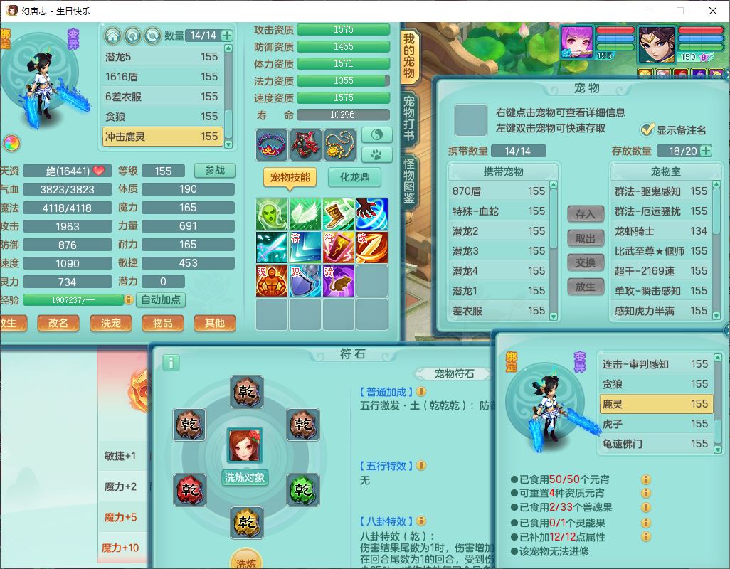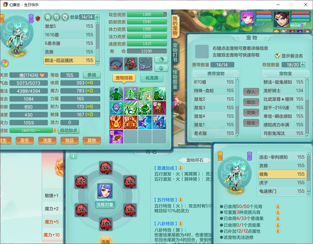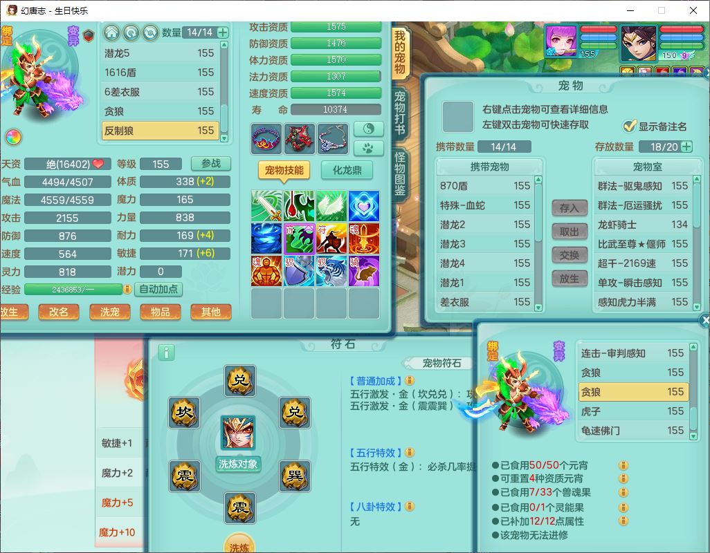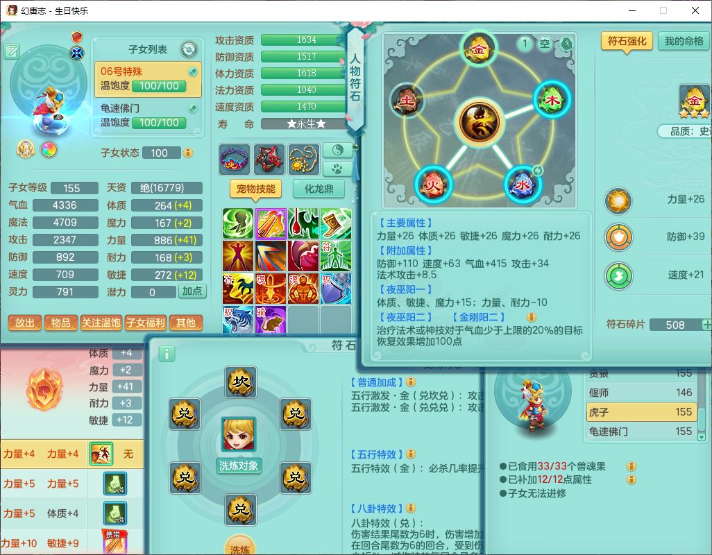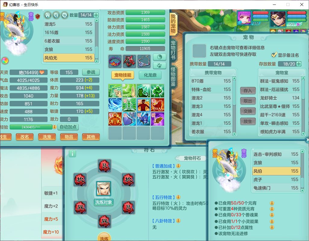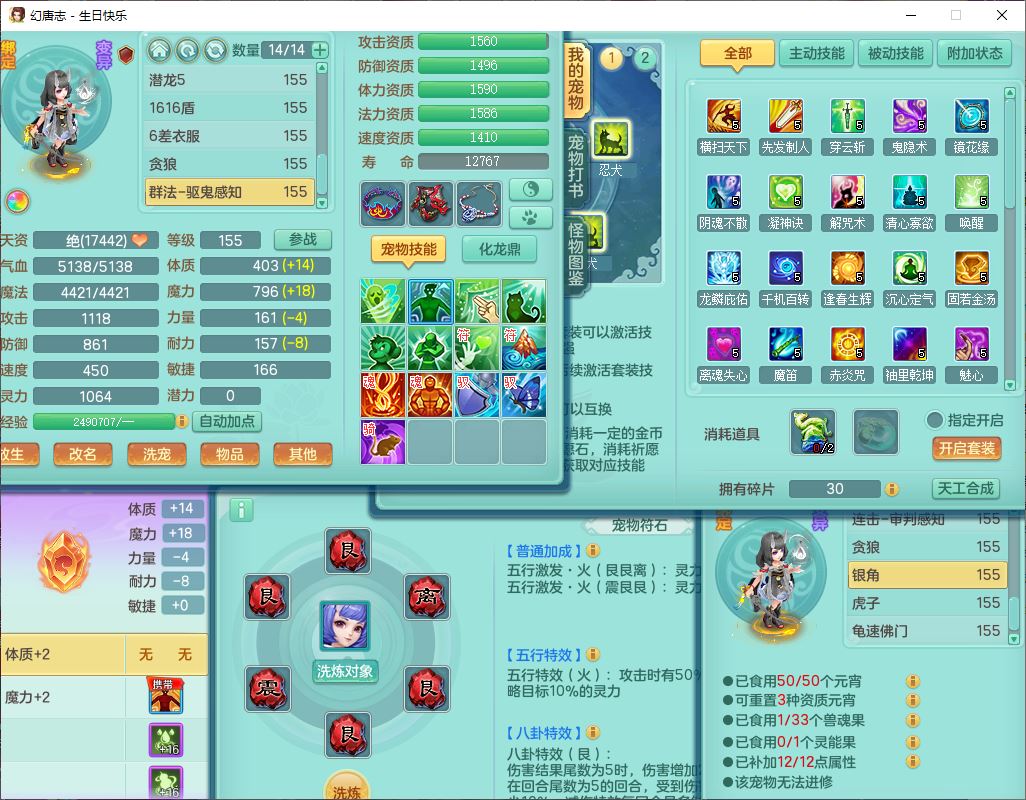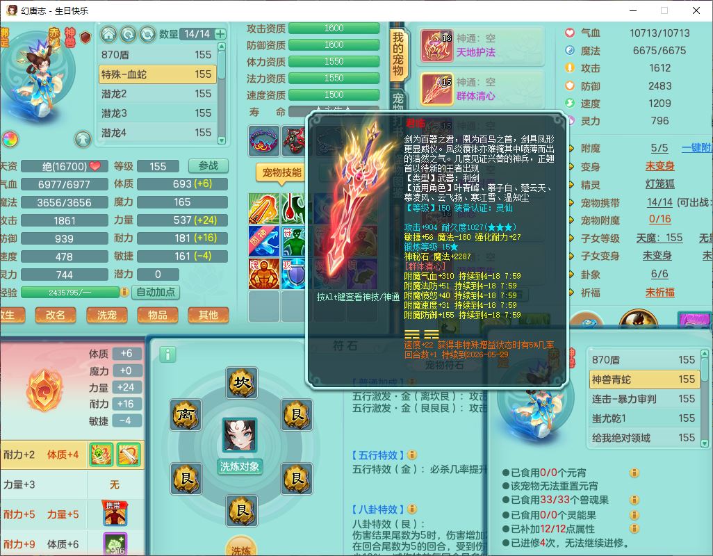 62433生日快乐159男普陀【准潜龙号,差2只宝宝2颗厚土】精灵舞,1龙(换、无内)1内丹青蛇3镜花1望归,9觉醒1宠皮8六字1五字5四字综合14只满果子,愤怒五特装备,有物理装,Y帽子,神佑项链,鼎4.5+70,法爆8.7,150天月卡,永久外观,14个内丹碎片,1双人飞行坐骑