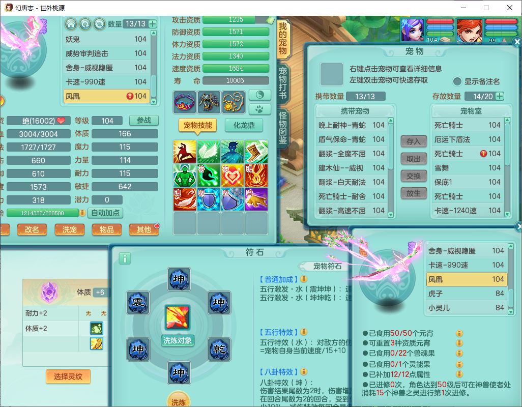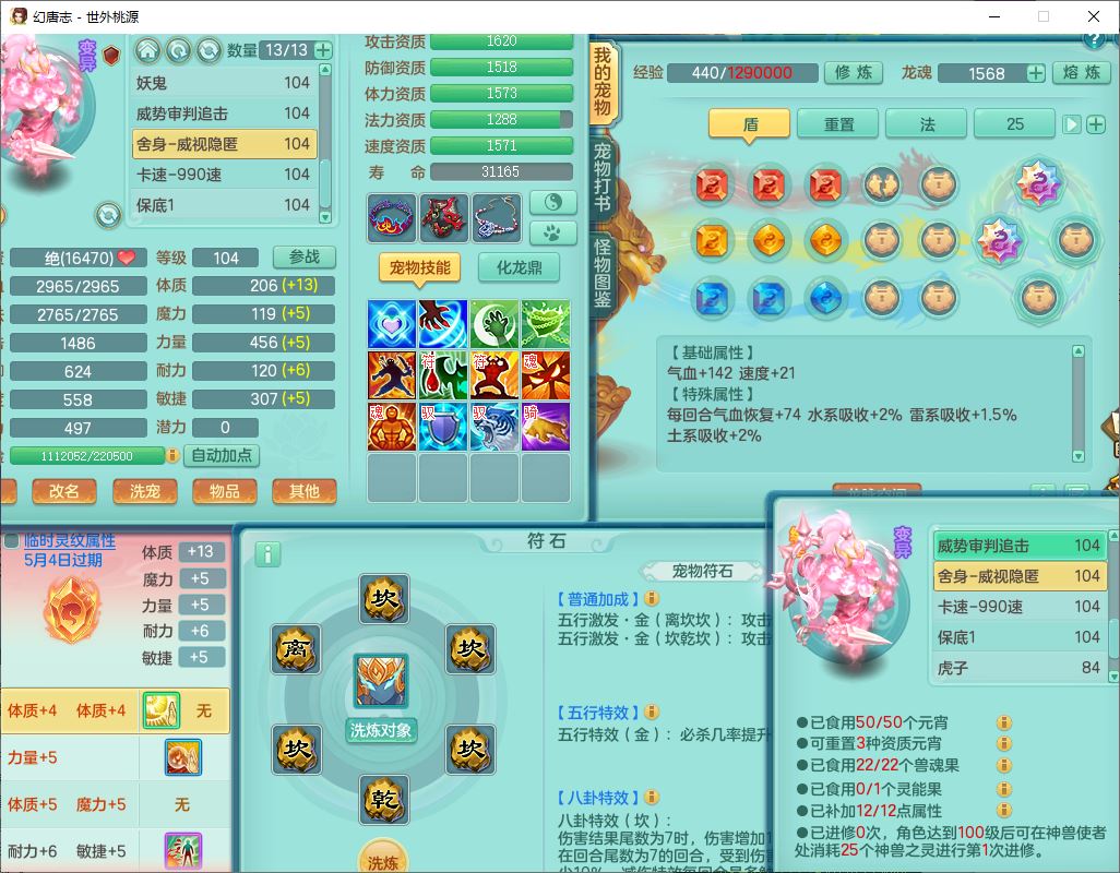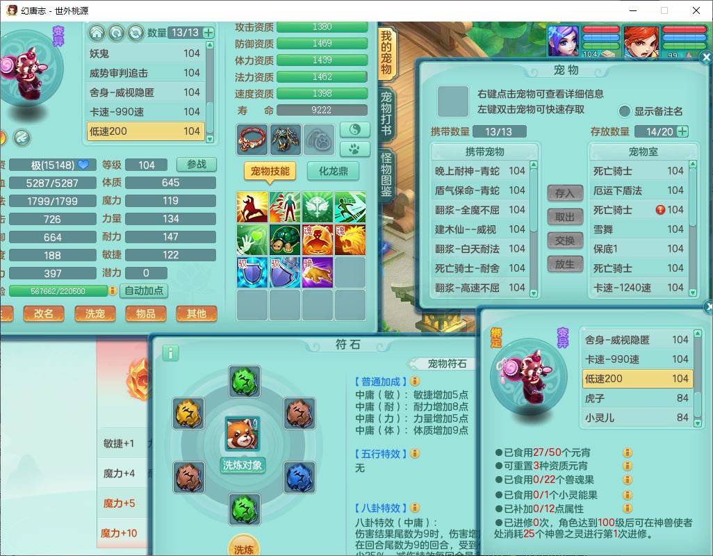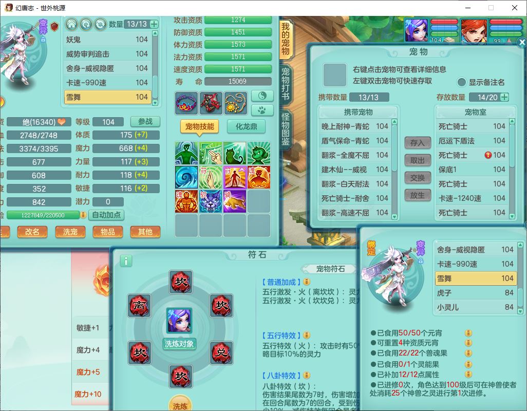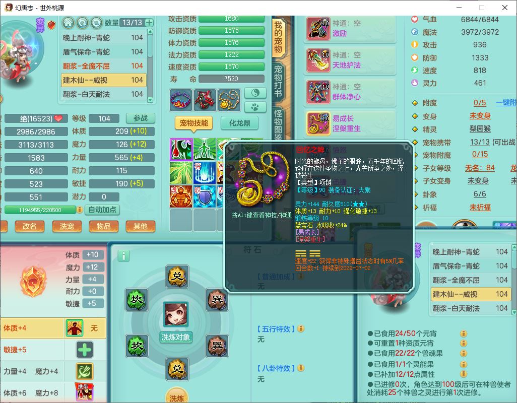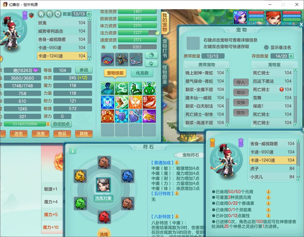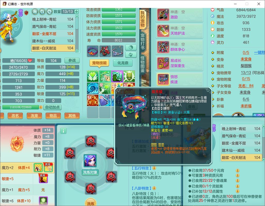 62431世外桃源99男方寸体敏、力体敏双精灵, 2内丹青蛇5翻江5舍身1七技能雷光妖鬼1金炉,4觉醒1宠皮5六字1五字11四字14只满果子,9红装备,Y慈航项链,愤怒疾速腰带,迅捷四海鞋子,有物理装备,崩山衣服,愤怒四海腰带,神佑四海项链,鼎2.5,2套符石,3坐骑(1双人飞行)