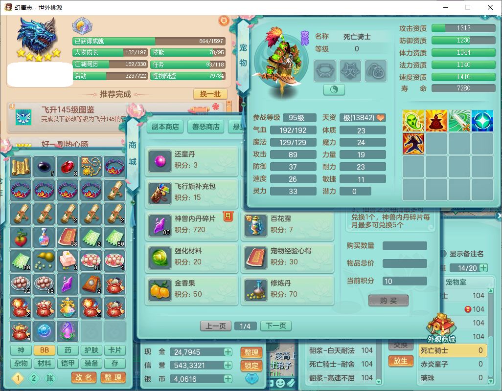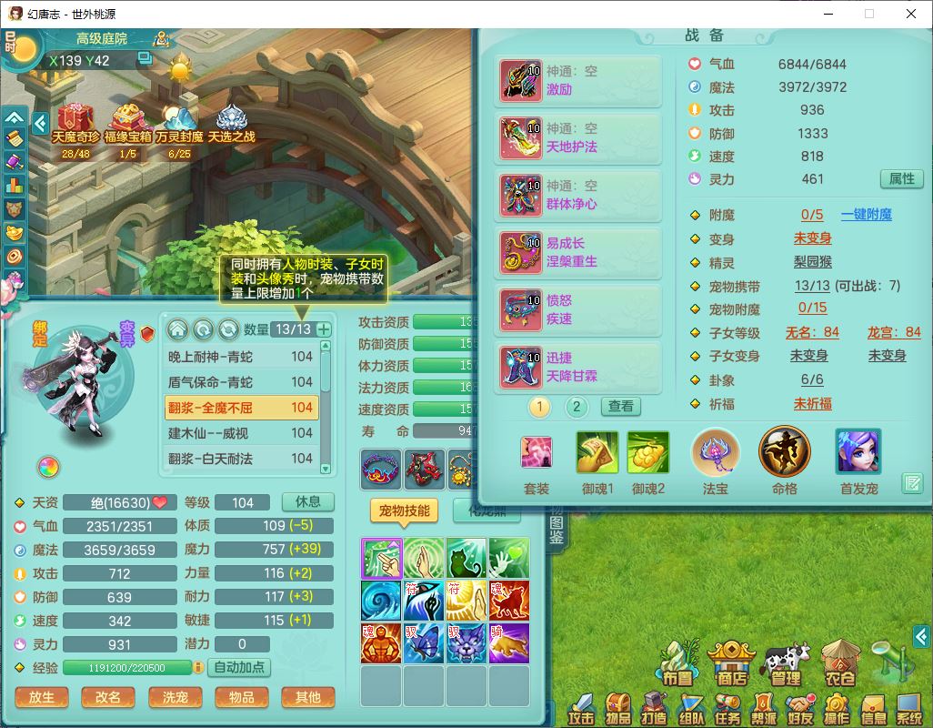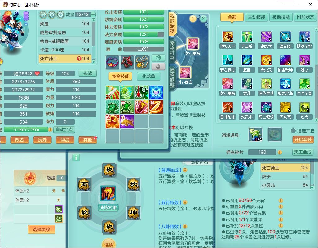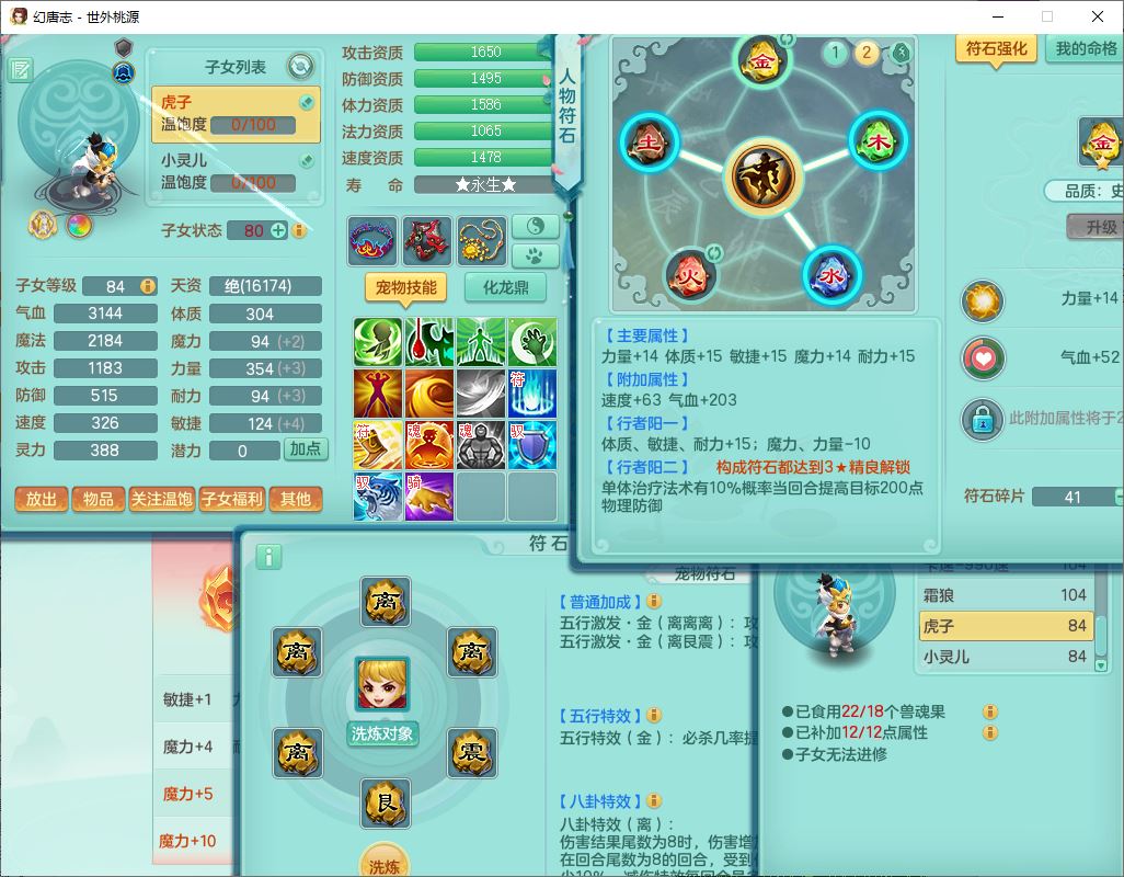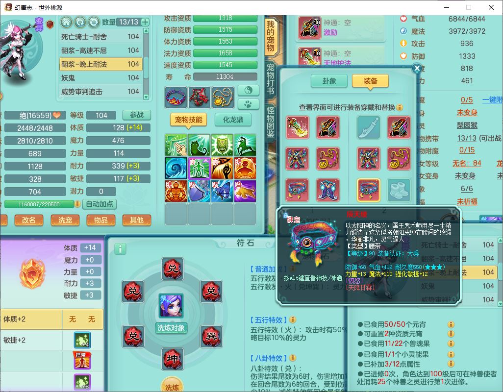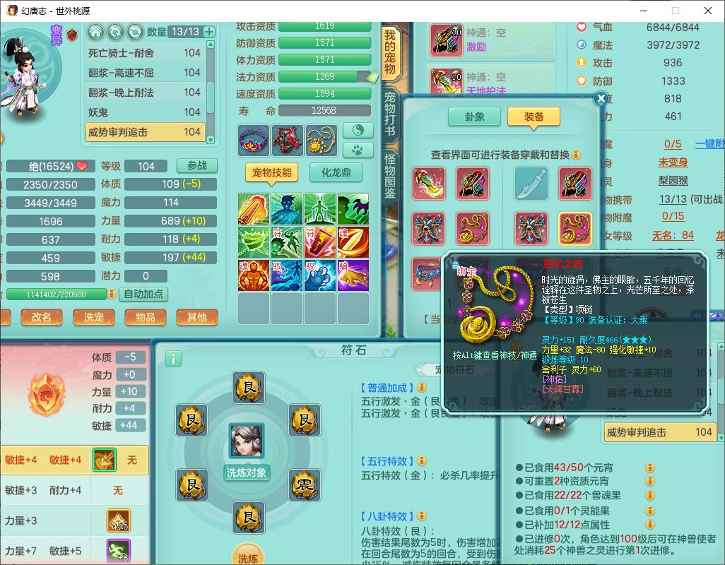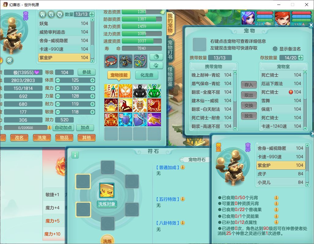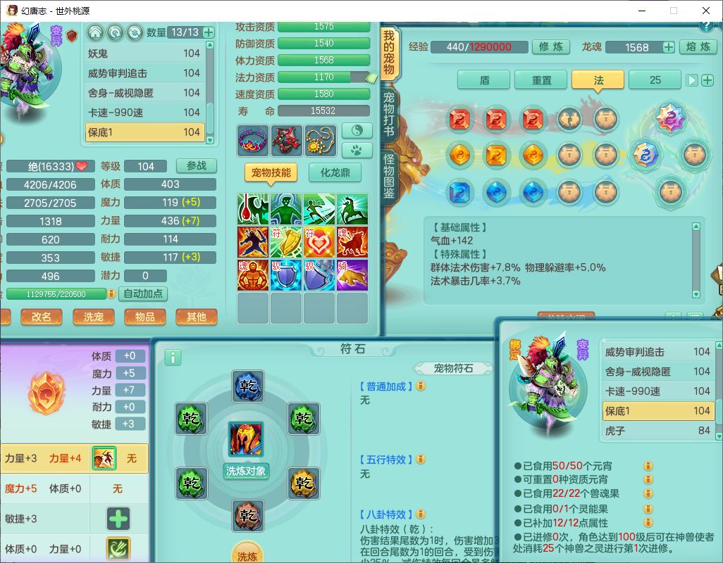 62431世外桃源99男方寸体敏、力体敏双精灵, 2内丹青蛇5翻江5舍身1七技能雷光妖鬼1金炉,4觉醒1宠皮5六字1五字11四字14只满果子,9红装备,Y慈航项链,愤怒疾速腰带,迅捷四海鞋子,有物理装备,崩山衣服,愤怒四海腰带,神佑四海项链,鼎2.5,2套符石,3坐骑(1双人飞行)