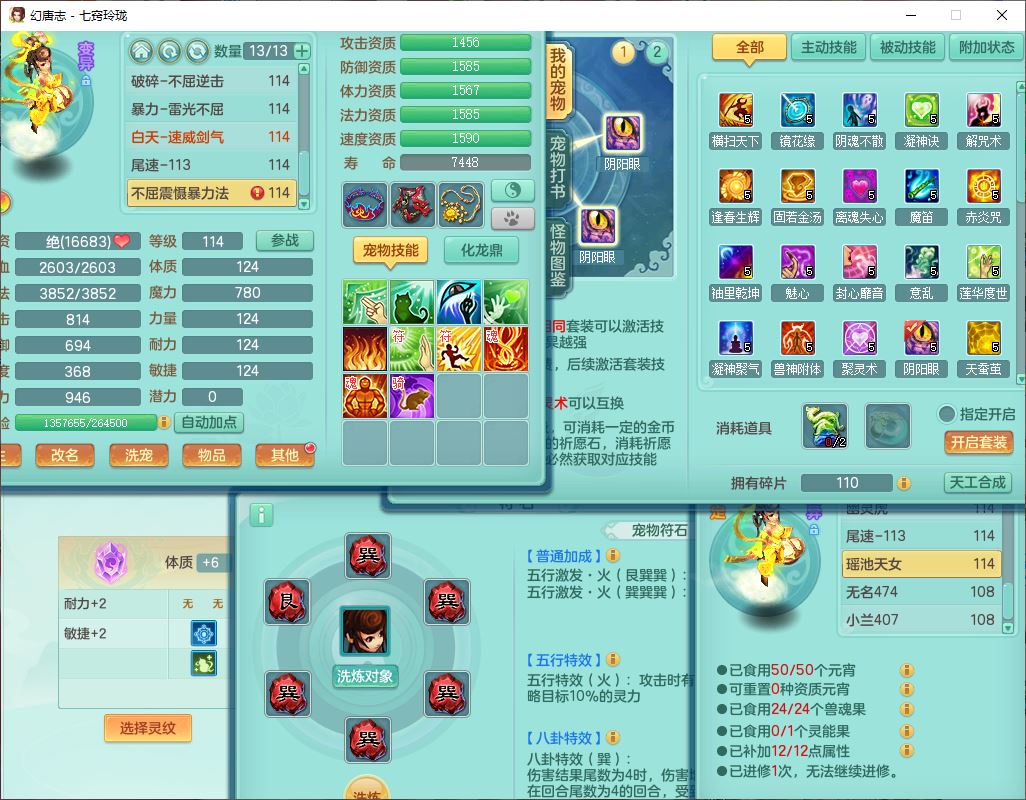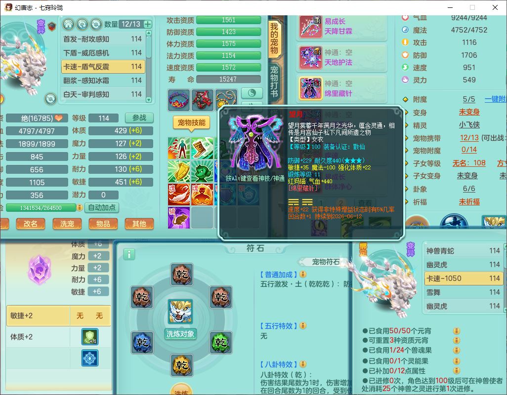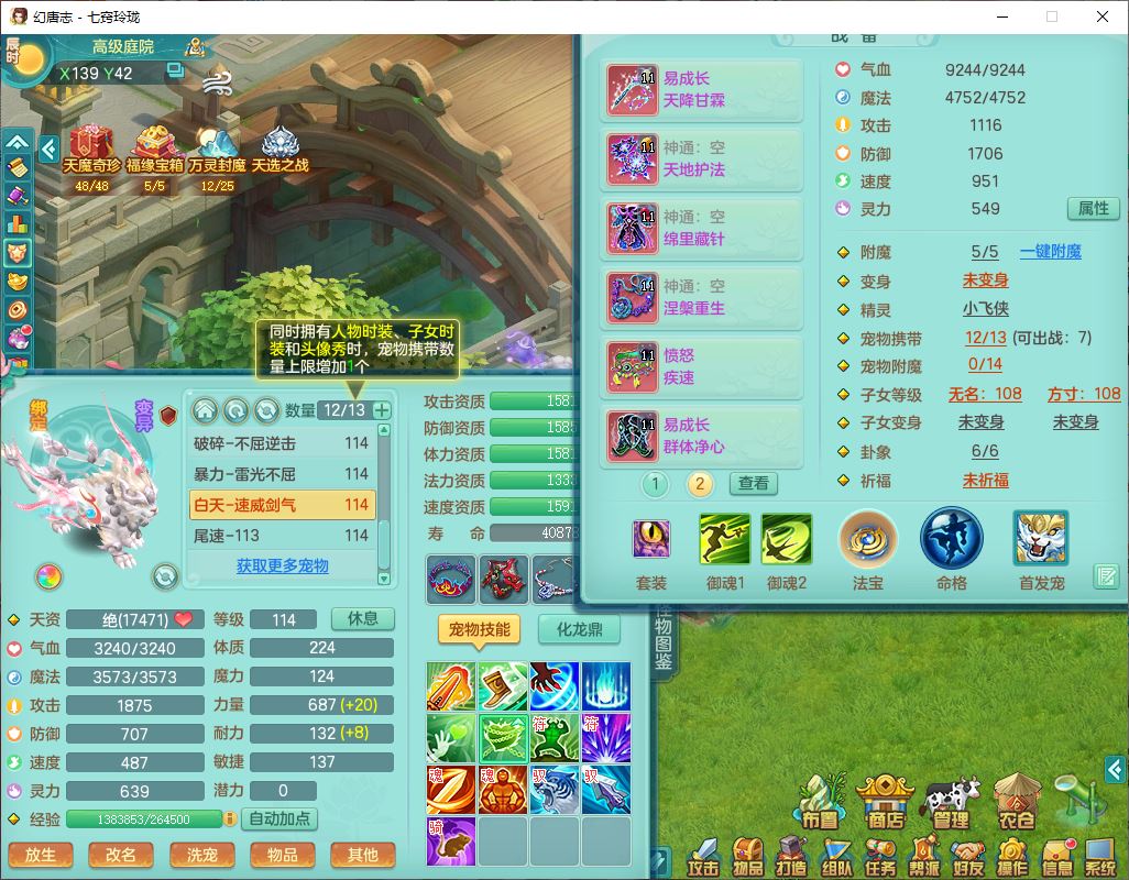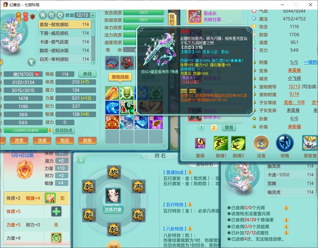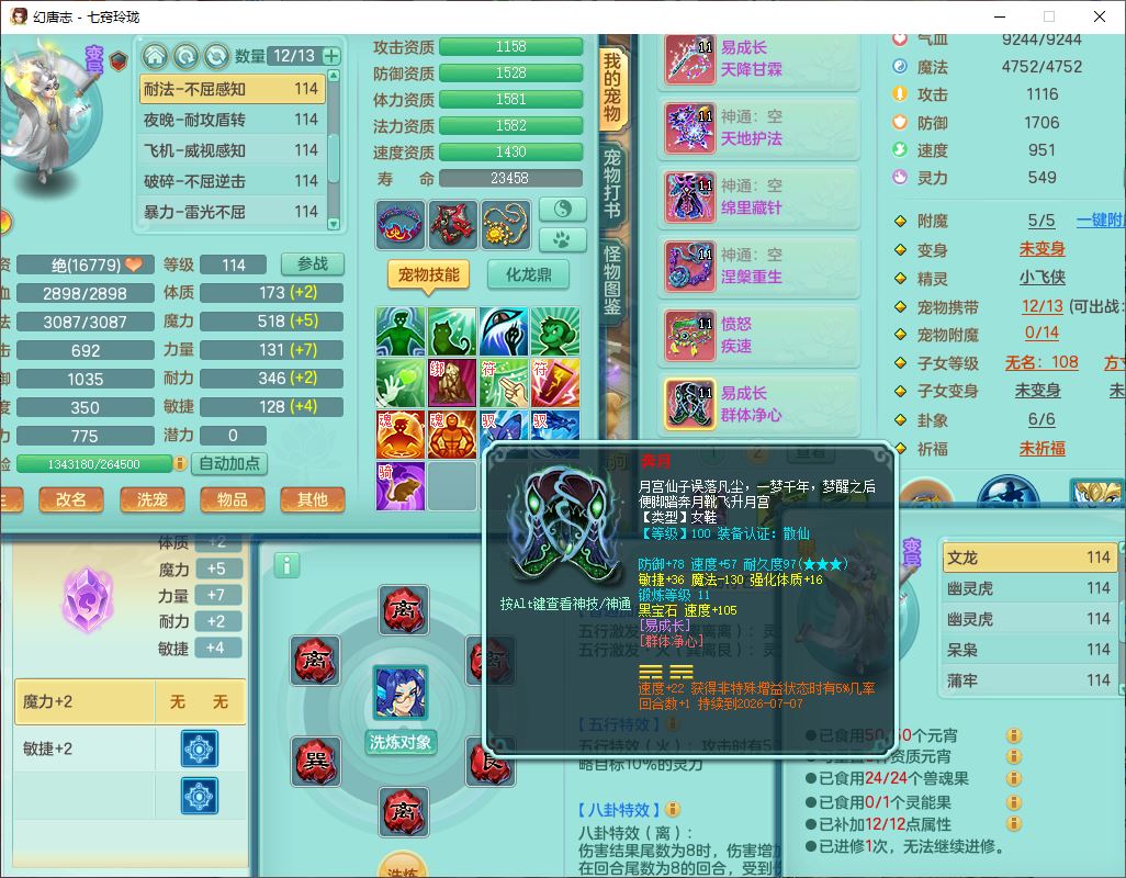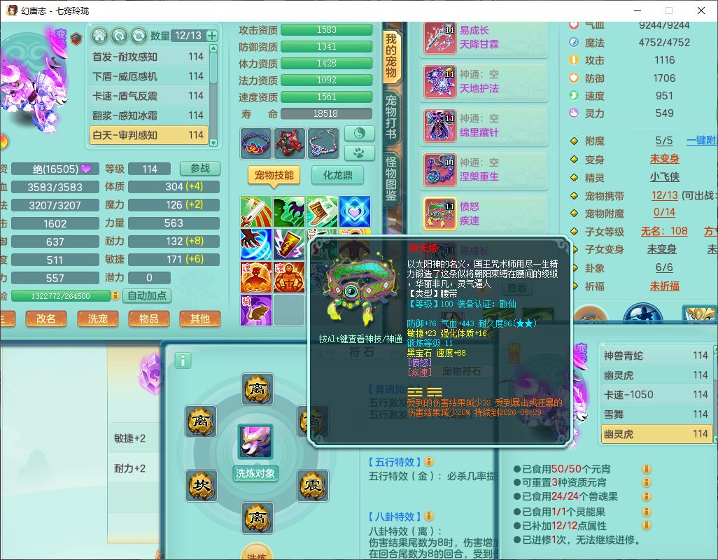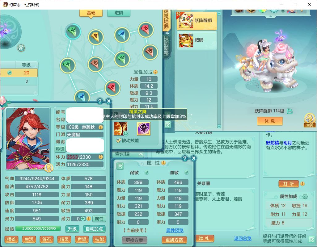 24288七窍玲珑109女天魔精灵舞,1内丹青蛇1羽袭1金炉8幽灵虎,2觉醒3宠皮1五字12四字综合12只满果子,9红装备,Y四海帽子,愤怒疾速腰带,Y晶清鞋子,鼎2.5+42,庭院160房屋150,永久外观、精灵皮肤,18个仙兽灵,31个内丹碎片,2坐骑(1双人)