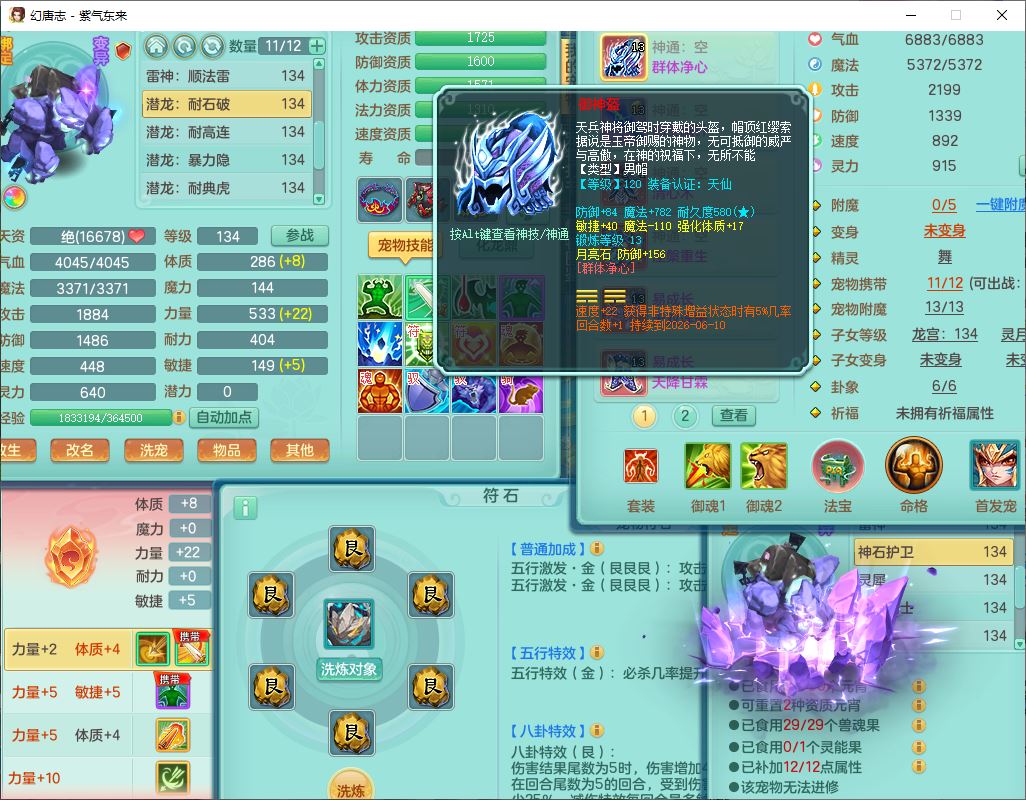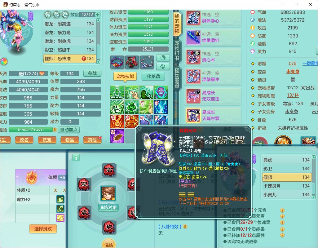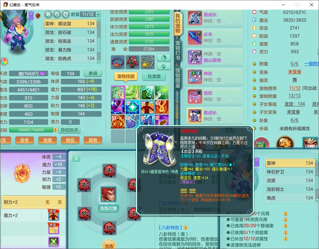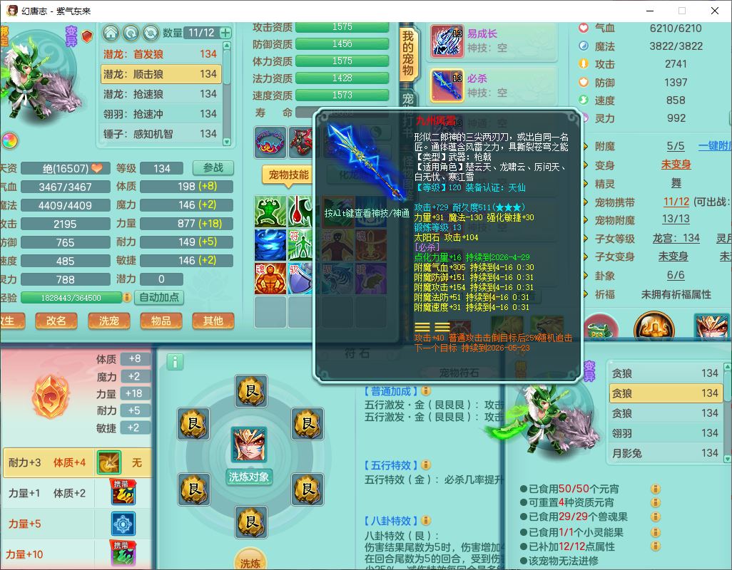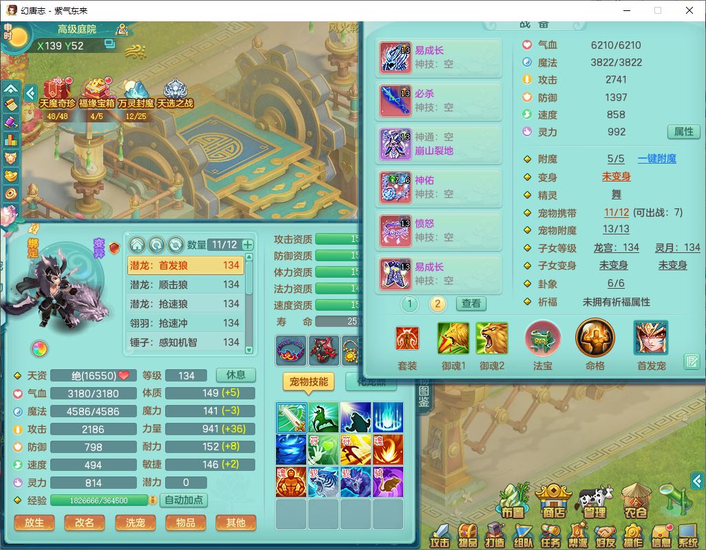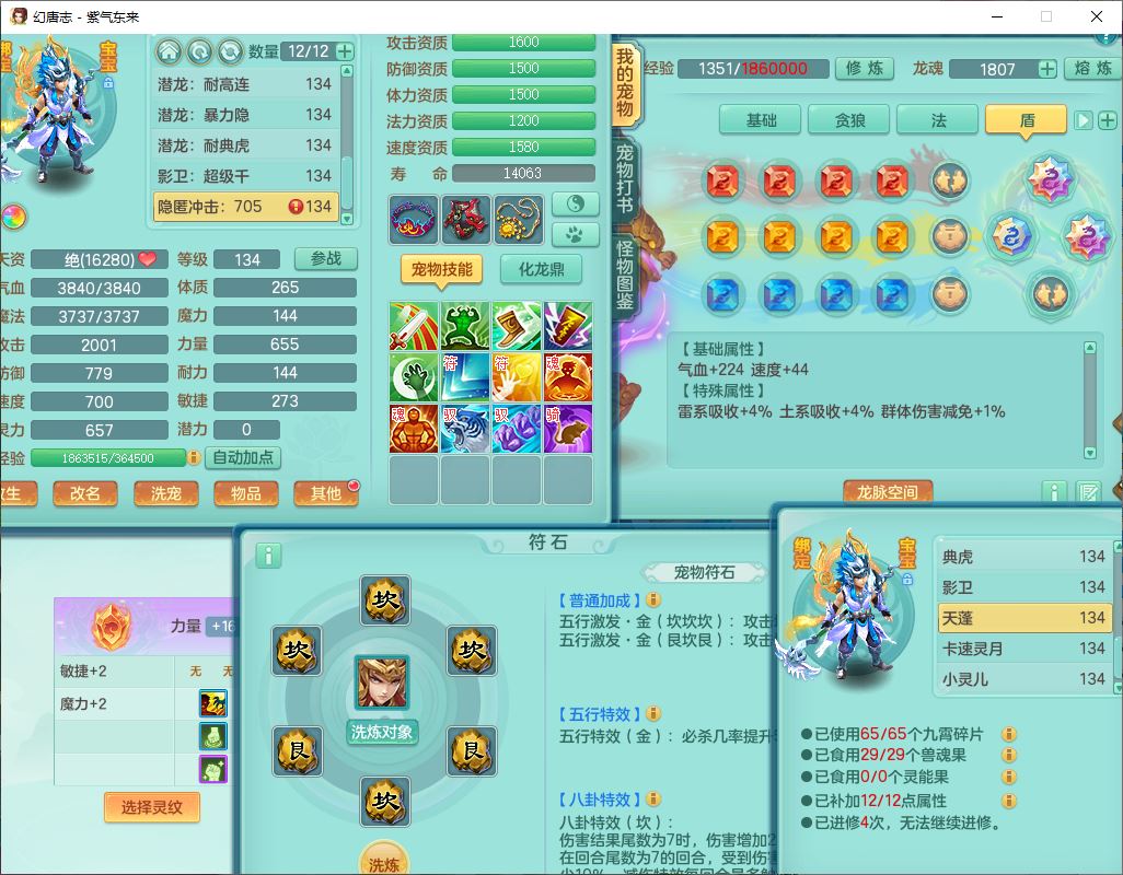24285紫气东来129男万兽【潜龙号】精灵舞,3贪狼1神石1典虎,7觉醒9六字1五字4四字15只满果子,装备齐全,必杀武器,崩山衣服,神佑项链,一套辅助装备,Y四海鞋子,鼎4.0+56+224,永久外观、精灵皮肤,76个仙兽灵,25个内丹碎片,仓库多存货,2坐骑(1双人飞行),带150奶粉