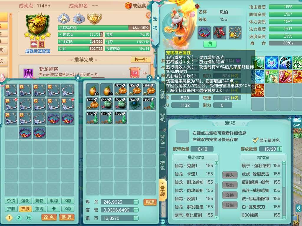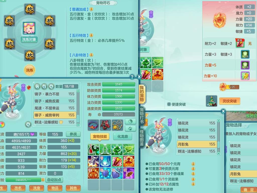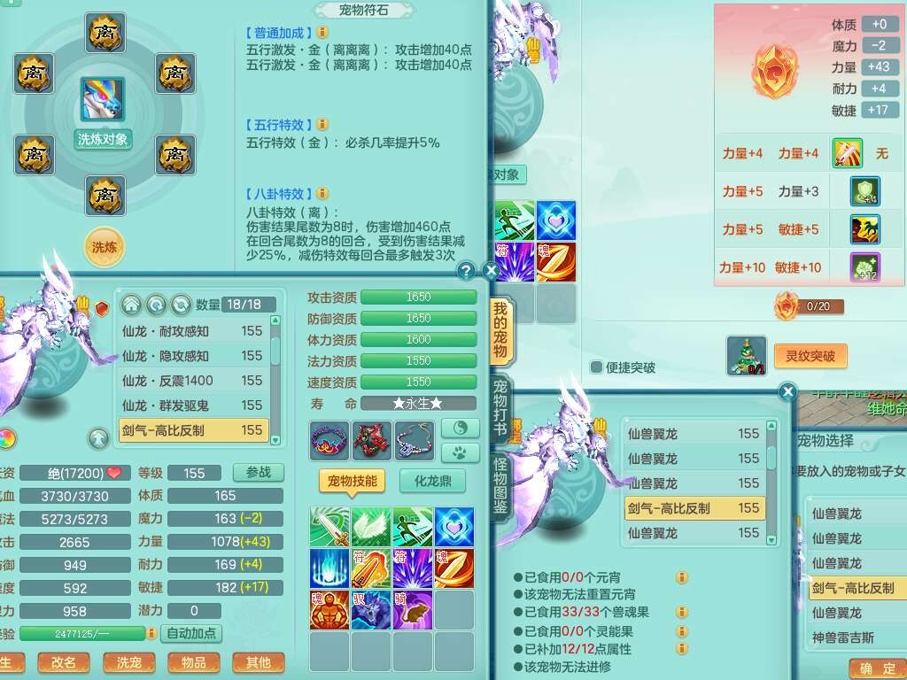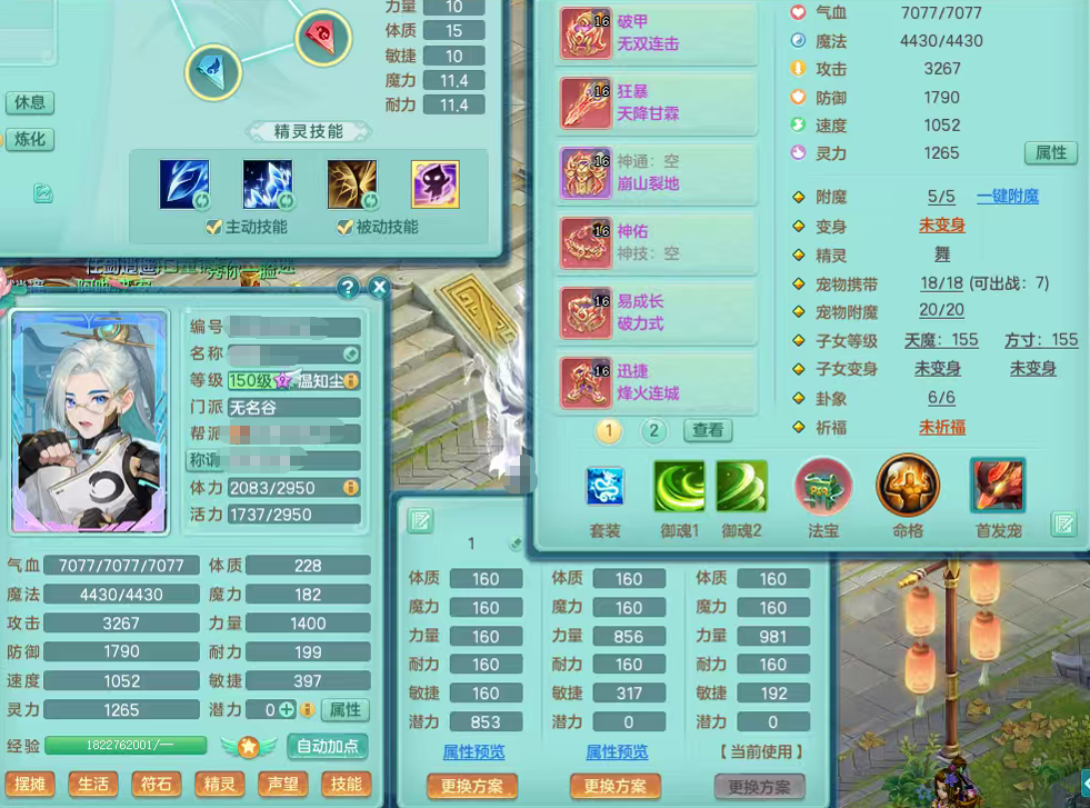 J22169紫气东来159男力天宫,已转无名谷,精灵舞,8龙2内胆神,1破镜,【13只觉醒,已潜龙】,8宠皮,5只六技能镜花灵,1只六技能龙姬,1特殊(虎虎),星辰之拥,破甲破血单加53头,934狂暴四海单加武器,崩山单加衣服,神佑单加52项链,易成长破力式单加51腰带,迅捷破血单加57鞋子,5.0基础鼎+70攻+280血,8.7法爆,15个格子,15个纯六字,1个五字,27只满果子,宠排在榜,经验修炼在榜,3个双人坐骑,暴龙洪荒+西瓜冰武器。