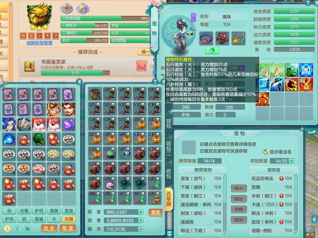 S22120扬名立万99男万兽,1龙1内胆神,10觉醒,1宠皮,易成长单加35头,553易成长单加武器,神佑幸运8项链,易成长愈命诀单加33腰带,幸运55破血单加32鞋子,有迅捷单加33鞋子,法爆单加35武器,2.5基础鼎+42攻,5个纯六字,2个五字,18只满果子,仓库还有28个果子,宠排在榜,3个孩子,双人坐骑,有55个仙兽蛋,36个神兽内丹碎片,2140金币,带29天月卡。➕156女普陀奶粉,1神兽,4.5基础鼎。