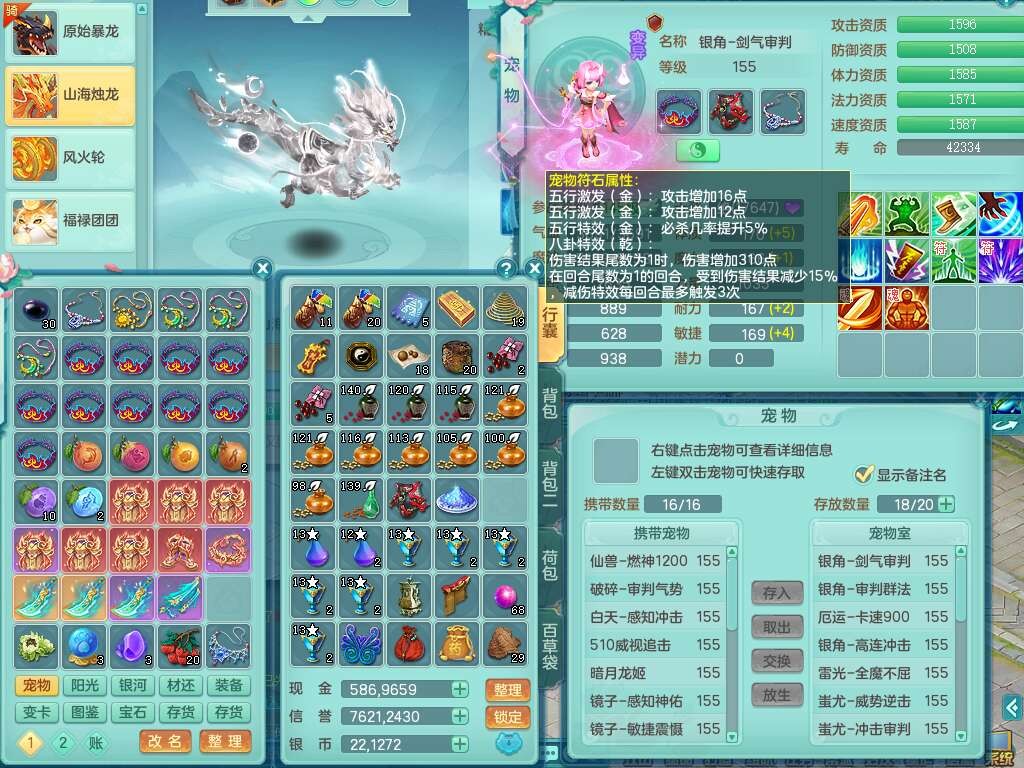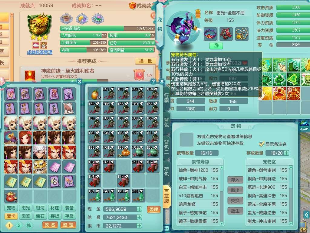 K22117超凡入圣159男天魔,精灵舞,1龙没内,1内胆神,10只觉醒,1宠皮,4只六技能镜花灵,1只6技能龙姬,愤怒单加56腰带,5.5基础鼎+70攻,14个格子,4个纯六字,3个五字,19只满果子,宠排在榜,3个坐骑,暴龙泰坦+逍客+西瓜冰,带115天月卡。