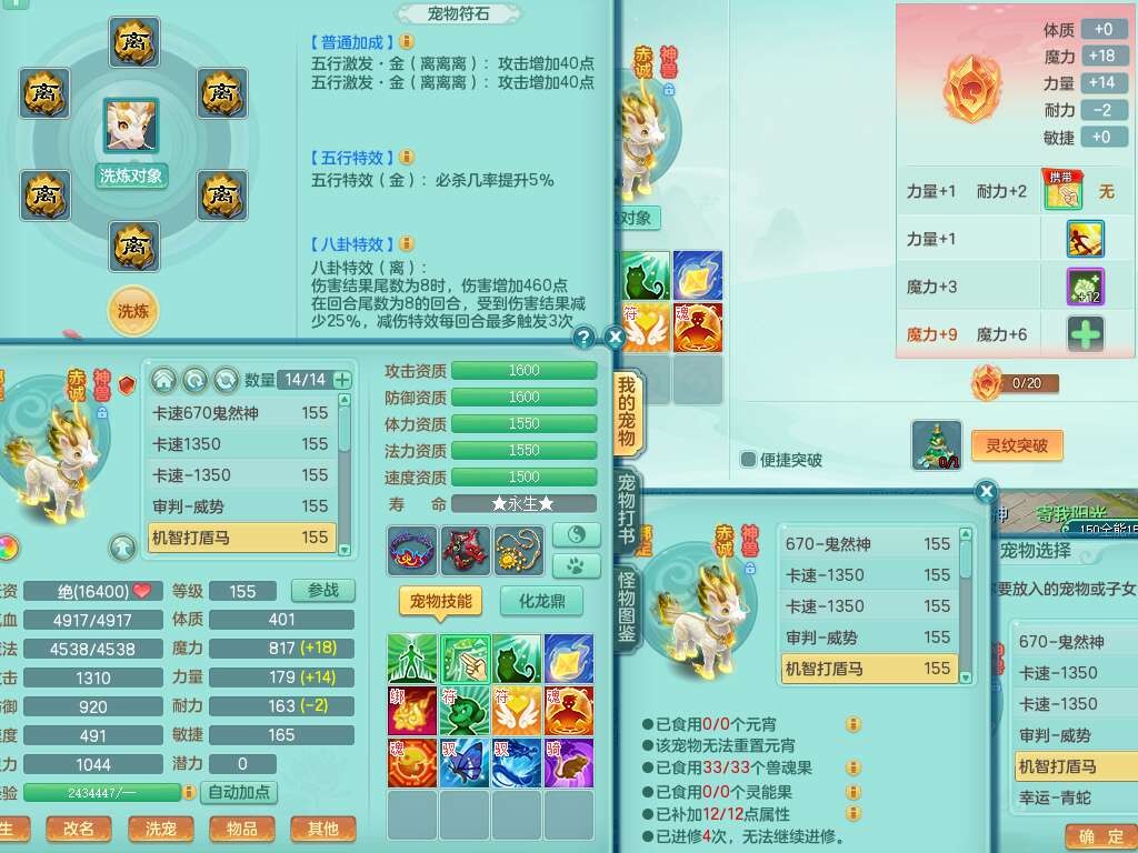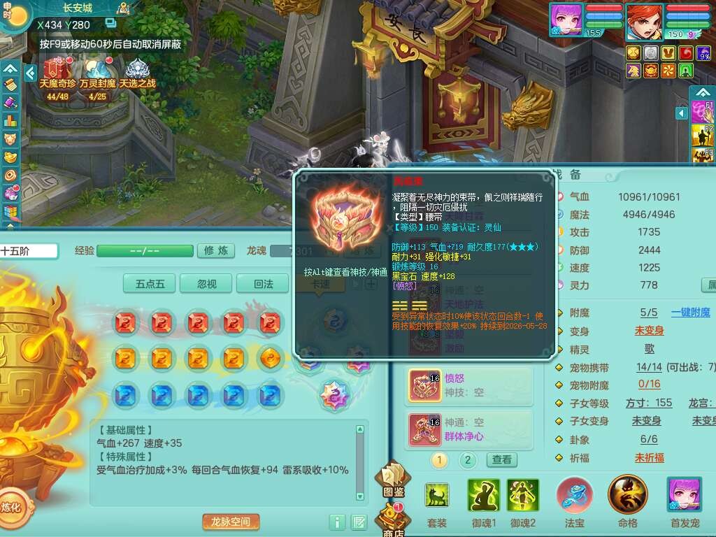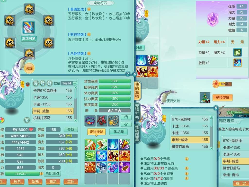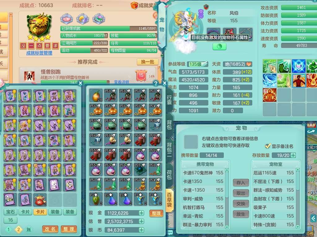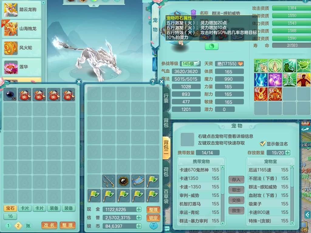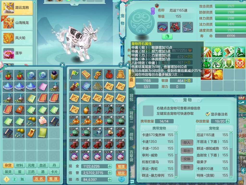 s22118今年勇159男无量,精灵歌,4龙(1龙无内),1内胆神,7只觉醒,5宠皮,4位靓号,5特殊(翻江,堕天,夺命,善恶,风卷),4只6技能镜花灵,2只6技能龙姬,回春愤怒5特,仓库有934狂暴单加武器,崩山裂地单加52衣服,神佑单加链子,破甲单加55鞋子,5.5基础鼎+70攻,7个纯六字,2个5字,综合15只满果子,仓库41神兽内丹碎片,4只坐骑,月卡还有41天。带4个150奶粉。