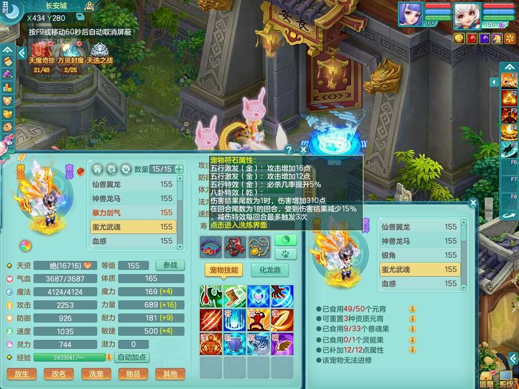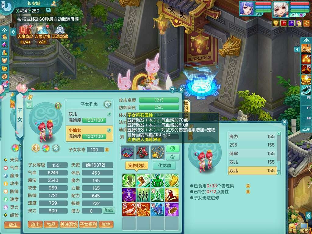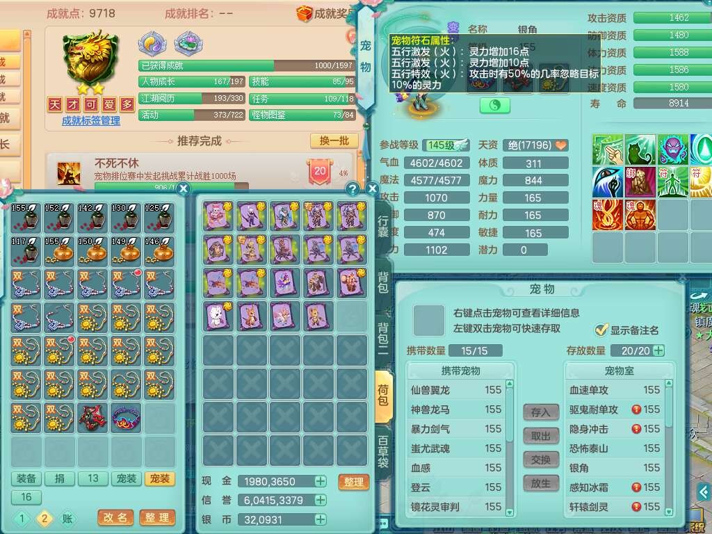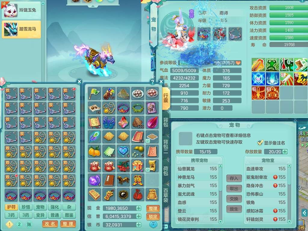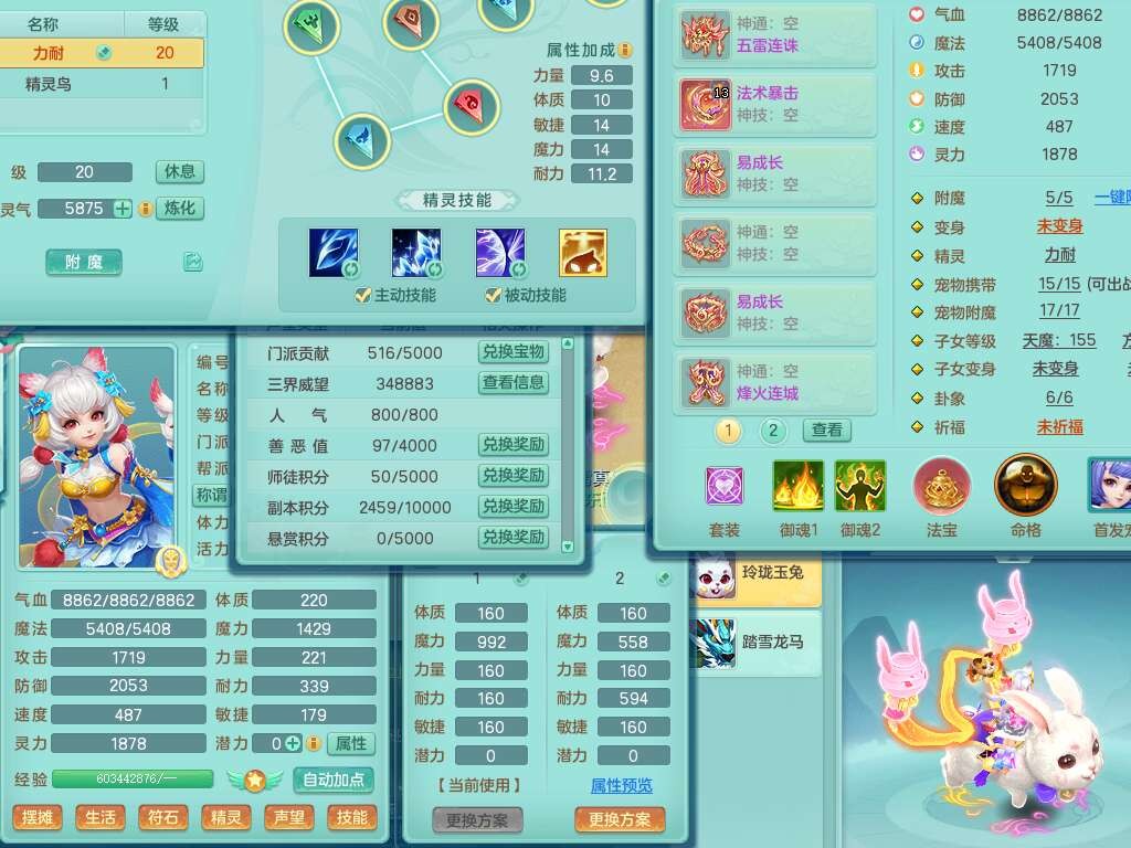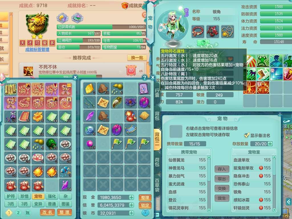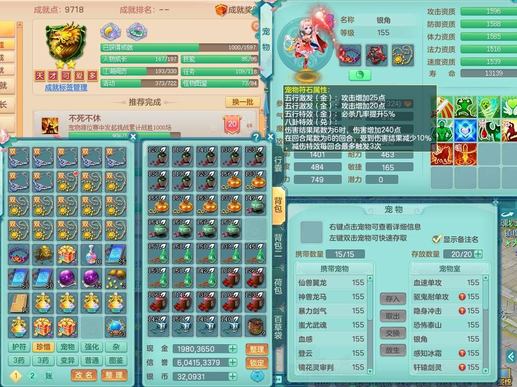 A22114七窍玲珑159女魔王,精灵歌,1龙1内胆神,4只觉醒,3只六技能镜花灵,2特殊(噬风,风卷),五雷单加55头,法爆单加56武器,易成长单加50衣服,易成长单加54腰带,烽火单加57鞋子,5.5基础鼎+70攻+280血,2个纯六字,1个五字,综合9只满果子,双人坐骑,带27天月卡。