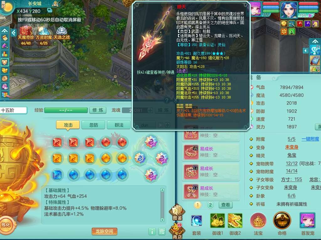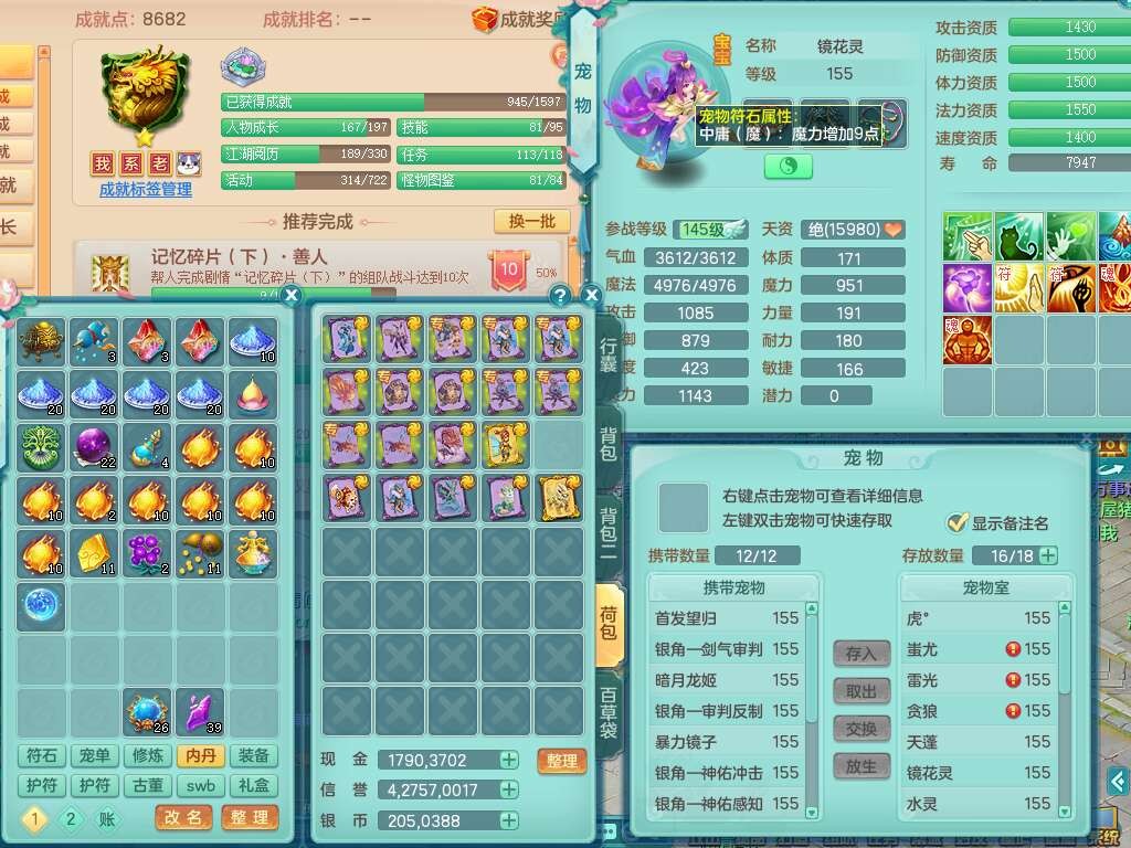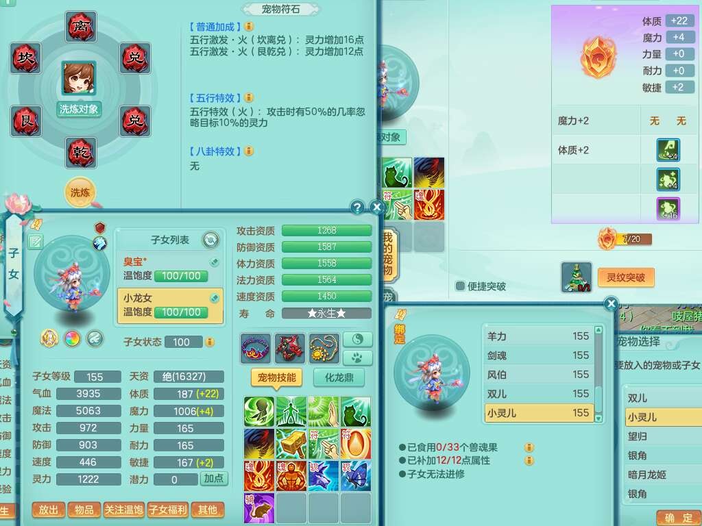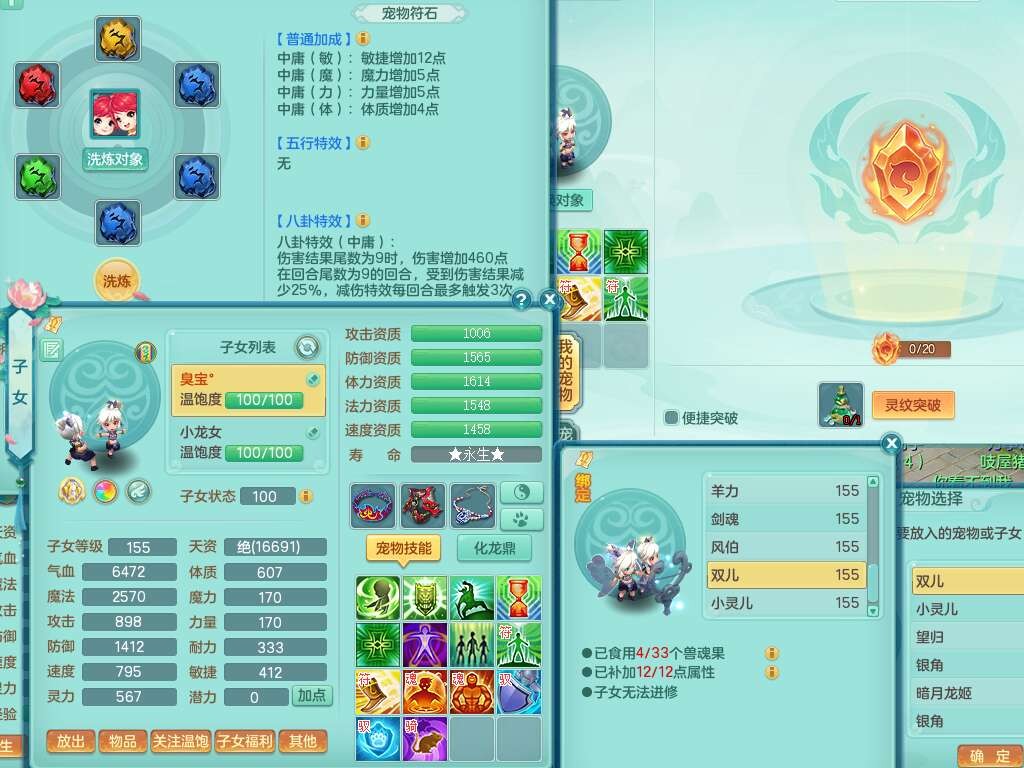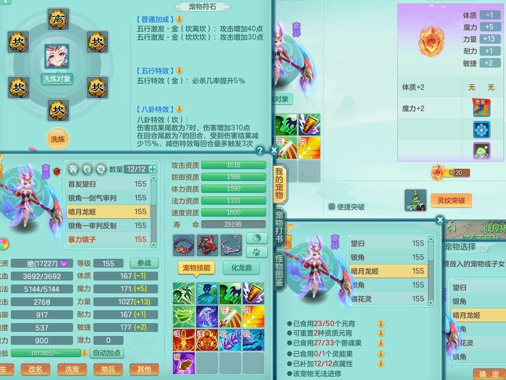 A22115风驰电掣159女龙宫,精灵歌,2只觉醒,2特殊(禁锢,舍身),1只6技能镜花灵,1只6技能龙姬,五雷头,921击退单加武器,4件易成长全高单加,4.5基础鼎,8只满果子,仓库39神兽内丹碎片,26仙兽蛋,带二百万银币,月卡还有30天。