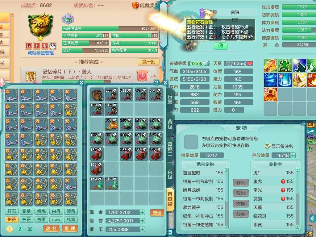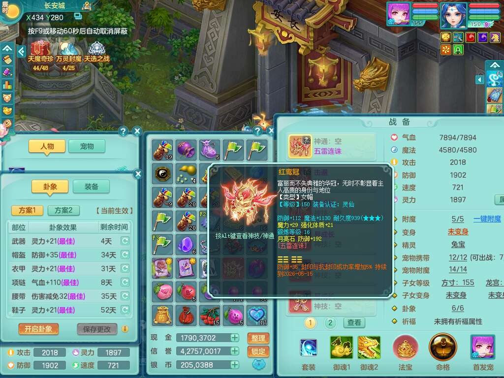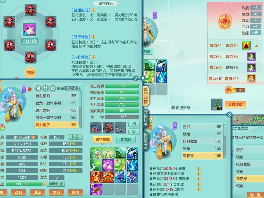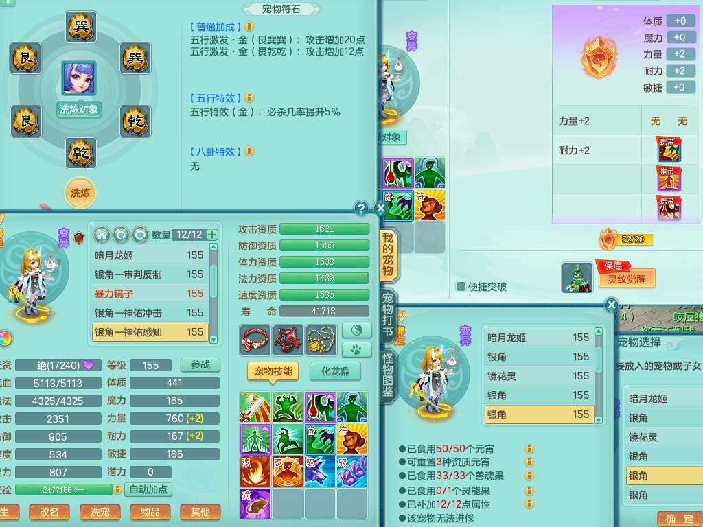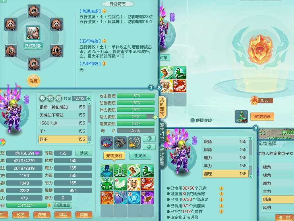 A22115风驰电掣159女龙宫,精灵歌,2只觉醒,2特殊(禁锢,舍身),1只6技能镜花灵,1只6技能龙姬,五雷头,921击退单加武器,4件易成长全高单加,4.5基础鼎,8只满果子,仓库39神兽内丹碎片,26仙兽蛋,带二百万银币,月卡还有30天。