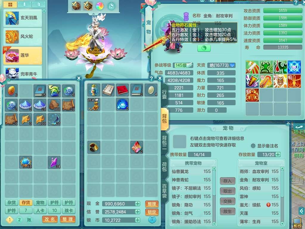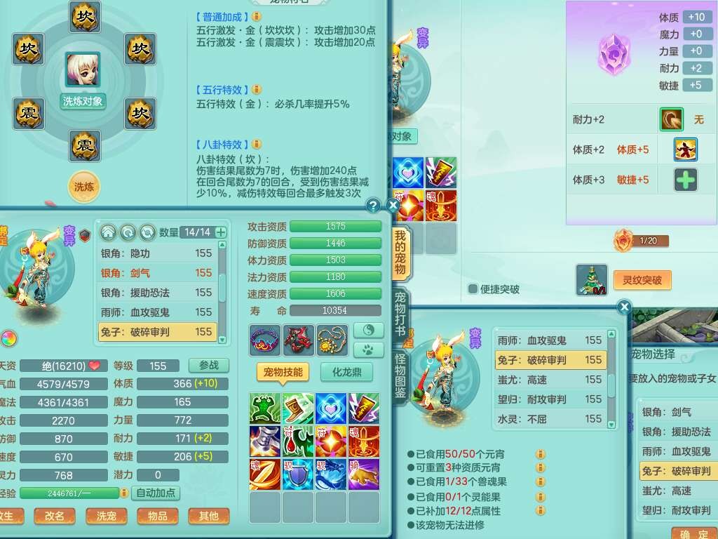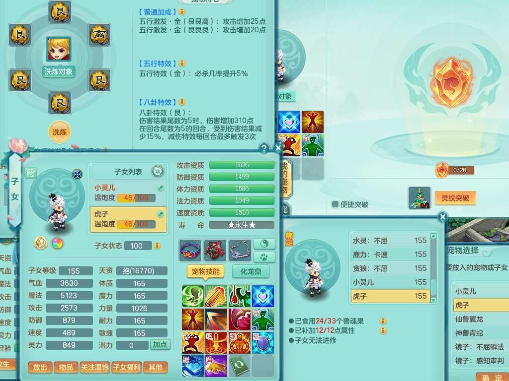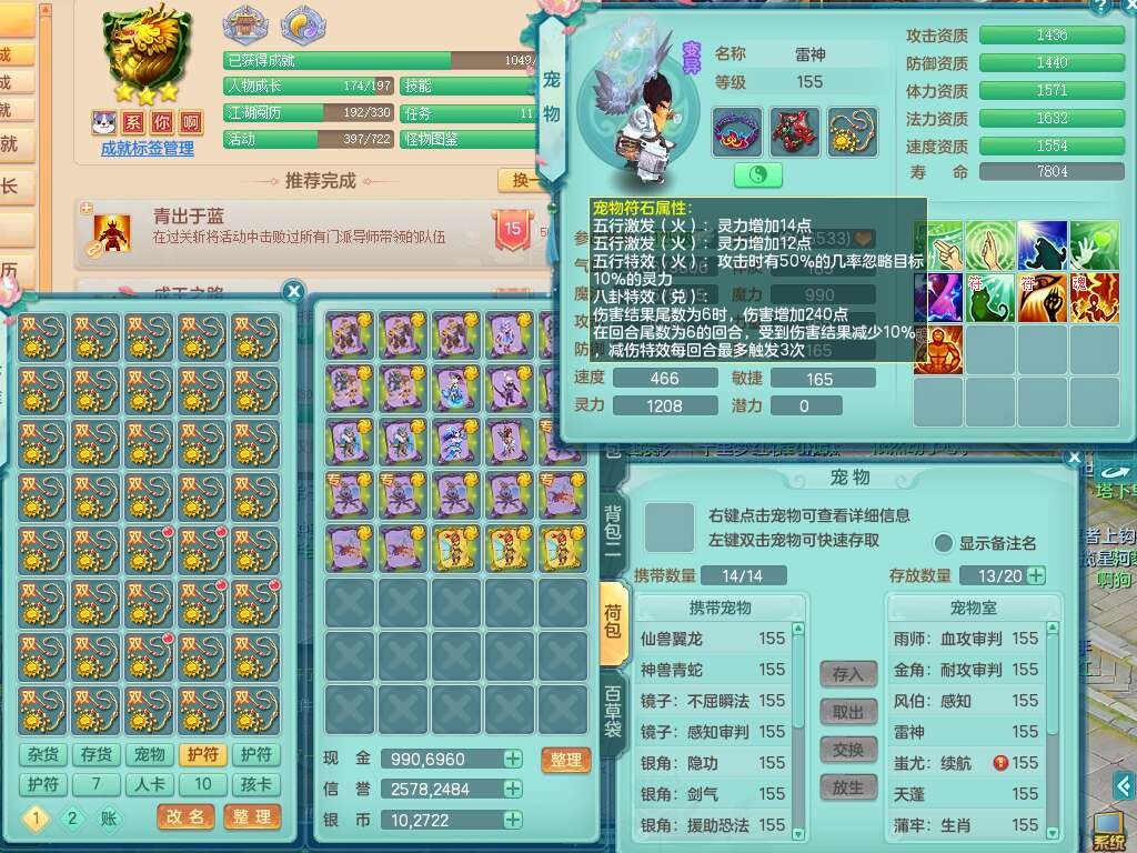 p22097今年勇159男龙宫,精灵歌,1龙,1觉醒,1宠皮,2只六技能镜花灵,法爆单加55武器,易成长单加衣服,272烽火单加56链子,有易成长单加57鞋子,2个五字,4只满果子,双人坐骑,68个仙兽蛋,34个神兽内丹碎片,冰晶庭院。➕159男万兽奶粉,1神兽,1觉醒,易成长笑里单加57头,930必杀武器,神佑链子,易成长单加57鞋,4.5基础鼎,双人坐骑。
