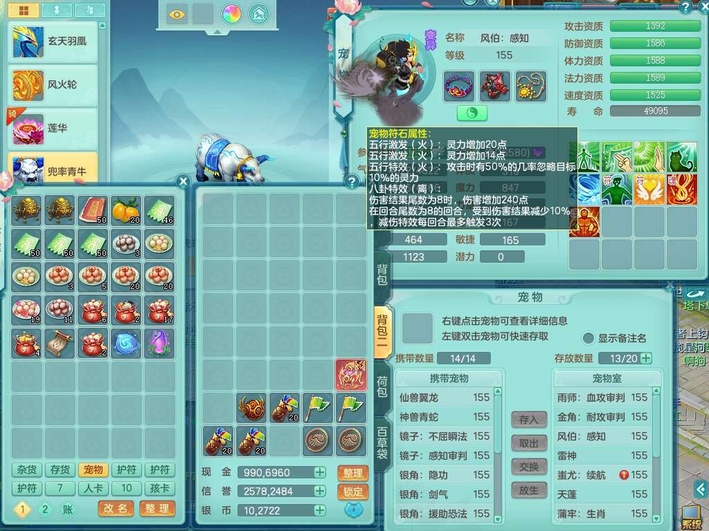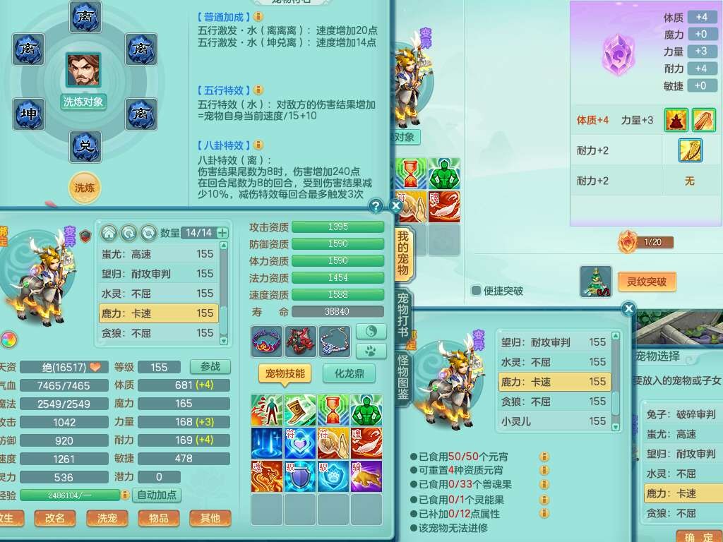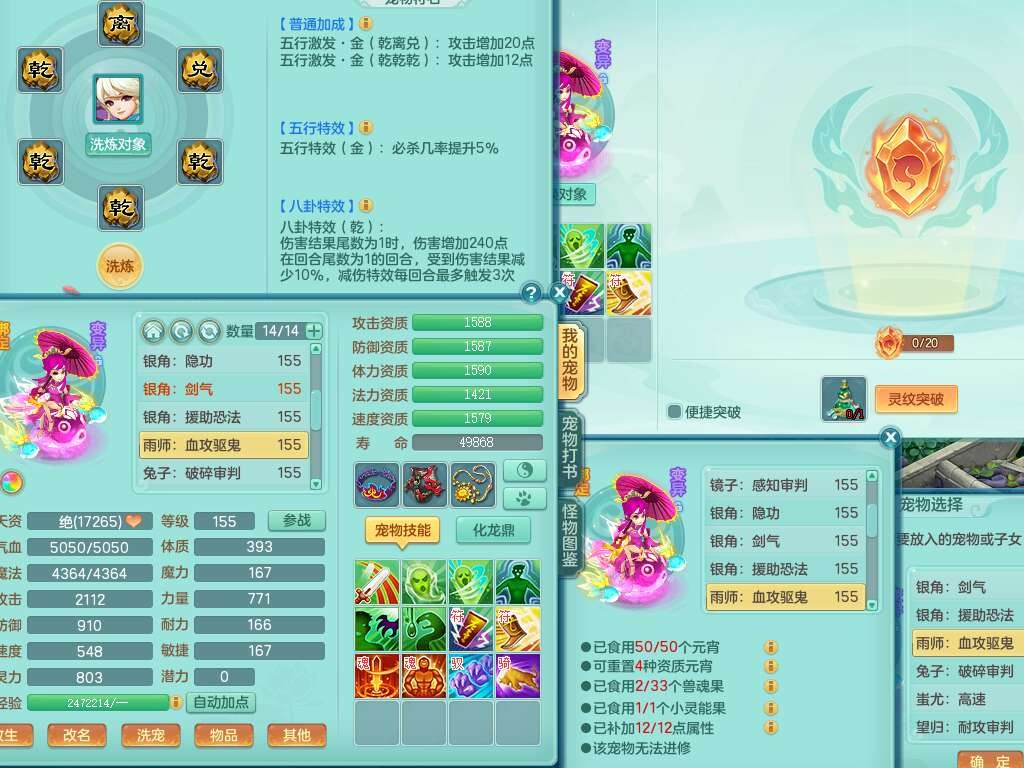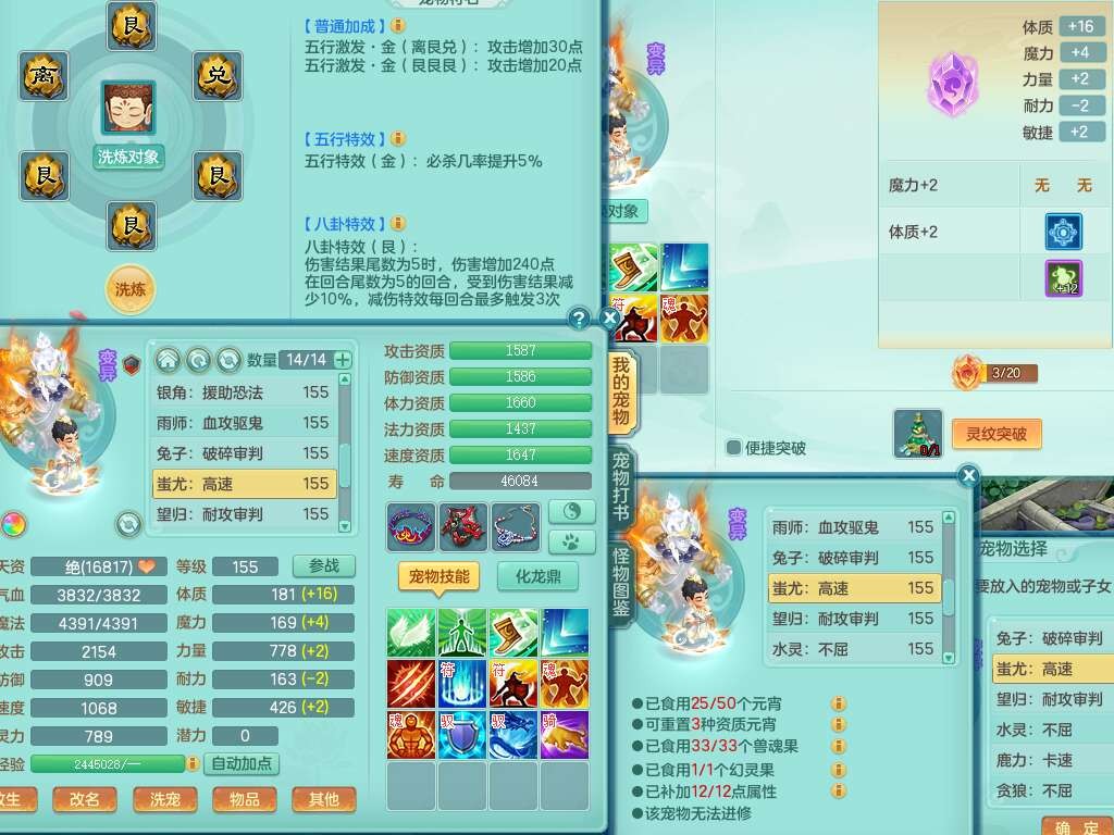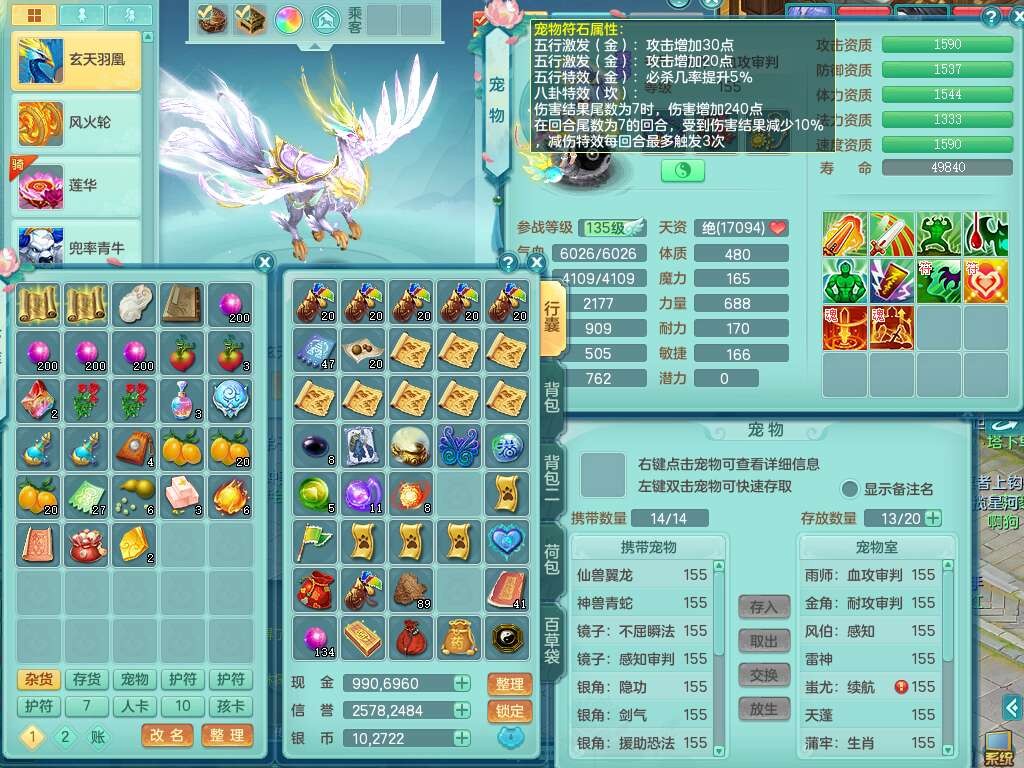 p22097今年勇159男龙宫,精灵歌,1龙,1觉醒,1宠皮,2只六技能镜花灵,法爆单加55武器,易成长单加衣服,272烽火单加56链子,有易成长单加57鞋子,2个五字,4只满果子,双人坐骑,68个仙兽蛋,34个神兽内丹碎片,冰晶庭院。➕159男万兽奶粉,1神兽,1觉醒,易成长笑里单加57头,930必杀武器,神佑链子,易成长单加57鞋,4.5基础鼎,双人坐骑。