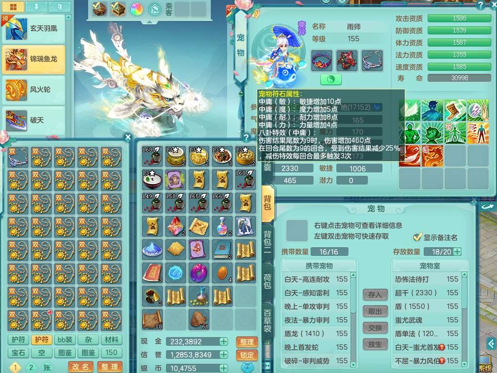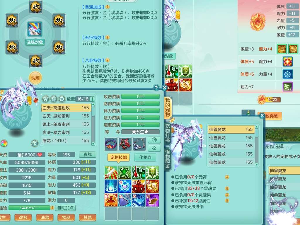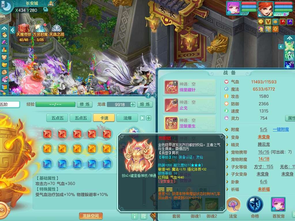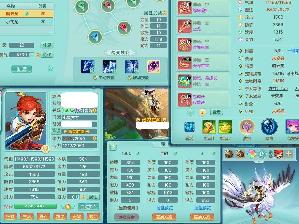 A22102龙腾九州159男方寸,精灵舞,5龙2内胆神,【10觉醒,已潜龙】,4位靓号不含4,2宠皮,4特殊(剑胆,藕断,上善,雷利),3只六技能镜花灵,1只六技能龙姬,愤怒易成长单加腰带,五特,5.5基础鼎+70攻+280血,14个永久格子,10个纯六字,1个五字,19只满果子,仓库还有35个果子,宠排在榜,经验在榜,永久称谓,2只双人坐骑,24天月卡。