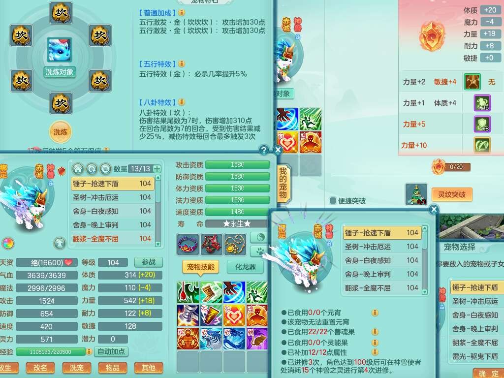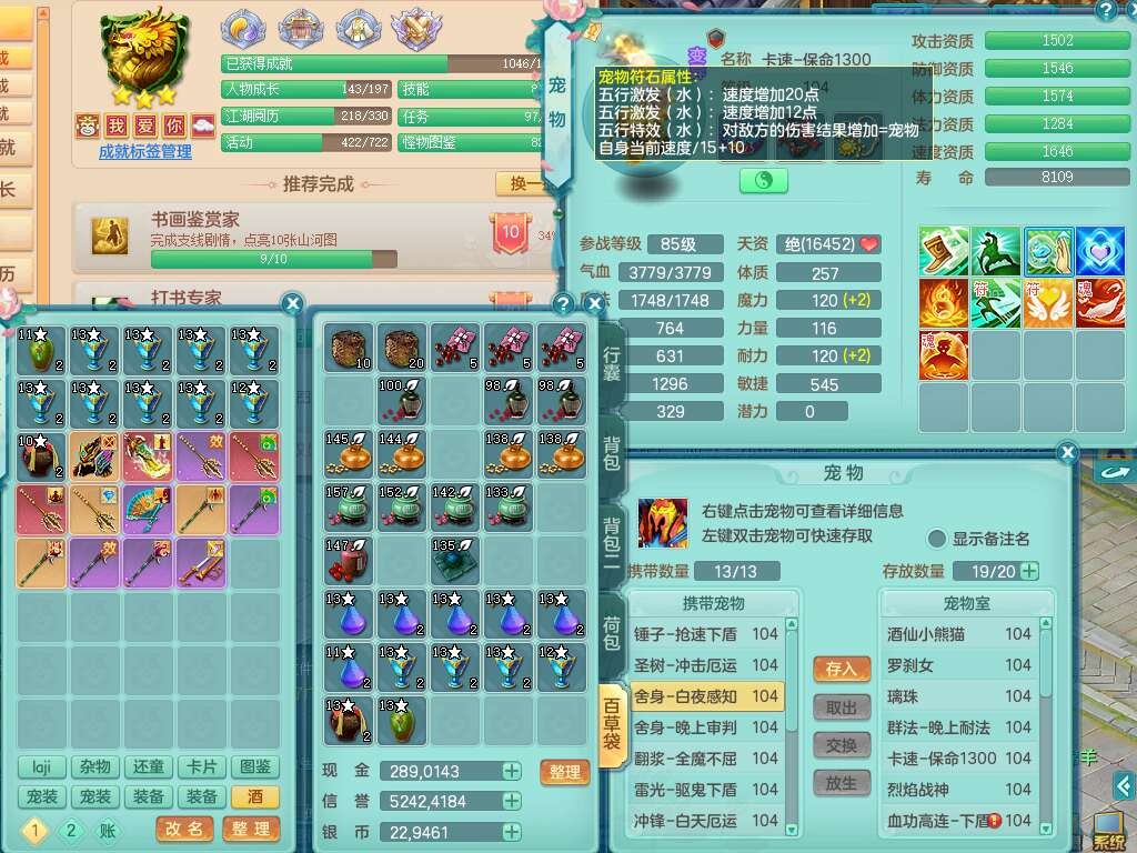 p22095今年勇99男盘丝,1内胆神,6只觉醒(准潜龙,宝宝只差1觉醒,符石差2个附加),易成长疾速单加34头,易成长天地护法单加34武器,易成长止戈单加32衣服,坚毅魔音摄心项链,愤怒晶清腰带,易成长四海单加31鞋子,六特,有555易成长群体止戈单加31武器,556易成长单加32武器,崩山单加32衣服,法爆慈航单加33武器,五雷单加32头,2.5基础鼎+42攻+168血,7个纯六字,15只满果子,宠排在榜,双人坐骑,27个仙兽蛋,55天月卡。➕99女万兽奶粉,神佑单加34链子,破甲单加31鞋。