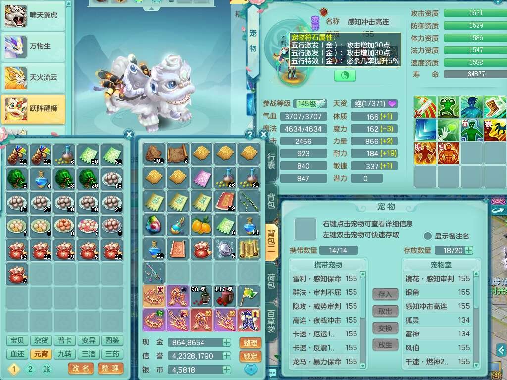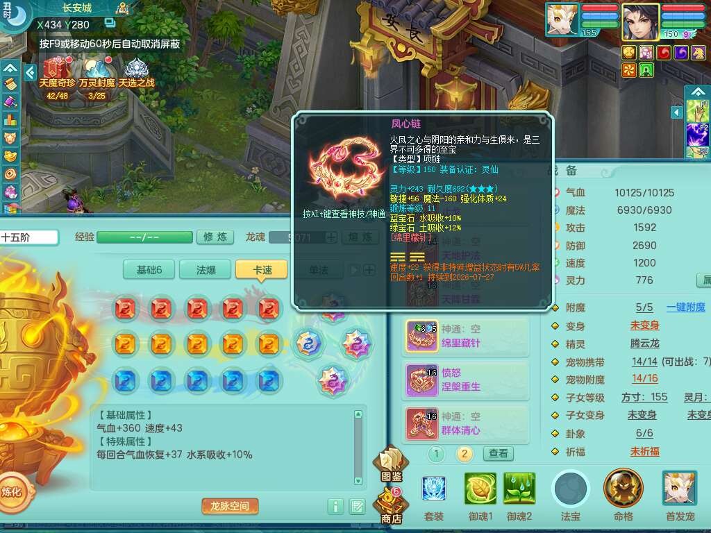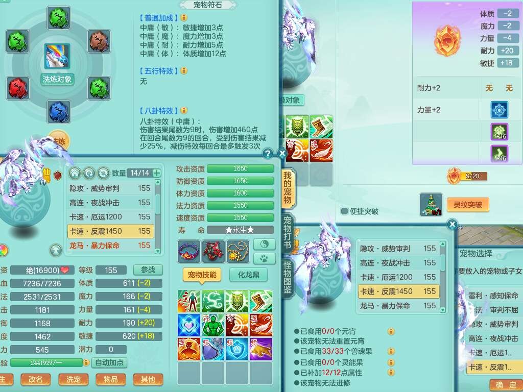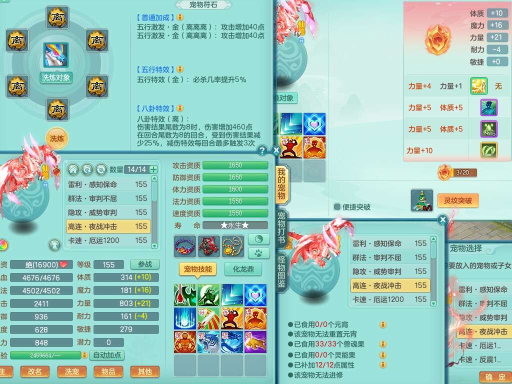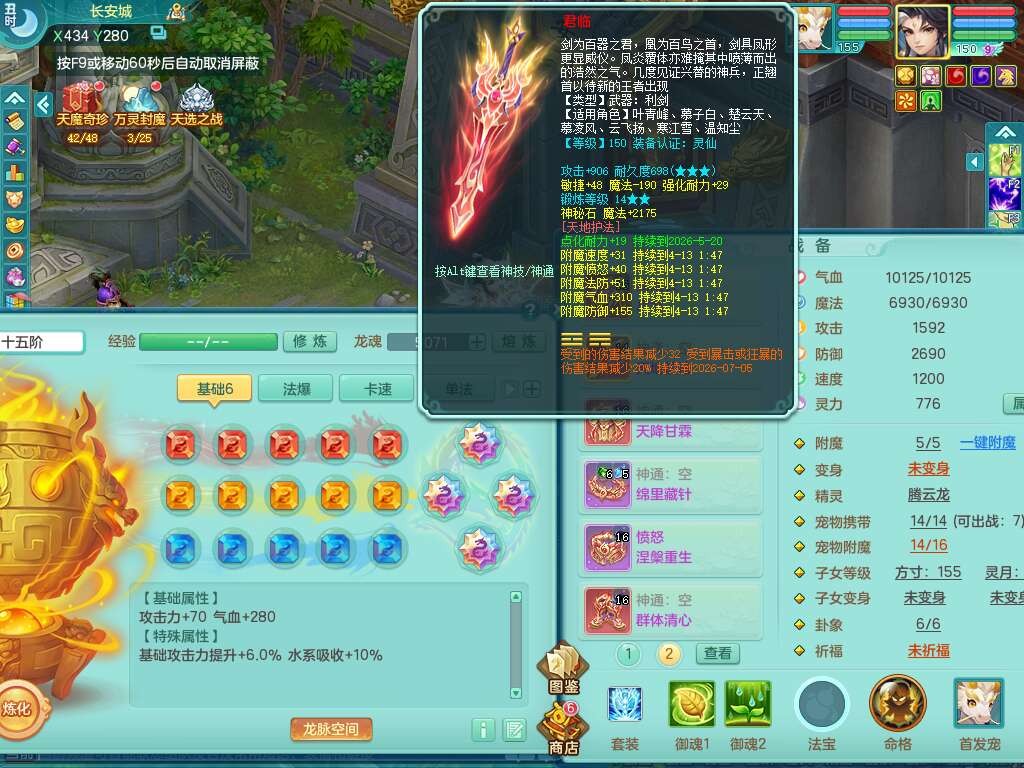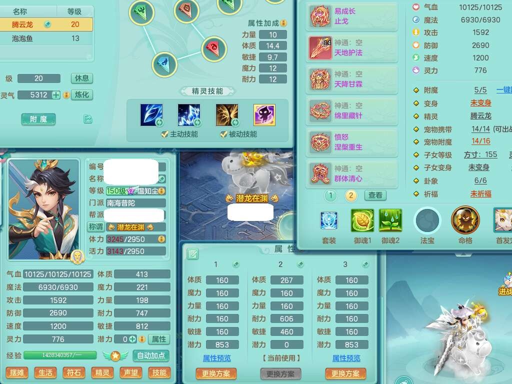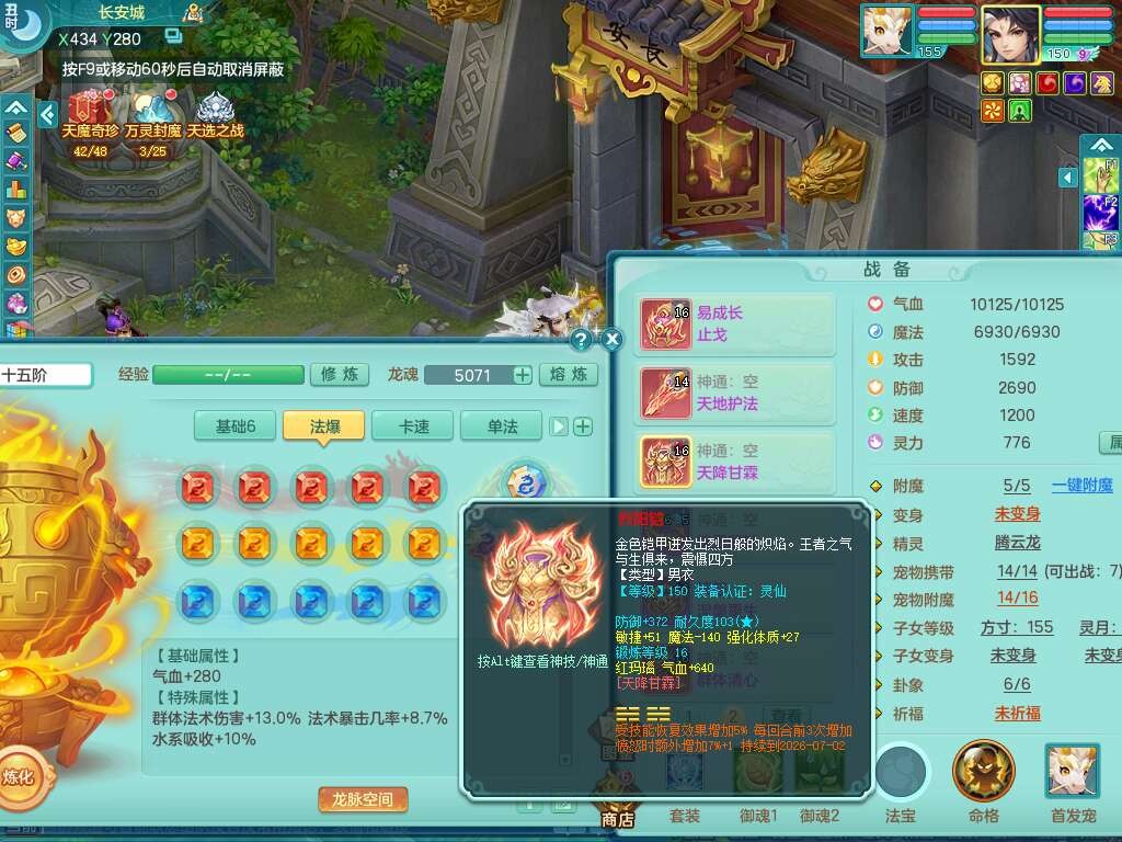 A22103彩云追月159男普陀,精灵舞,6龙4内胆神,3破镜,【12只觉醒,已潜龙】,2宠皮,1特殊(青霜),2只六技能龙姬,4只六技能镜花灵,愤怒六特,有把极品必杀五雷单加55武器,6.0基础鼎+70攻+280血,8.7法爆,2套符石,7个纯六字,4个五字,21只满果子,仓库还有157个果子,宠排在榜,7个坐骑,神驹心想事成+马上发财+火焰之力,月卡还有124天。