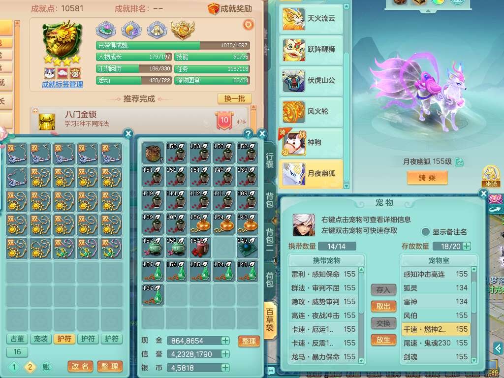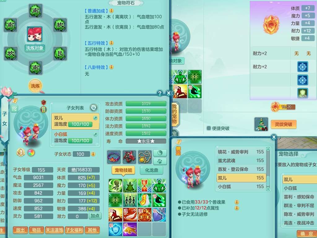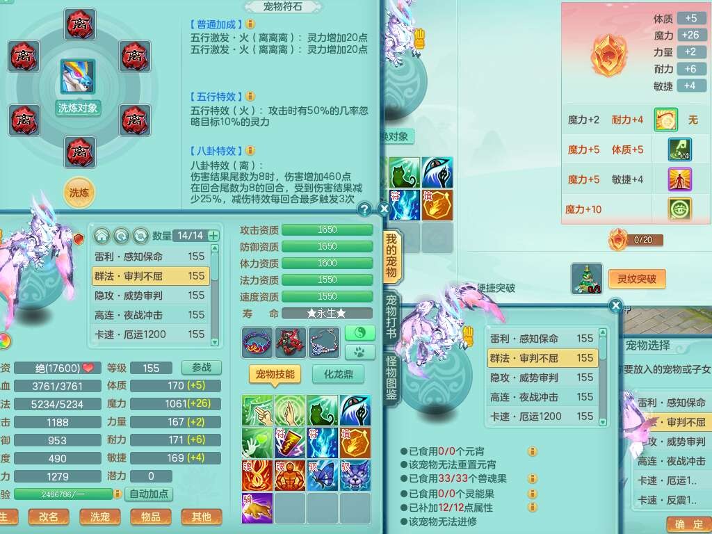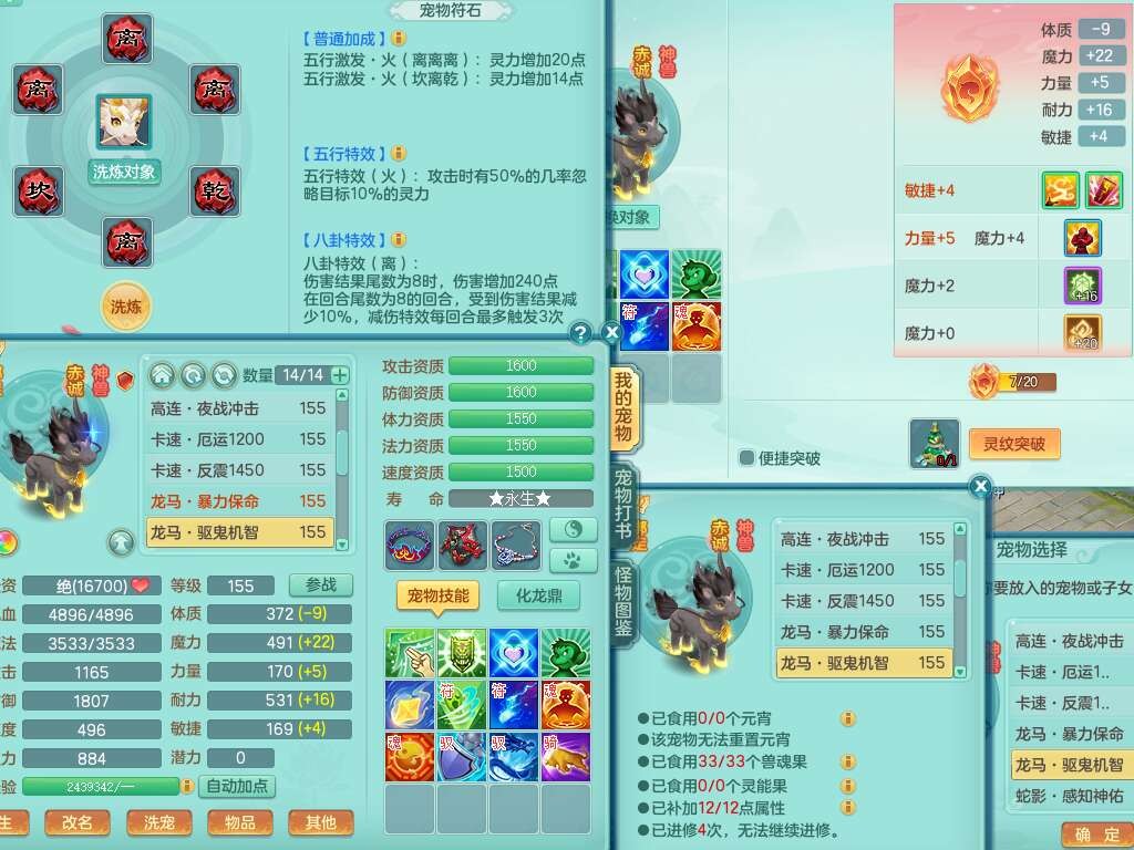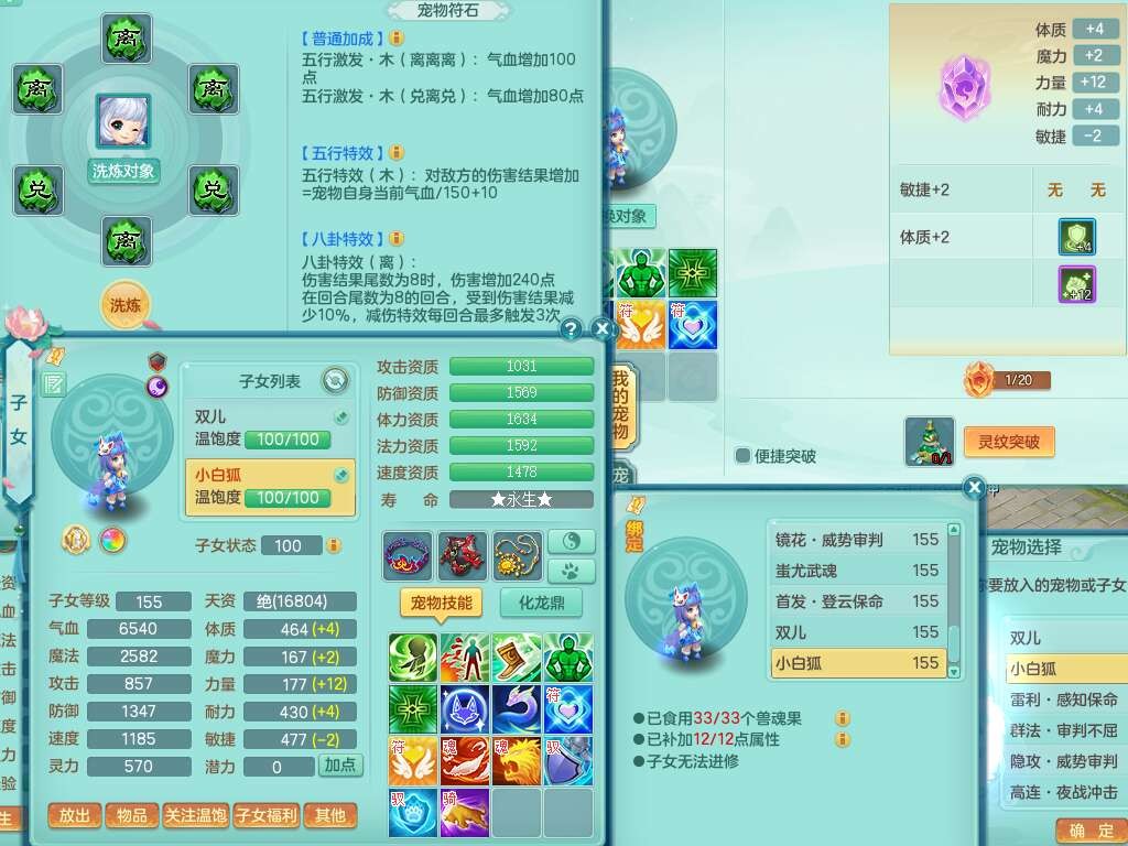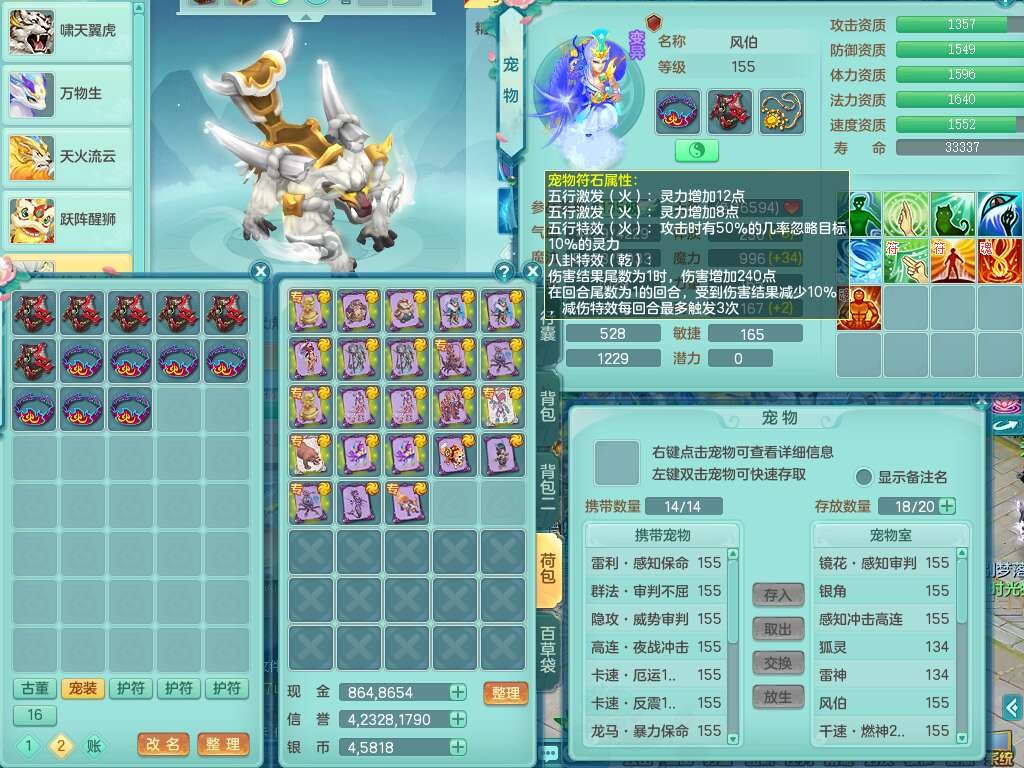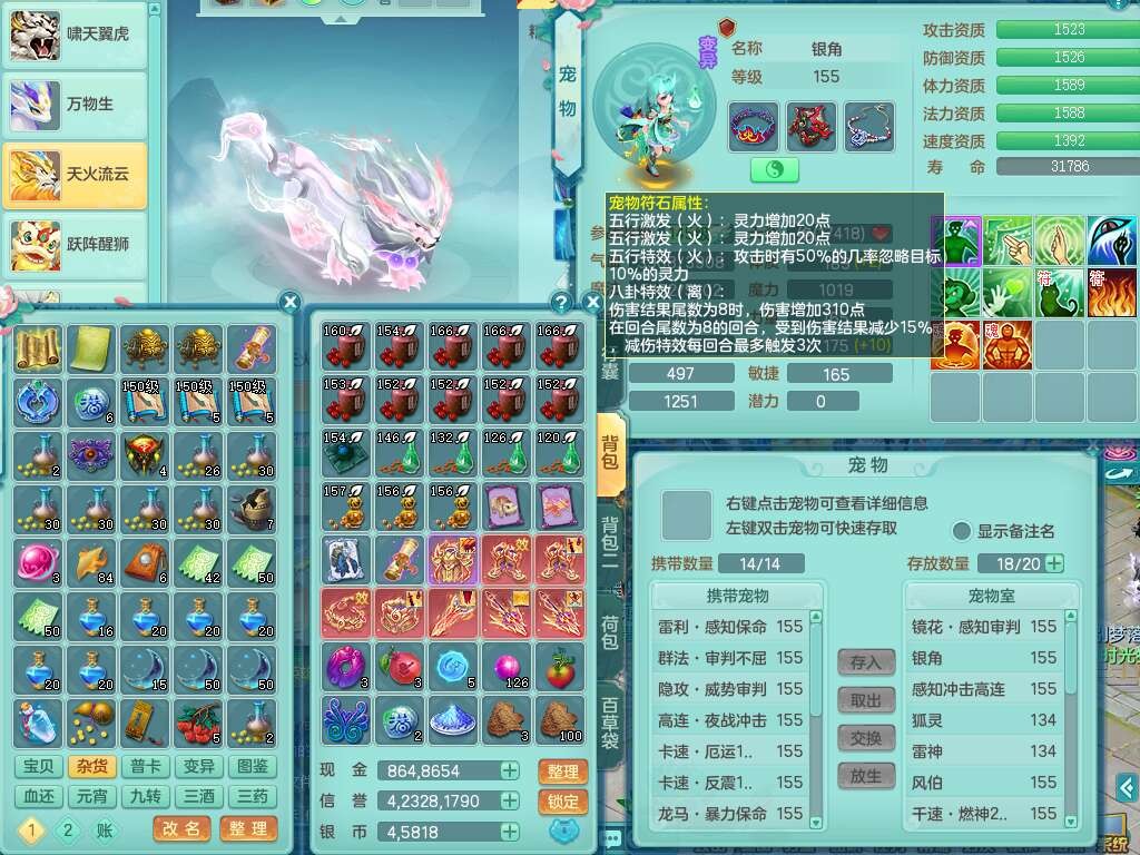 A22103彩云追月159男普陀,精灵舞,6龙4内胆神,3破镜,【12只觉醒,已潜龙】,2宠皮,1特殊(青霜),2只六技能龙姬,4只六技能镜花灵,愤怒六特,有把极品必杀五雷单加55武器,6.0基础鼎+70攻+280血,8.7法爆,2套符石,7个纯六字,4个五字,21只满果子,仓库还有157个果子,宠排在榜,7个坐骑,神驹心想事成+马上发财+火焰之力,月卡还有124天。