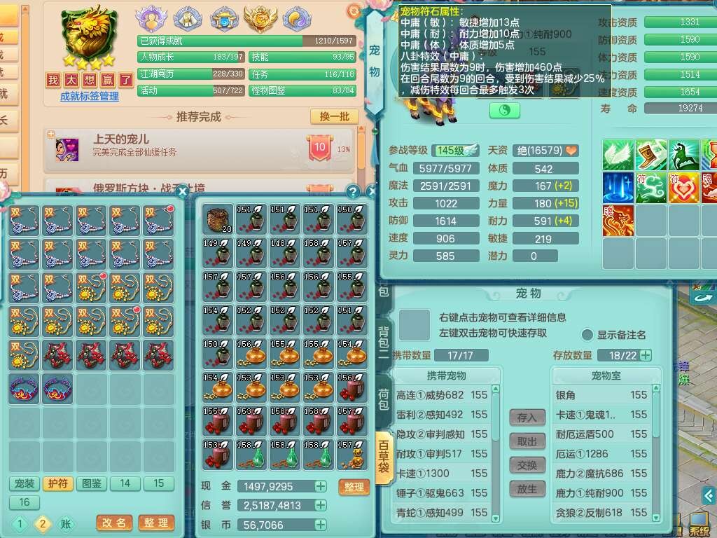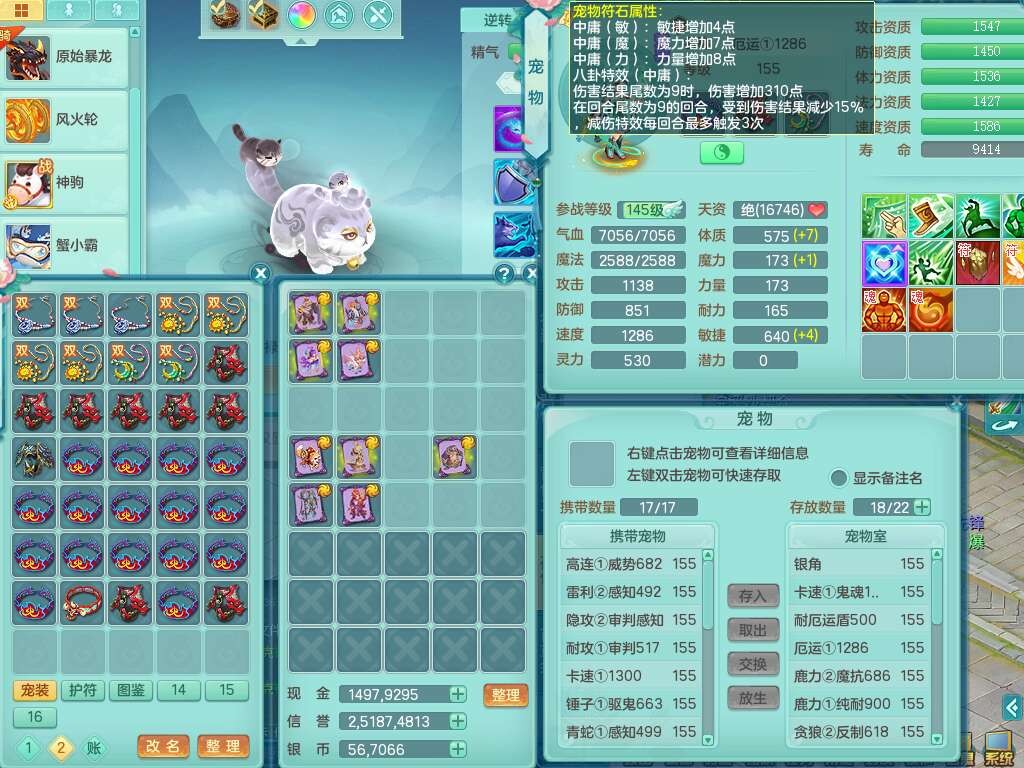 a22084浪淘沙159男天策,精灵歌,5龙3内胆神,仓库还有1神兽+61神兽内胆碎片,【13只觉醒,已潜龙】,8位靓号,6宠皮,3只六技能镜花灵,1只六技能龙姬,2特殊(双星,青霜),神佑单加50项链,易成长晶清单加53鞋子,3系宝石全满,封印慈航单加55头,愤怒六特,6.0基础鼎+70攻+280血,15个永久格子,9个纯六字,4个五字,24只满果子,仓库还有109个果子,宠排在榜,经验修炼成就在榜,暴龙泰坦+洪荒+神驹马到成功+火焰之力+西瓜冰武器,109天月卡,1.2万金币。