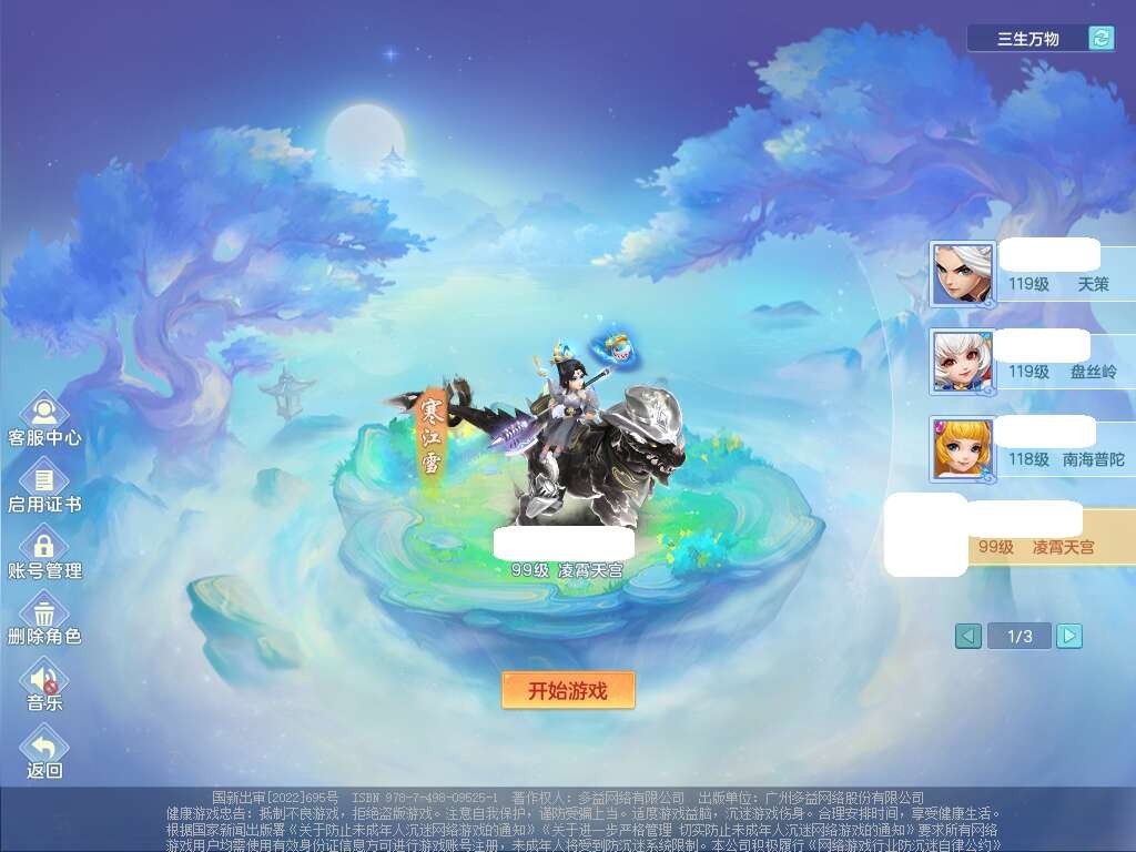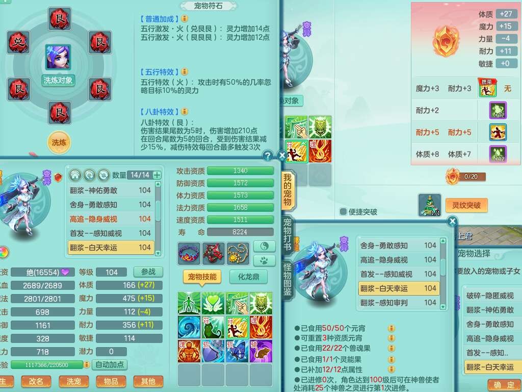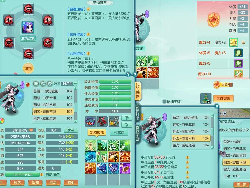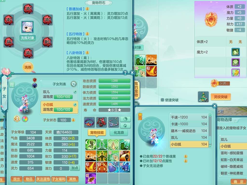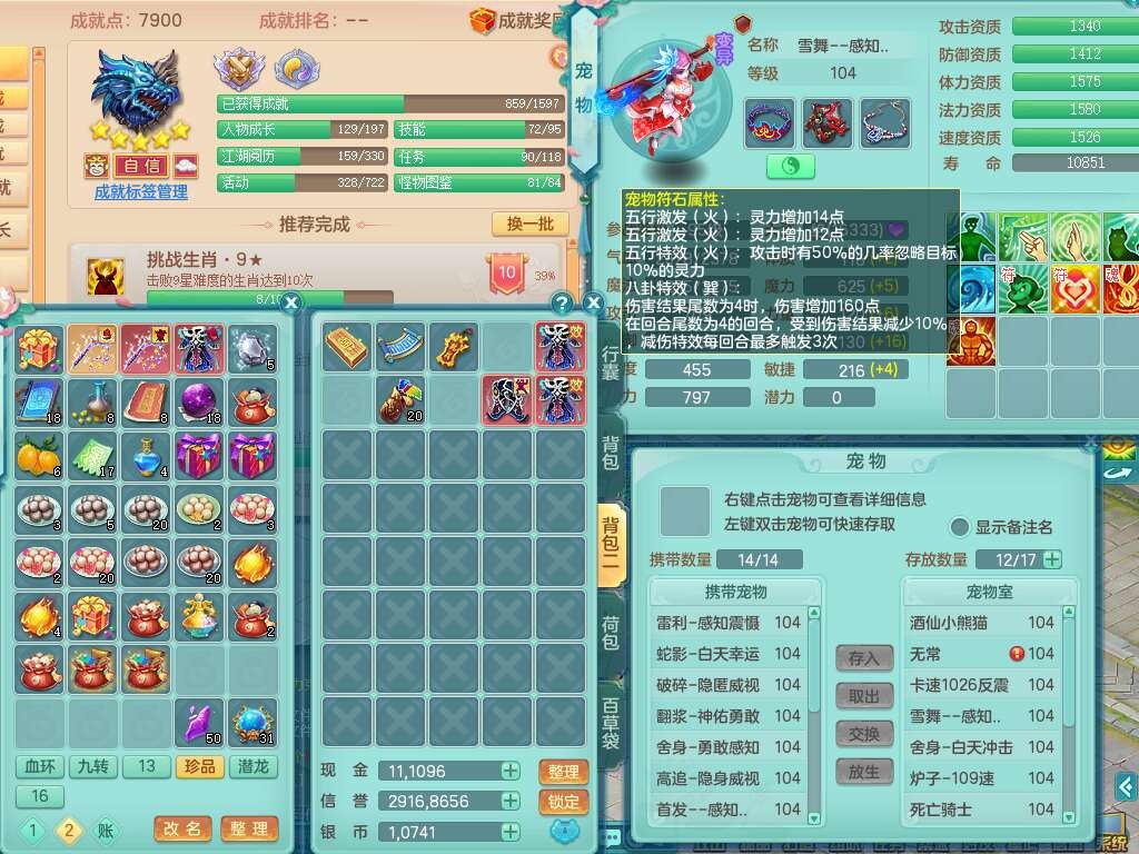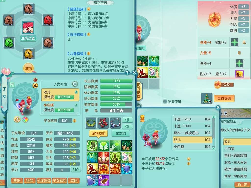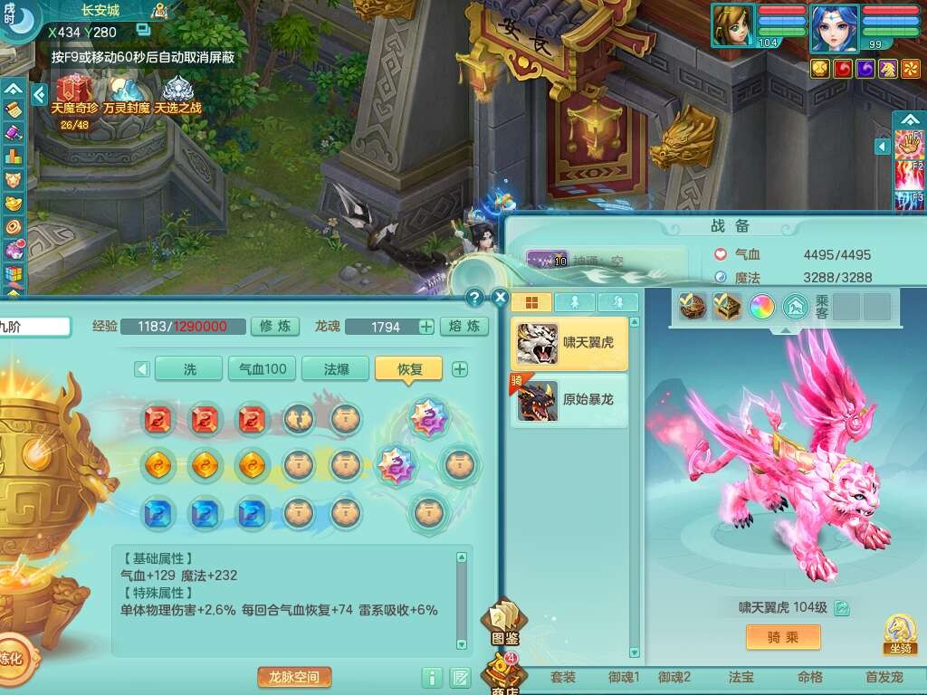C22080三生万物99女力天宫,1龙2内胆神,8只觉醒,1宠皮,崩山单加头,556易成长清心术武器,神佑化险为夷链子,愤怒群体疾速腰带,迅捷匠心鞋子,2.0基础鼎,4个纯六字,2个5字,仓库50神兽内丹碎片,31仙兽蛋,15只满果子,宠排在榜,双人老虎,暴龙逍客,冰晶庭院,月卡还有129天。