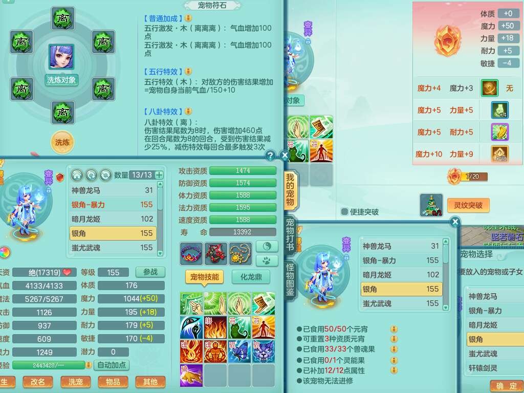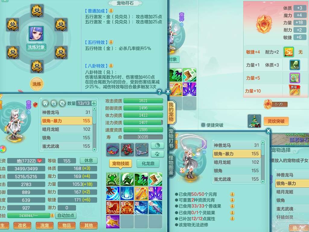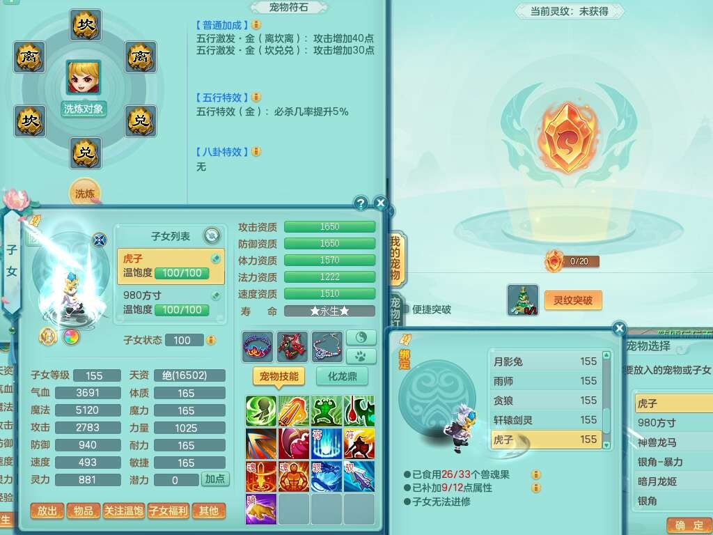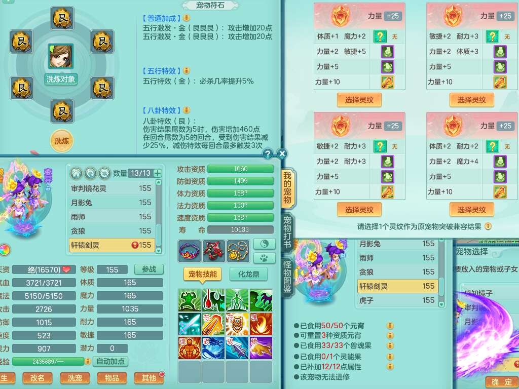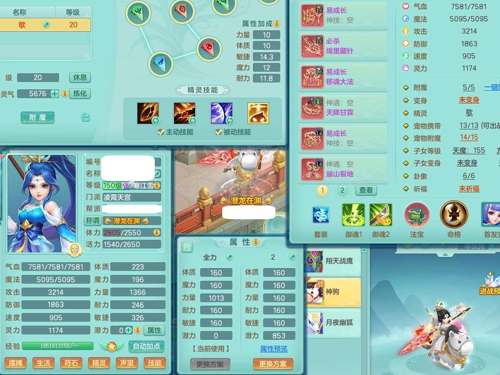 A22079花好月圆159女力天宫,精灵歌,1内胆神,【7只觉醒,已潜龙】,2只六技能镜花灵,1只6技能龙姬,3特殊(灵傀,登云,舍身),926必杀笑里单加52武器,崩山单加53鞋子,5.5基础鼎+70攻,280血,7个纯六字,10只满果子,仓库还有140个果子,112个凉糕,背,纯白月夜幽狐,神驹马到成功,带5597金币,月卡还有139天。