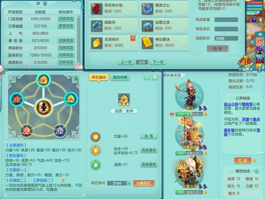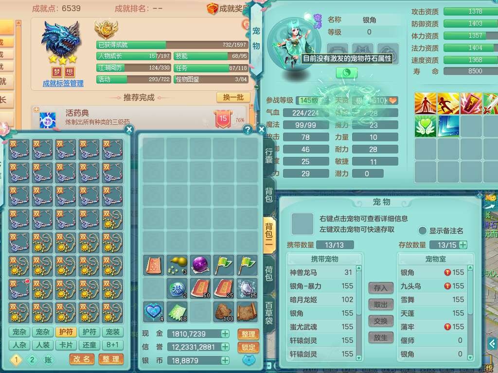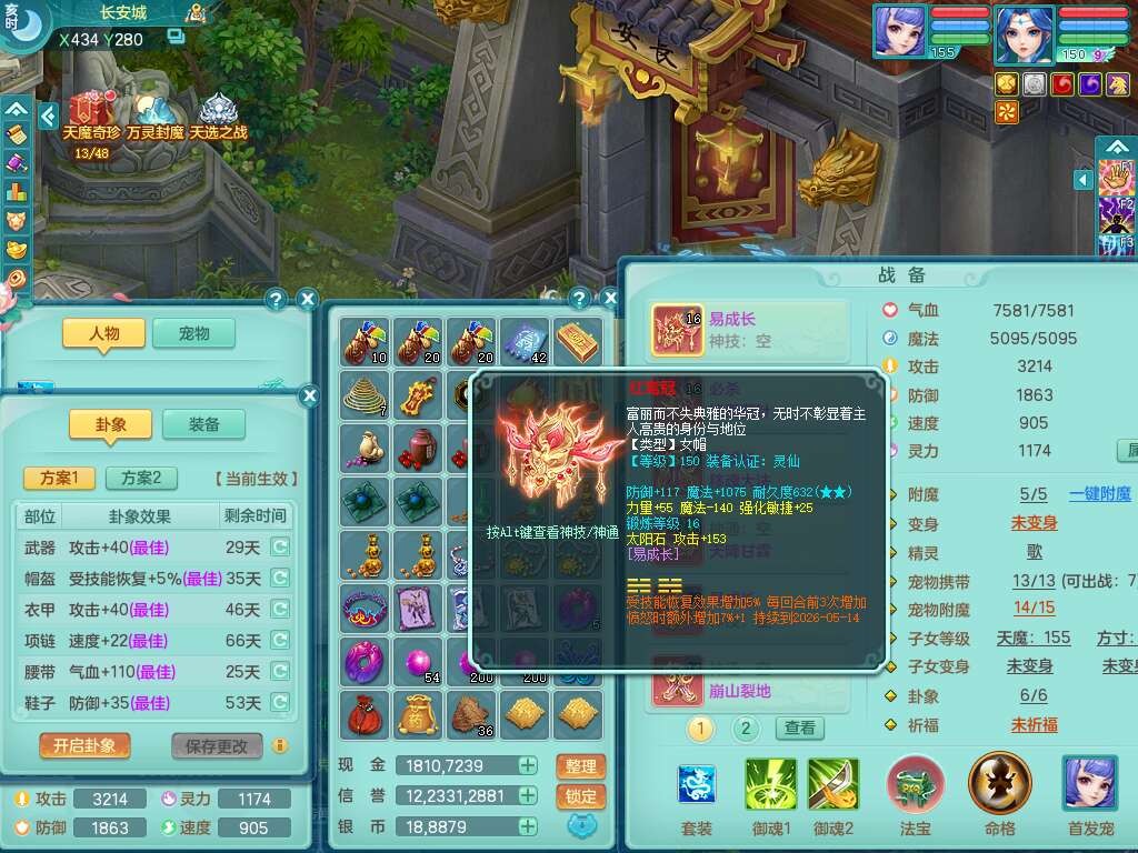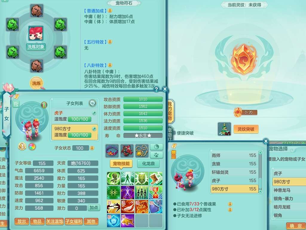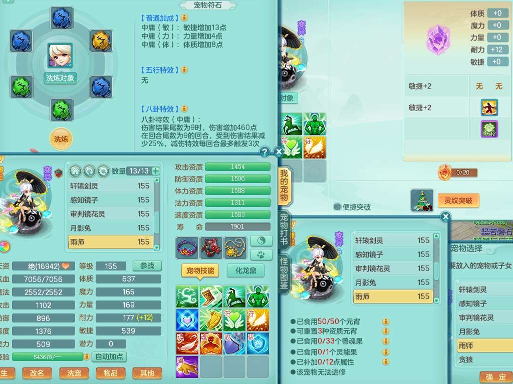 A22079花好月圆159女力天宫,精灵歌,1内胆神,【7只觉醒,已潜龙】,2只六技能镜花灵,1只6技能龙姬,3特殊(灵傀,登云,舍身),926必杀笑里单加52武器,崩山单加53鞋子,5.5基础鼎+70攻,280血,7个纯六字,10只满果子,仓库还有140个果子,112个凉糕,背,纯白月夜幽狐,神驹马到成功,带5597金币,月卡还有139天。