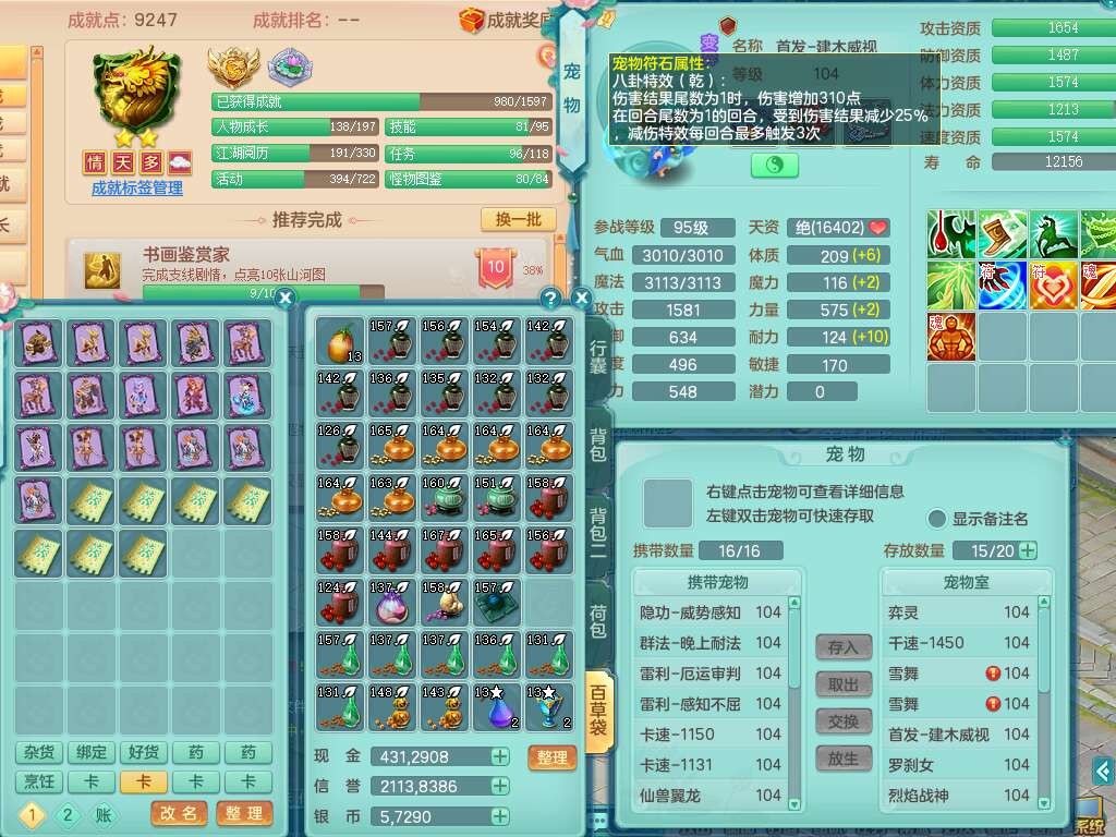 p22069生日快乐99男龙宫,9龙(1龙无内),3内胆神,【12只觉醒,已潜龙】,3宠皮,8位靓号不含4,531法爆单加33武器,法缭衣服,163易成长单加链子,愤怒单加33腰带,五雷单加32鞋子,神佑单加链子,迅捷单加31鞋子,553必杀武器,541狂暴单加武器,仓库很多装备,基础鼎3.0,14个格子,9个纯6字,23只满果子,宠排在榜,3只坐骑+西瓜冰武器,永久称谓,月卡60天。