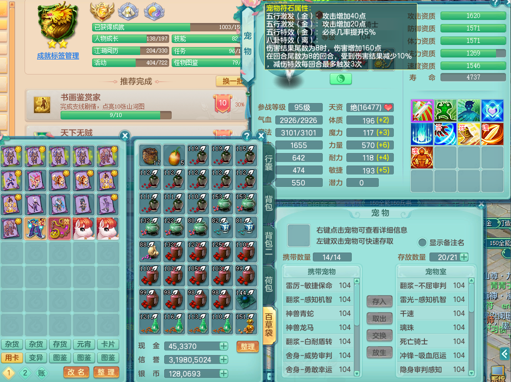 P22061风华绝代99男无名谷,1龙没内,1内丹神,【11觉醒,已潜龙】,3宠皮,双破甲,破甲单加31头,破甲单加鞋子,541狂暴易成长武器,崩山单加衣服,神佑慈航项链,愤怒腰带,3.0基础鼎+42攻+168血,9个纯六字,4个五字,22只满果子,宠排在榜,2只双人坐骑,暴龙洪荒+神驹马上发财+火焰之力武器+西瓜冰武器,34个神兽内丹碎片, 146天月卡。带99奶粉。