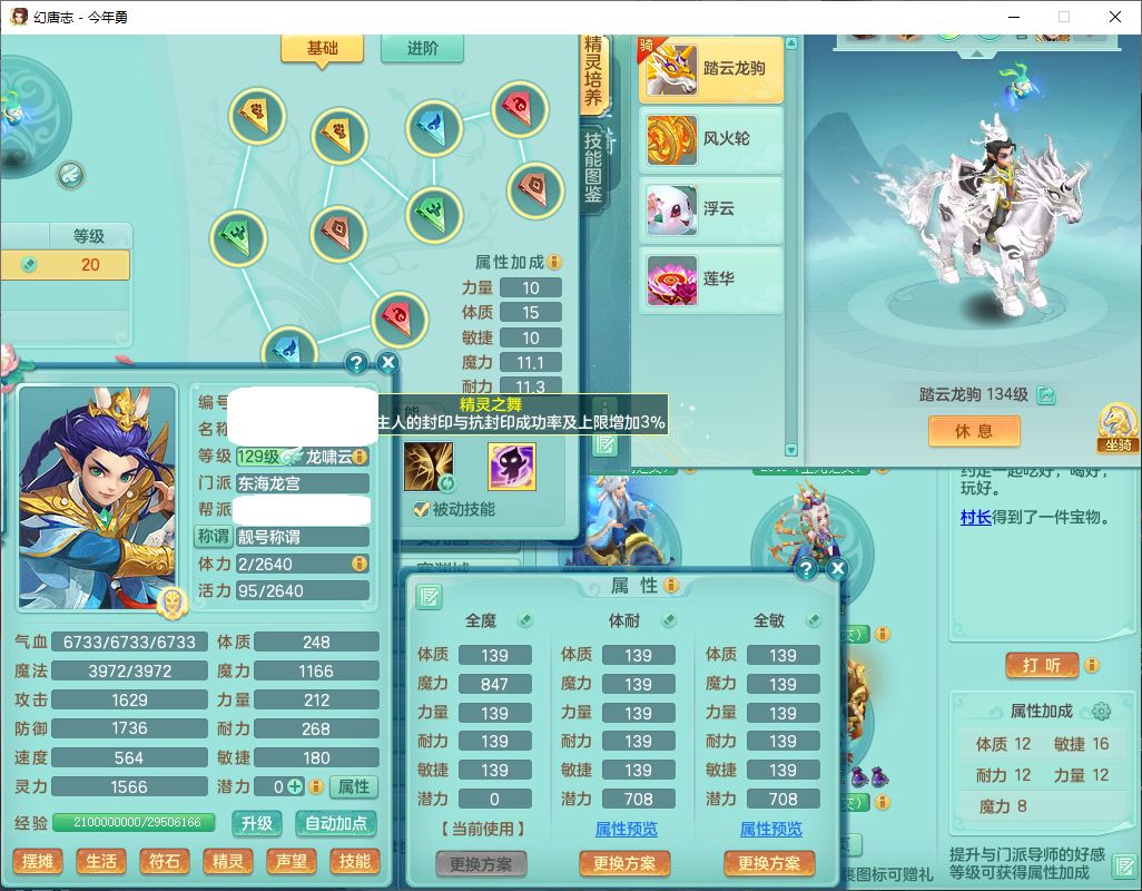 71455YB今年勇129男龙宫精灵舞,8位靓号,2龙(换、无内)1神兽(无内)1内丹龙马1九幽1金炉1神石,8觉醒3宠皮1六字9四字综合14只满果子,9红星辰之拥装备,法爆Y武器,法缭心神衣服,Y心神项链,五雷腰带,一套9红辅助装,Y慈航衣服,愤怒Y腰带,迅捷激励鞋子,可出星辰之拥封系装,封印精通群体迟滞帽子,鼎4.0,128天月卡,房屋176,永久外观、精灵皮肤,39个内丹碎片,1双人坐骑,带2个150奶粉