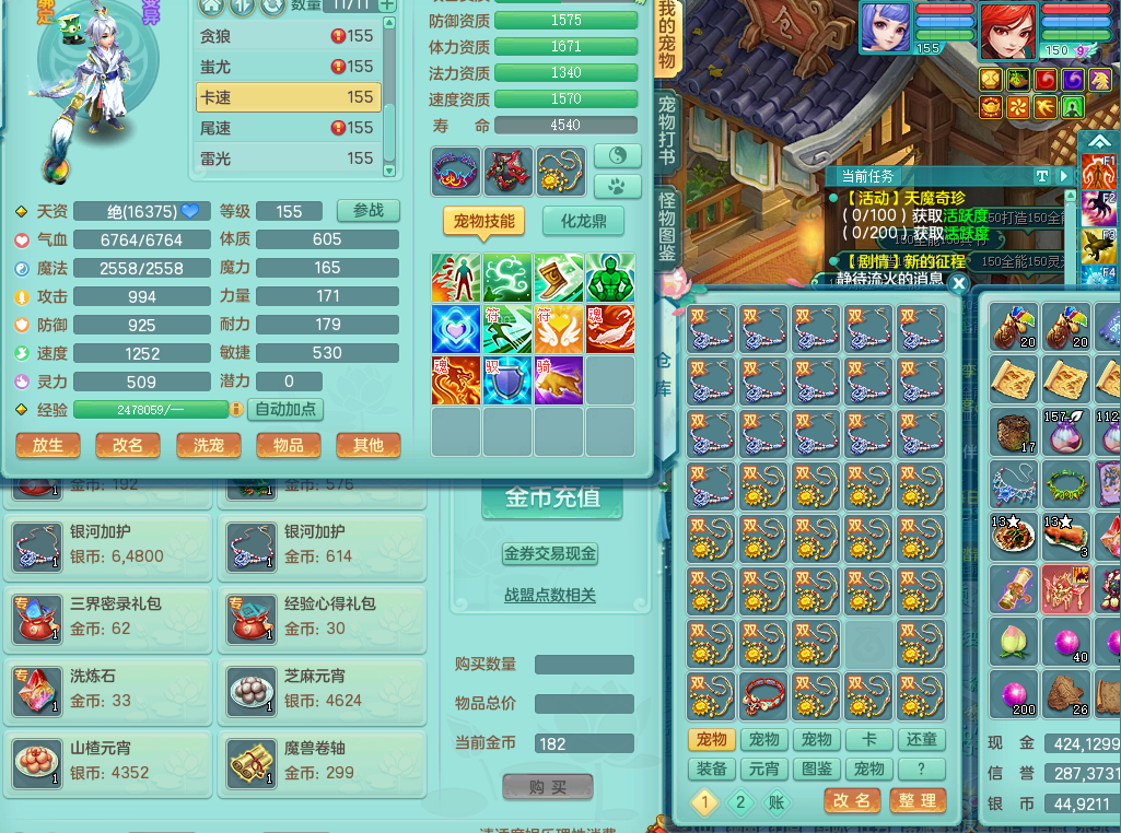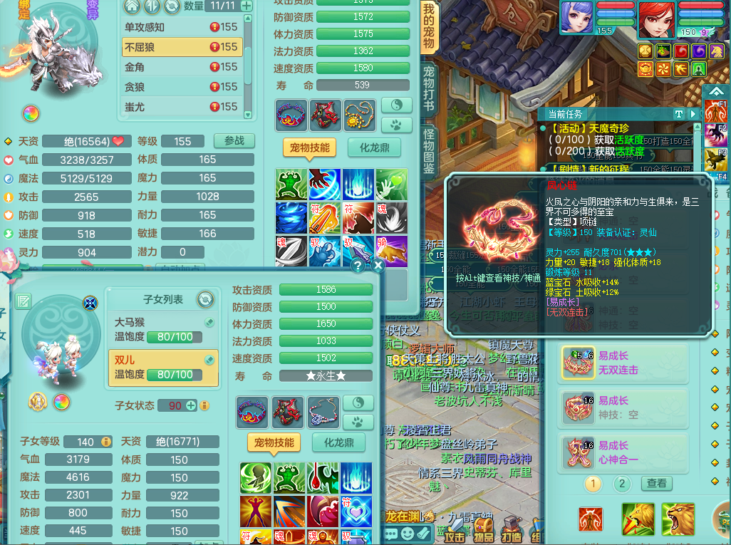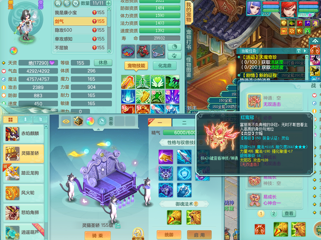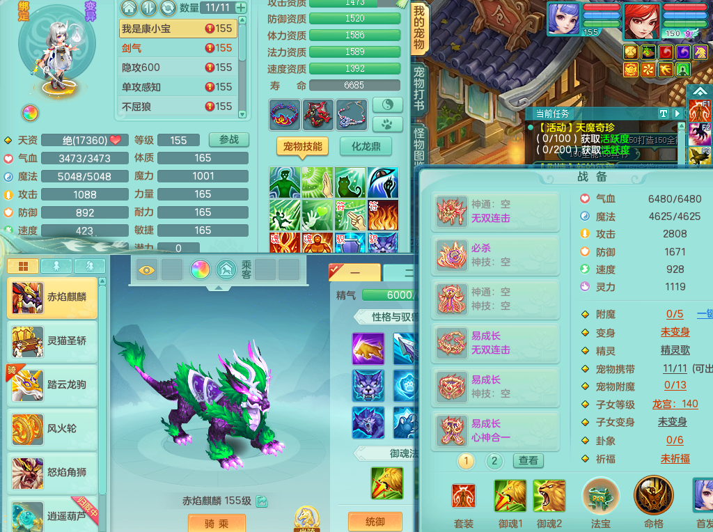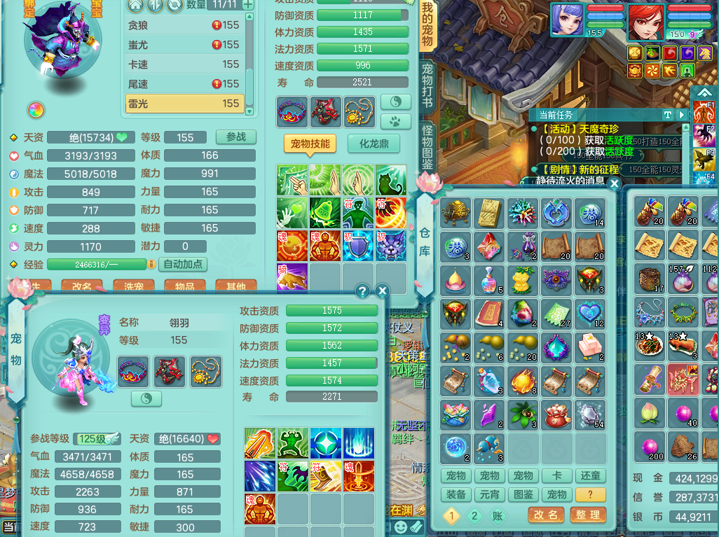 63138,今年勇159女万兽,日常号,装备宝宝够用,4只坐骑,3陆地双人,1飞行双人,930必杀武器,单加55破血头,永久头饰脸饰背饰,天上人间,仓库42个仙兽蛋