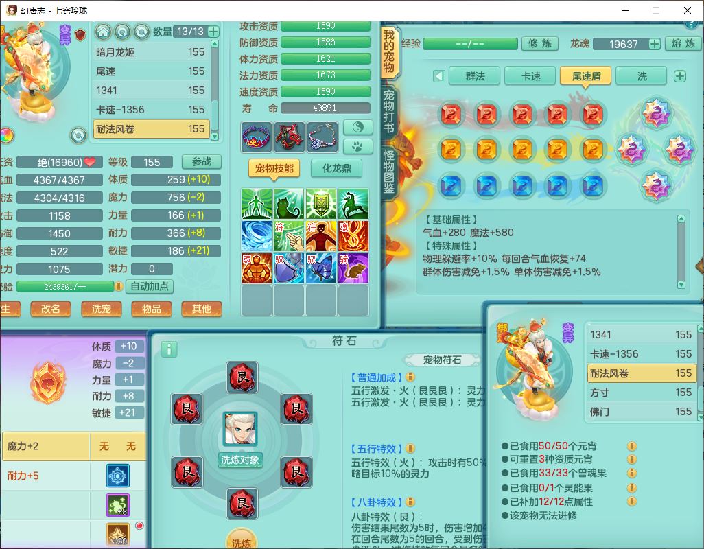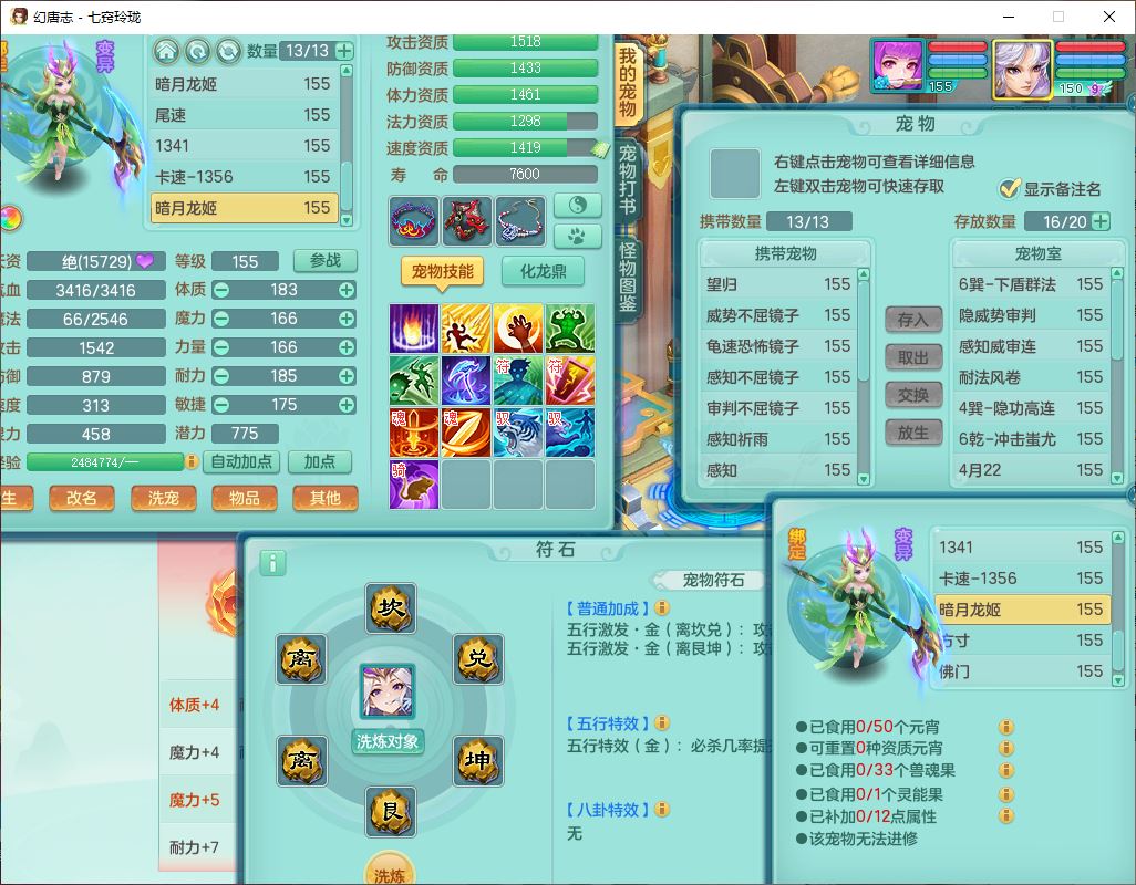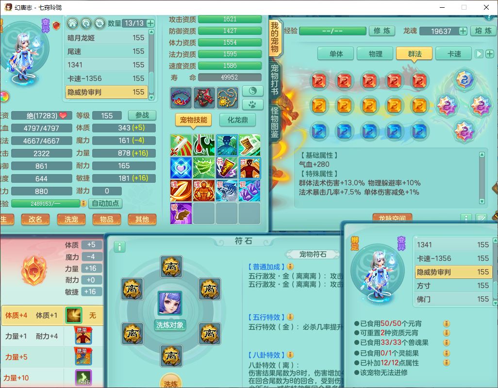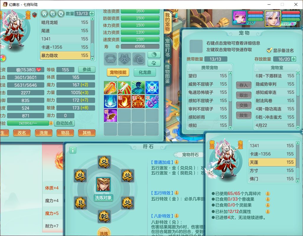 71452WH七窍玲珑159男万兽【潜龙+马上发财+火焰之力】精灵歌,1内丹青蛇1望归4镜花4特殊(祈雨、舍身,兽决禁锢、夺命)2龙姬1金炉,8觉醒3宠皮12六字1五字3四字17只满果子,8红装备,Y狂暴四海武器,崩山衣服,坚毅项链,一套辅助装备,Y晶清腰带,Y四海项链,鼎5.5+70+280,2套符石,138天月卡,庭院165房屋148,永久外观、精灵皮肤,28个仙兽灵,21个内丹碎片,1双人坐骑