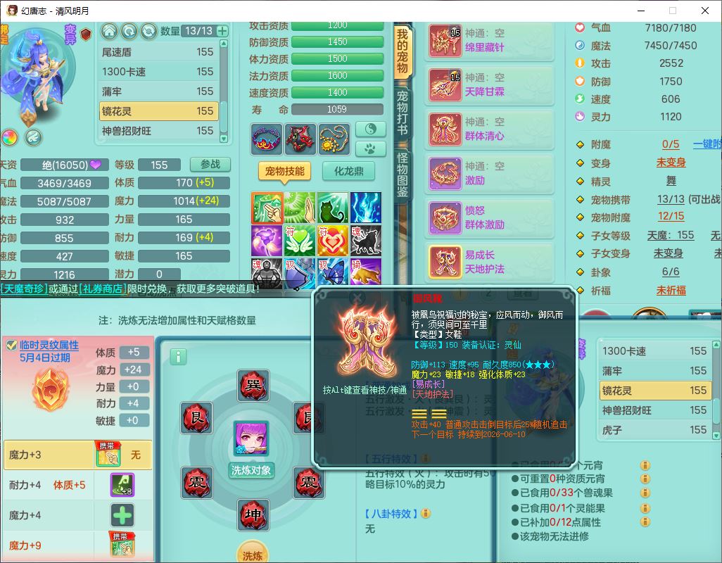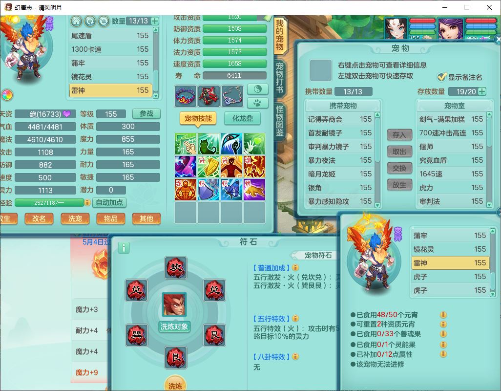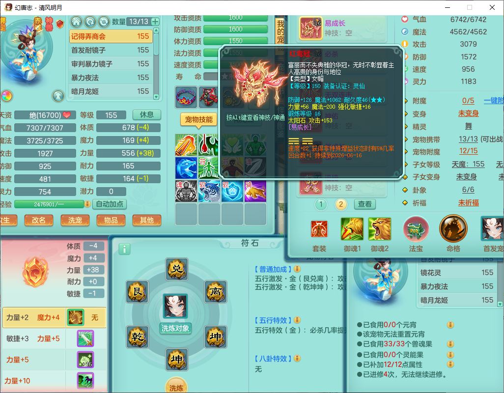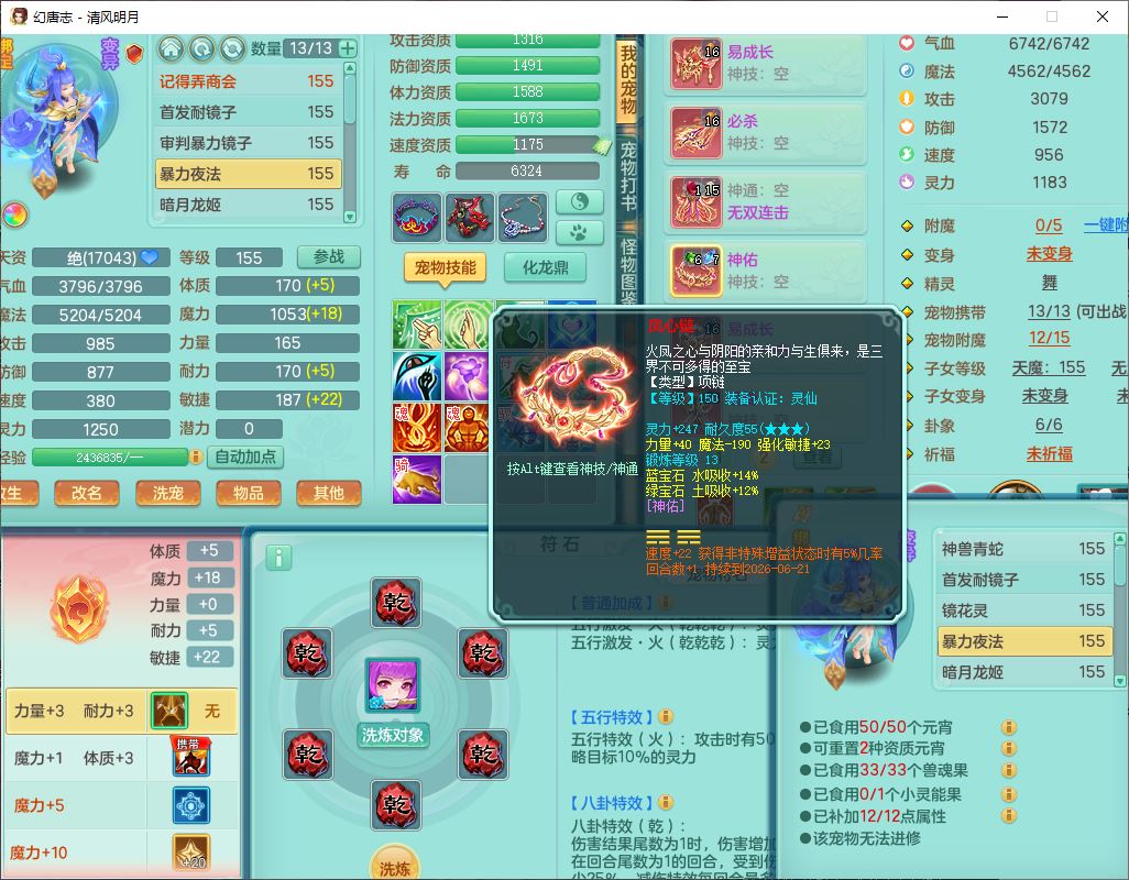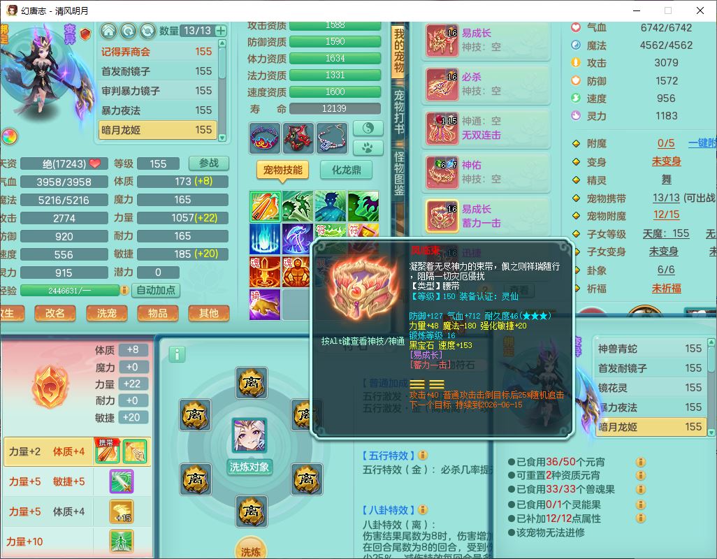4349清风明月159女万兽精灵舞,1内丹青蛇5镜花1龙姬1金炉2特殊兽决(怒破、雷利),8觉醒3六字1五字3四字(1洗练珠)12只满果子,7红装备,必杀武器,神佑项链,Y蓄力腰带,一套8红辅助装,愤怒群体激励腰带,Y罗汉鞋子,鼎4.5+70,64天月卡,20个仙兽灵,48个内丹碎片,1飞行坐骑