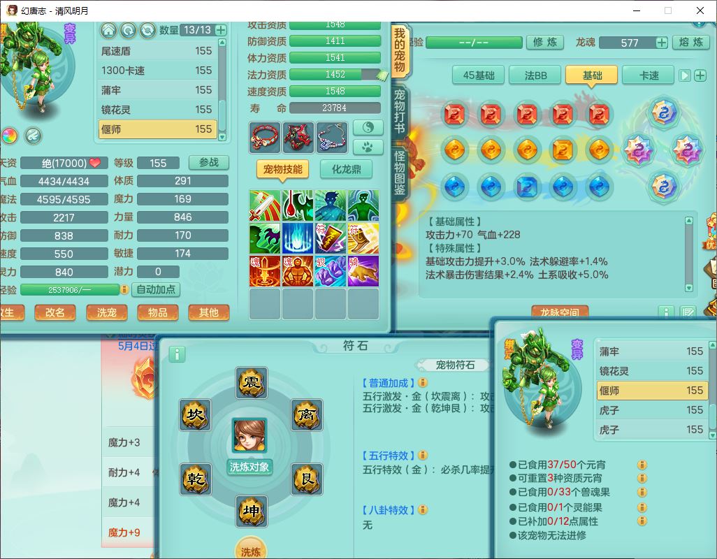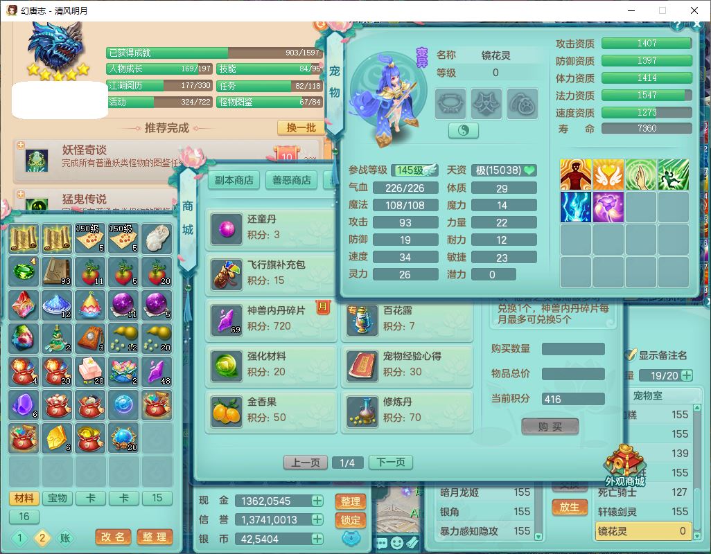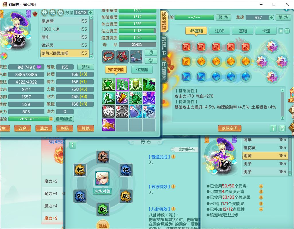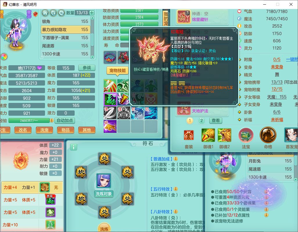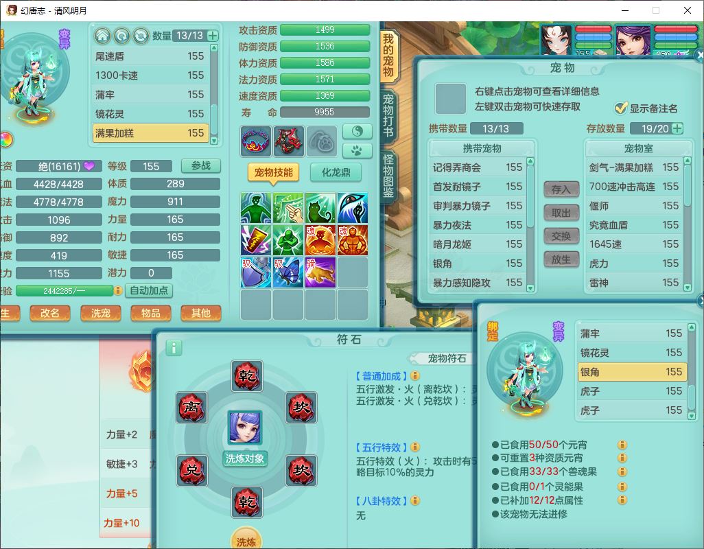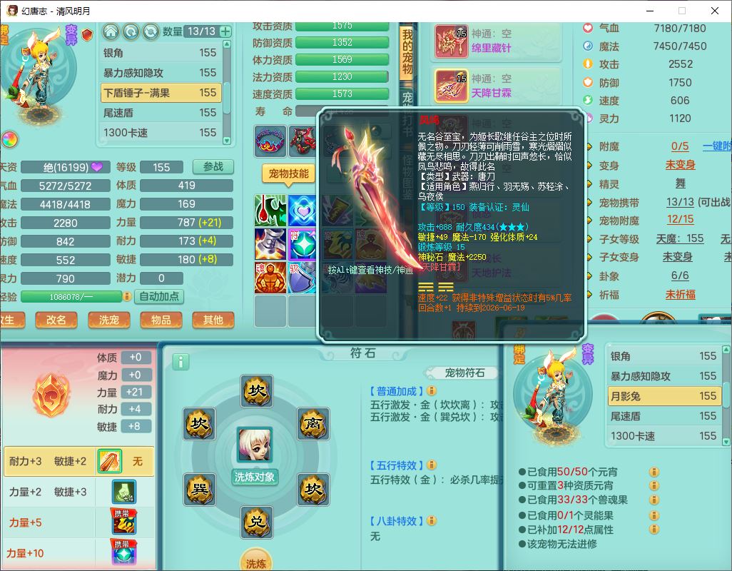 4349清风明月159女万兽精灵舞,1内丹青蛇5镜花1龙姬1金炉2特殊兽决(怒破、雷利),8觉醒3六字1五字3四字(1洗练珠)12只满果子,7红装备,必杀武器,神佑项链,Y蓄力腰带,一套8红辅助装,愤怒群体激励腰带,Y罗汉鞋子,鼎4.5+70,64天月卡,20个仙兽灵,48个内丹碎片,1飞行坐骑