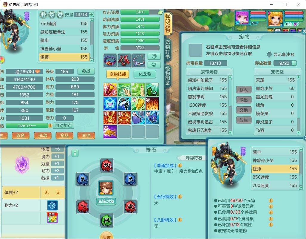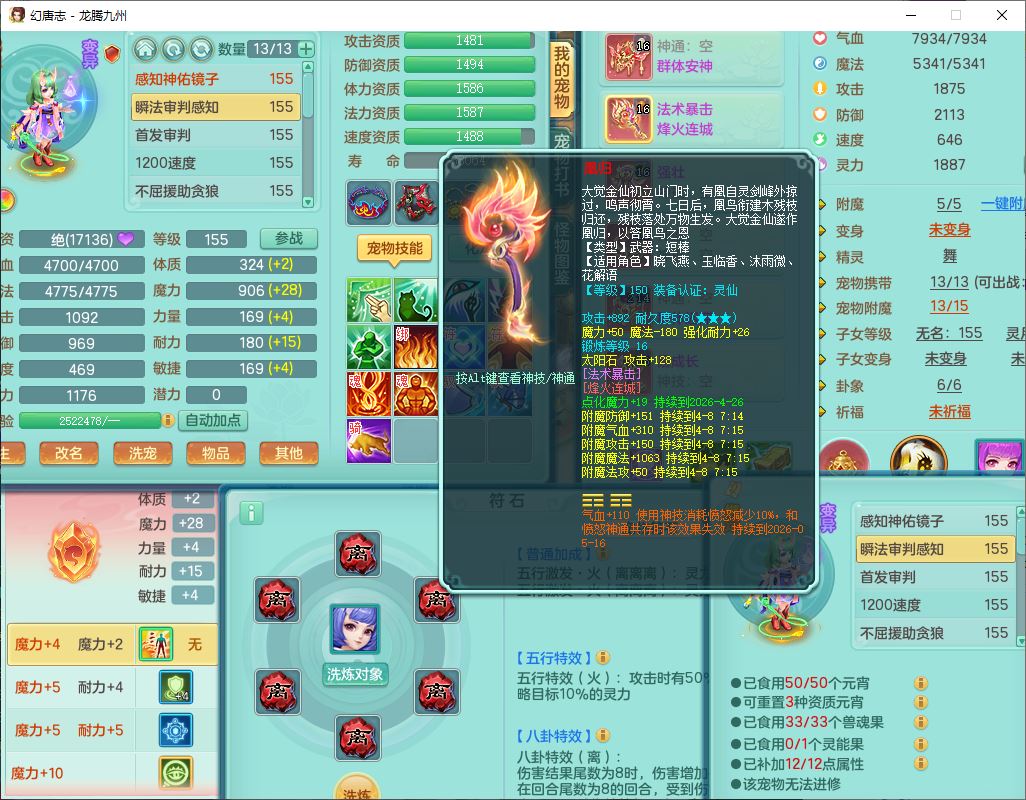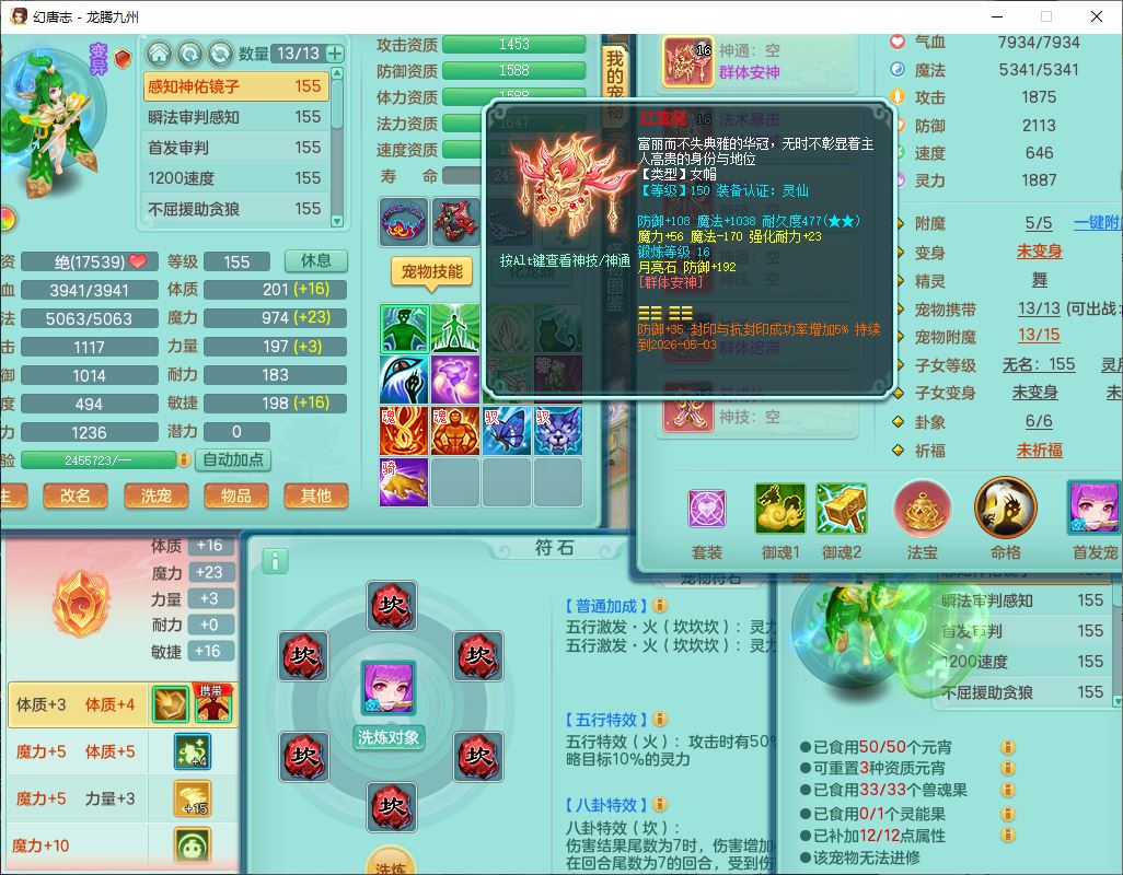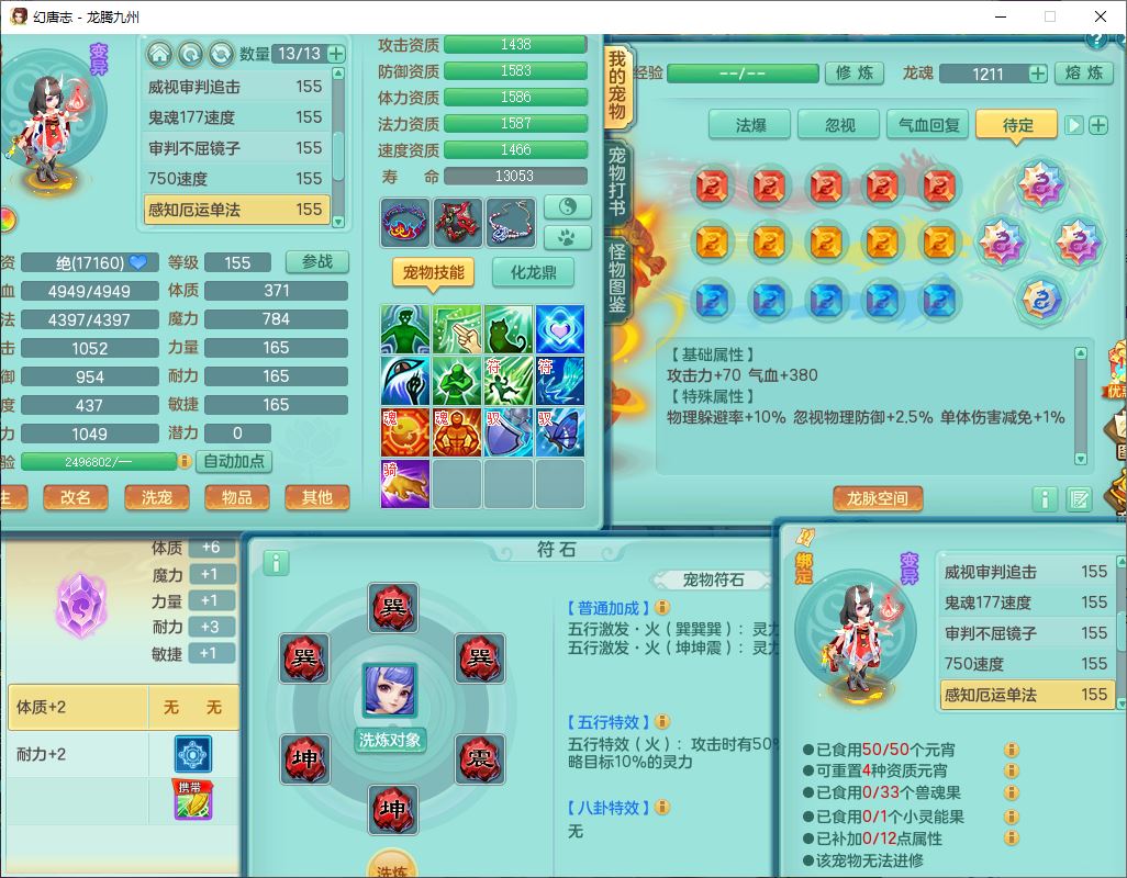 62411龙腾九州159女龙宫【准潜龙号,差1只宝宝4条主符石2条附加】精灵舞,1神兽(无内)1望归2镜花1金炉1龙姬2特殊兽决(月光、流星),7觉醒6六字3五字1四字,装备齐全,法爆烽火武器,鼎5.5+70+280,永久外观,24个仙兽灵,42个内丹碎片,2坐骑