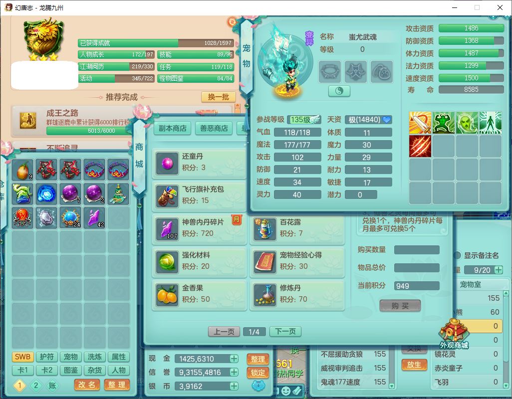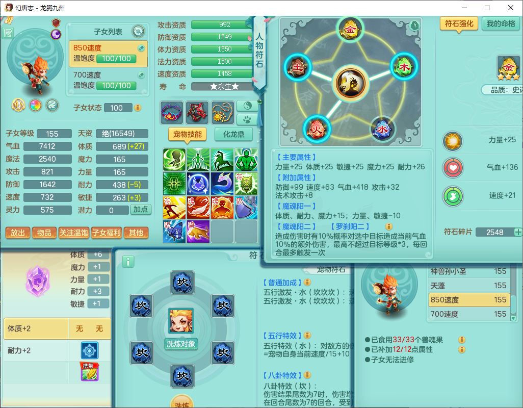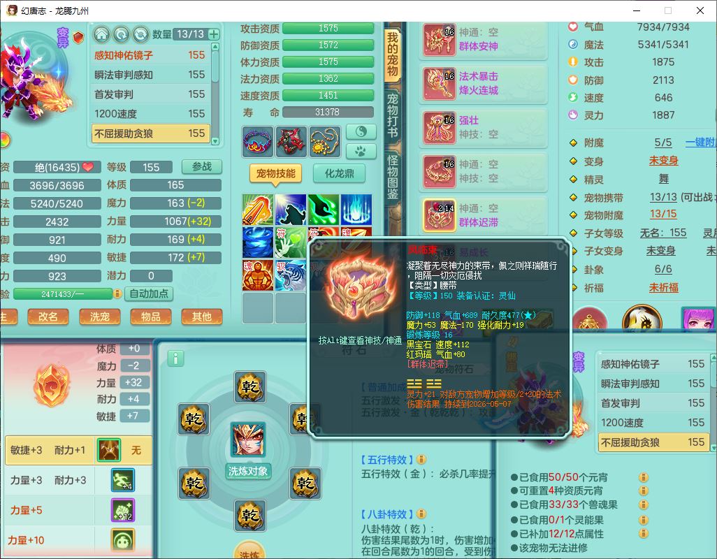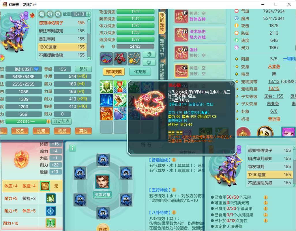 62411龙腾九州159女龙宫【准潜龙号,差1只宝宝4条主符石2条附加】精灵舞,1神兽(无内)1望归2镜花1金炉1龙姬2特殊兽决(月光、流星),7觉醒6六字3五字1四字,装备齐全,法爆烽火武器,鼎5.5+70+280,永久外观,24个仙兽灵,42个内丹碎片,2坐骑