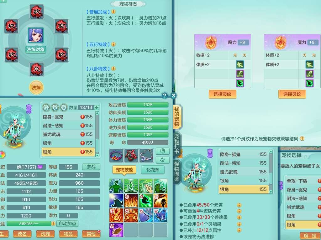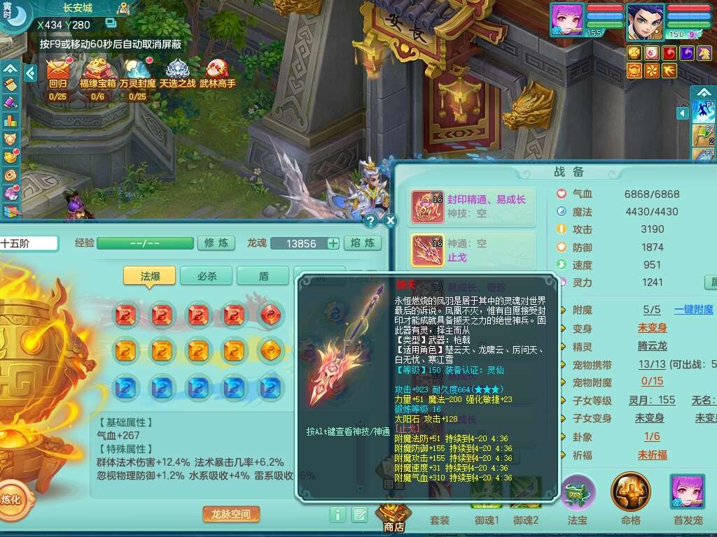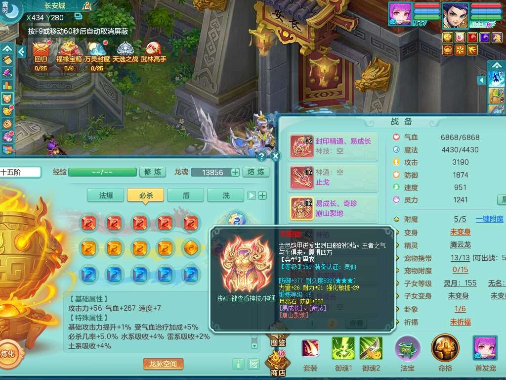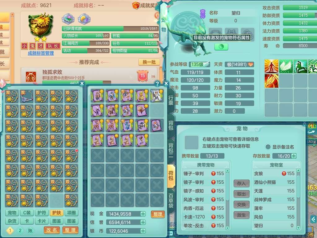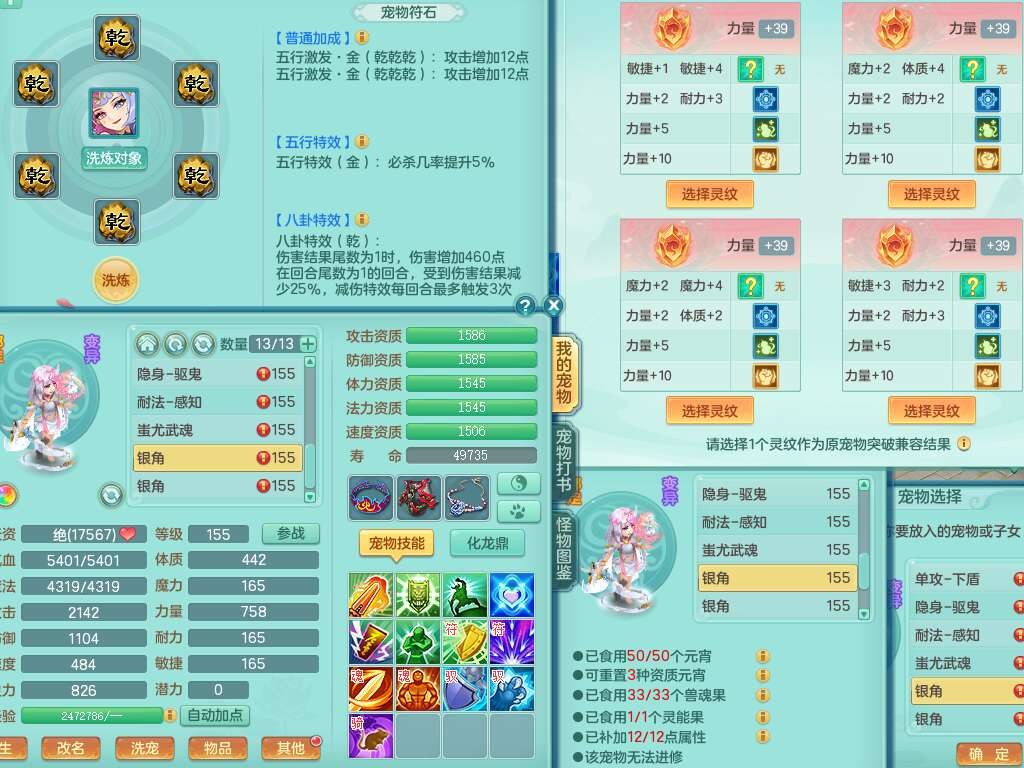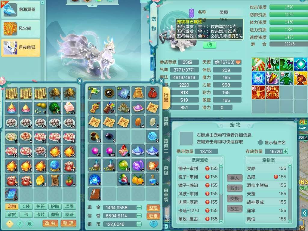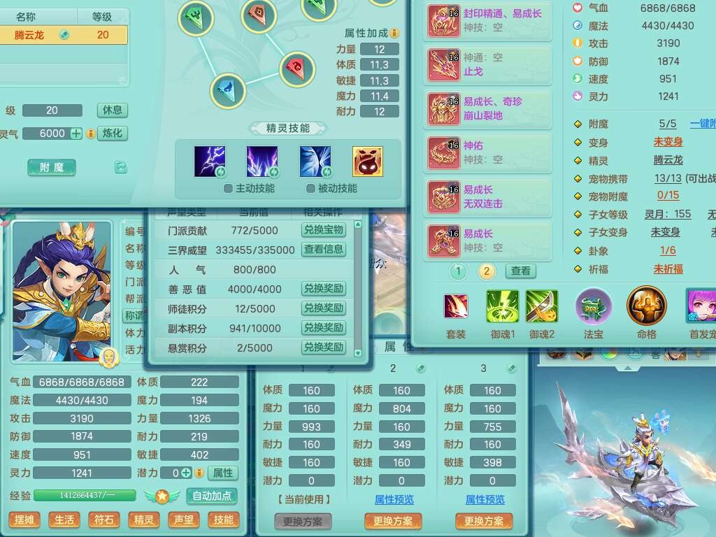 A22259超凡入圣159男天宫,精灵怒,1内胆神,4只觉醒。4宠皮+2幻灵果,2特殊(号角,上善),3只6技能镜花灵,易成长封印精通单加头,三红易成长奇珍崩山衣服,神佑单加链子,易成长破血单加腰带,易成长单加51鞋子,266易成长单加链子,5.0基础鼎,3个纯六字,2个5字,13只满果子,背包39仙兽蛋,2个染色坐骑,带百万银币。