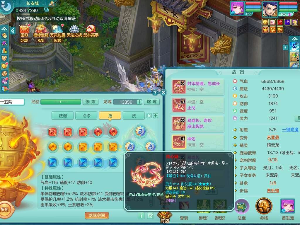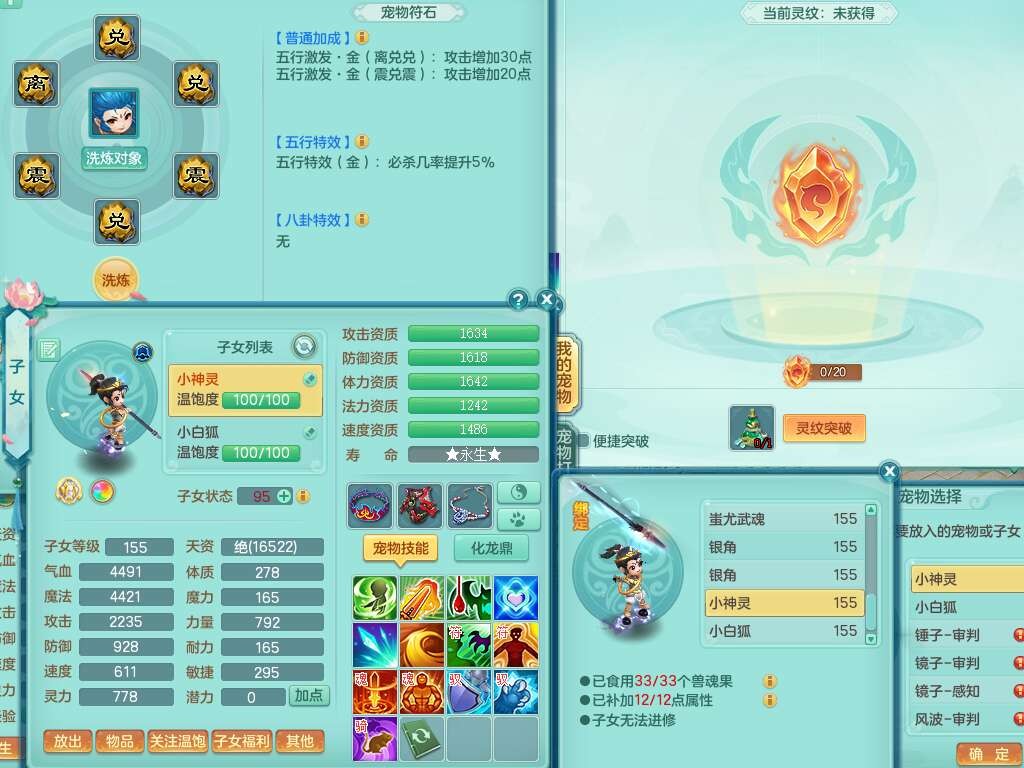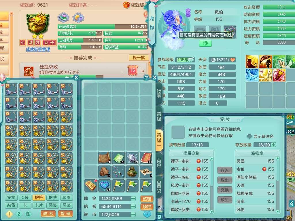 A22259超凡入圣159男天宫,精灵怒,1内胆神,4只觉醒。4宠皮+2幻灵果,2特殊(号角,上善),3只6技能镜花灵,易成长封印精通单加头,三红易成长奇珍崩山衣服,神佑单加链子,易成长破血单加腰带,易成长单加51鞋子,266易成长单加链子,5.0基础鼎,3个纯六字,2个5字,13只满果子,背包39仙兽蛋,2个染色坐骑,带百万银币。