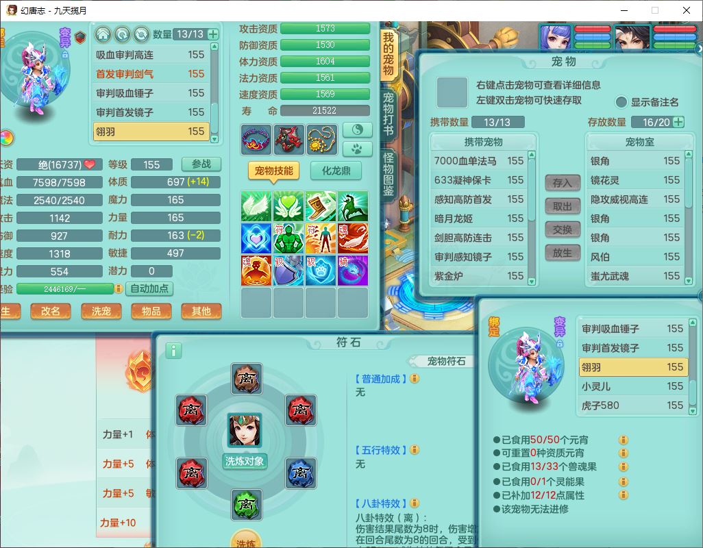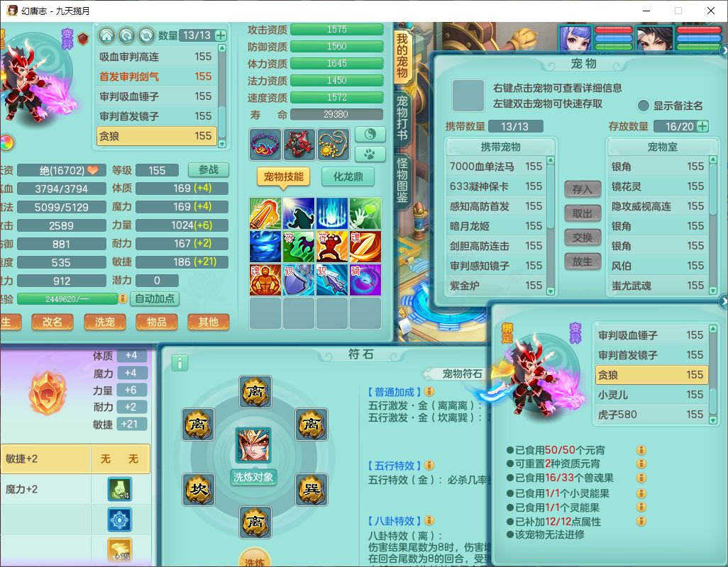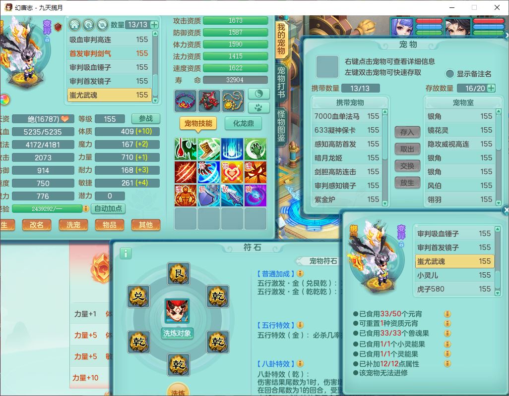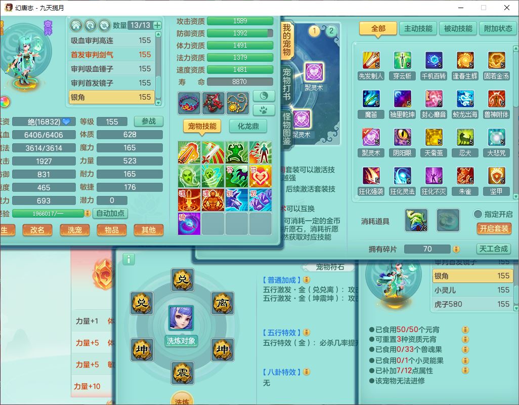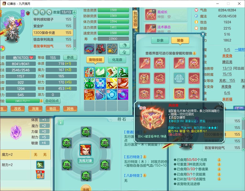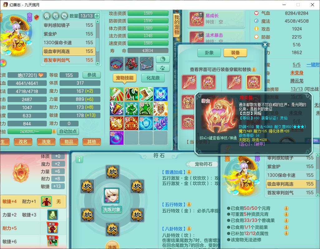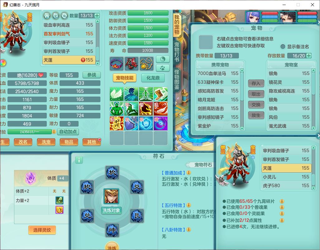 jt10360九天揽月159男天宫【潜龙+马到成功+火焰之力】精灵歌,1内丹龙马1望归1龙姬3特殊(剑胆、破碎、禁锢)3镜花1六技能雷光妖鬼1金炉,10觉醒8六字2五字6四字16只满果子,装备齐全,法爆武器,愤怒腰带,幸运五雷鞋子,一套8红物理装,932Y武器,崩山腰带,匠心破甲帽子,神佑项链,Y吸血鞋子,鼎6.0+70+280,69天月卡,永久头饰、精灵皮肤,57个仙兽灵,19个内丹碎片,1双人飞行坐骑,带150奶粉,有双重