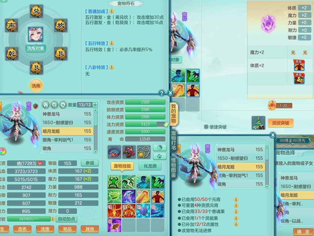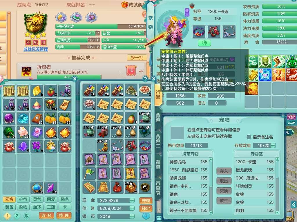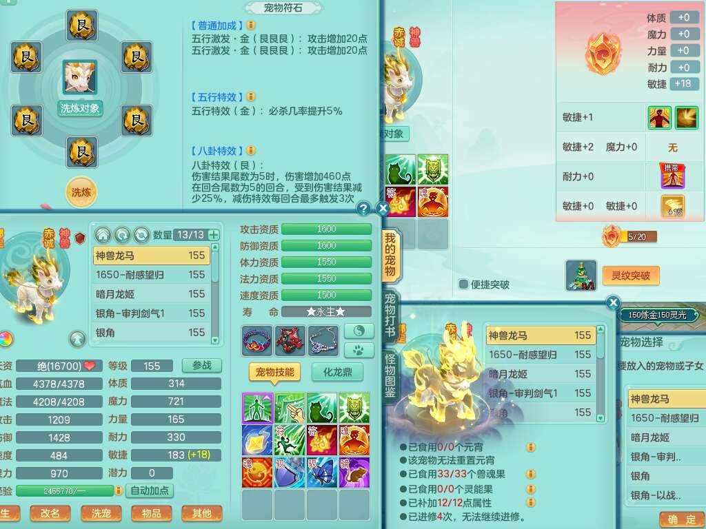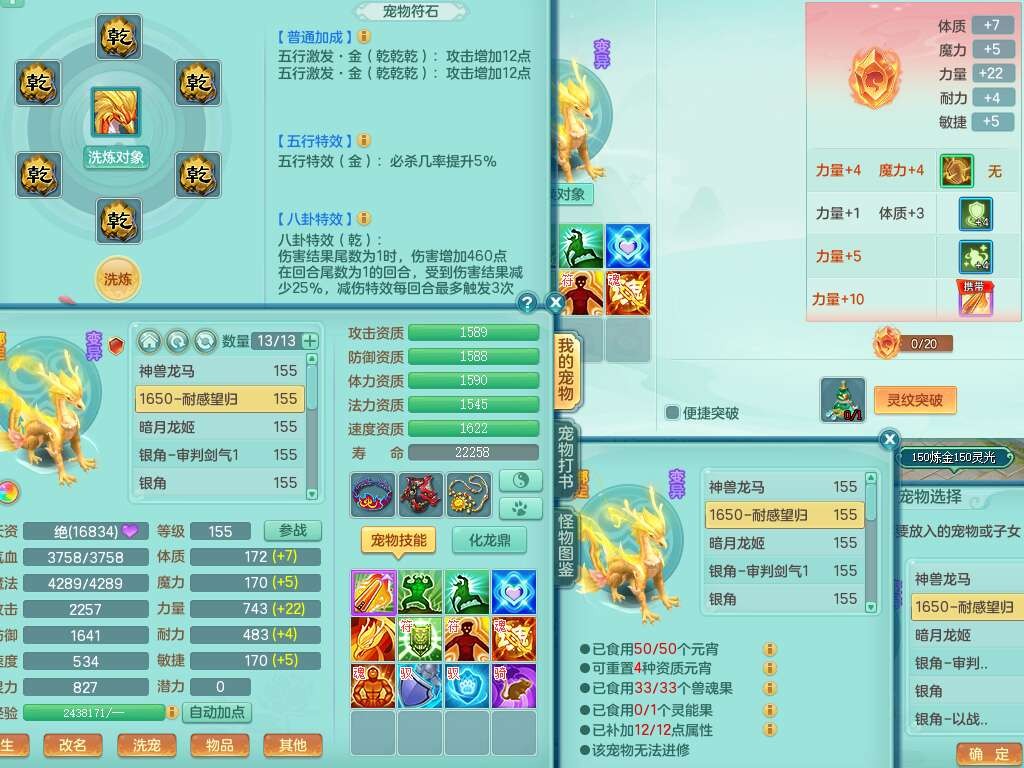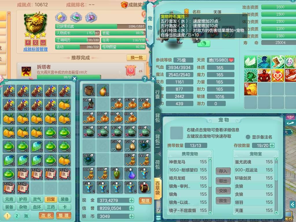 J22022龙腾九州159男普陀,精灵舞,1内胆神,5只觉醒(潜龙条件只差2只觉醒,1个6字),4特殊(以战,夺命,灵傀,虎虎),3只6技能镜花灵,1只6技能龙姬,三红愤怒易野兽腰带,回春愤怒6特,5.5基础鼎+70攻,280血,6个纯六字,1个5字,13只满果子,仓库24神兽内丹碎片,24仙兽蛋,双人坐骑。