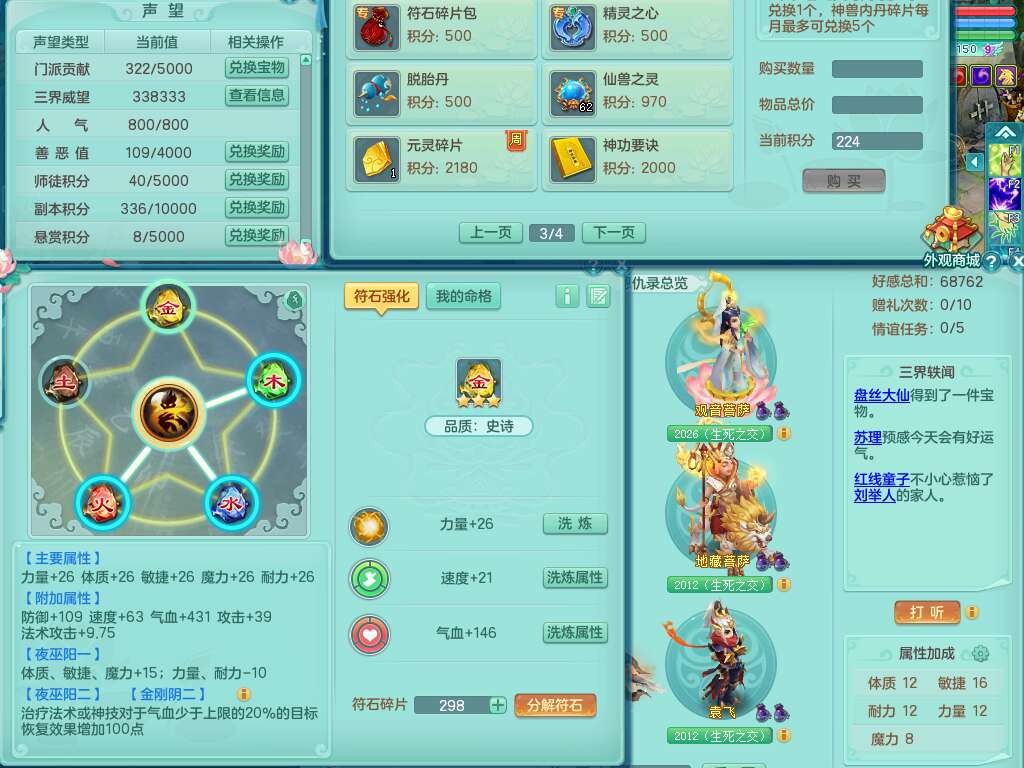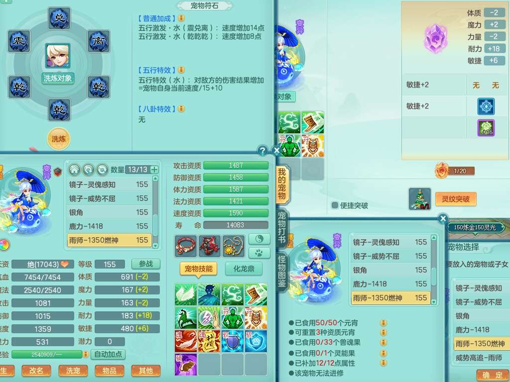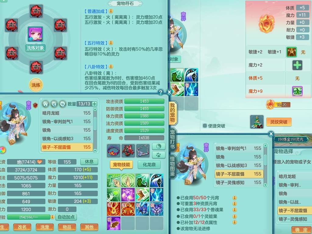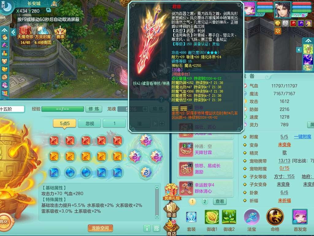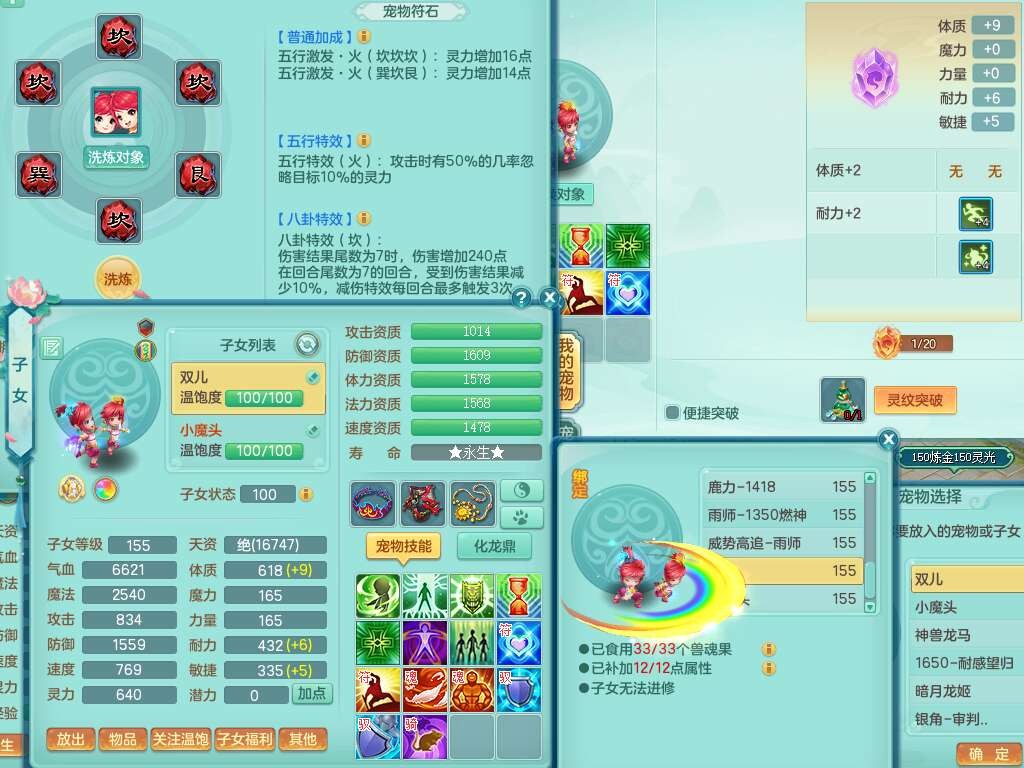 J22022龙腾九州159男普陀,精灵舞,1内胆神,5只觉醒(潜龙条件只差2只觉醒,1个6字),4特殊(以战,夺命,灵傀,虎虎),3只6技能镜花灵,1只6技能龙姬,三红愤怒易野兽腰带,回春愤怒6特,5.5基础鼎+70攻,280血,6个纯六字,1个5字,13只满果子,仓库24神兽内丹碎片,24仙兽蛋,双人坐骑。