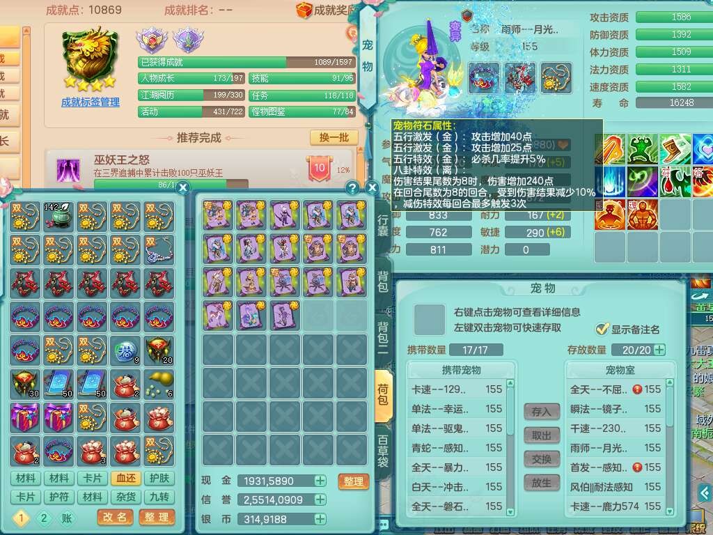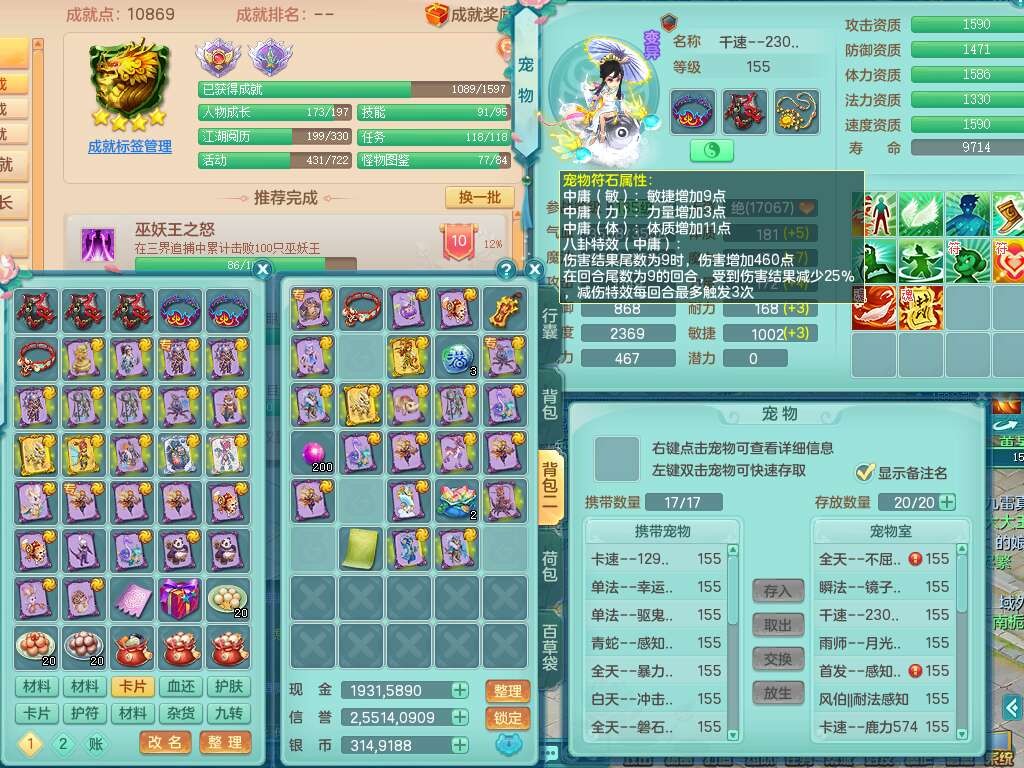 A22014任剑逍遥159女天策,精灵歌,1龙没内,准2内胆神(背包66神兽内丹碎片),2破镜,14只觉醒,8特殊(雷厉,止战,祈雨,坠天,青霜,烈焰,翻江,月光),4只六技能镜花灵,928易成长单加55武器,破血单加衣服,双红神佑蓄力一击单加56腰带,追捕易成长单加50鞋子,5.0基础鼎,15个格子,1个六字,5个五字,24只满果子,宠排在榜,经验修炼在榜,带4422金币,314W银币。