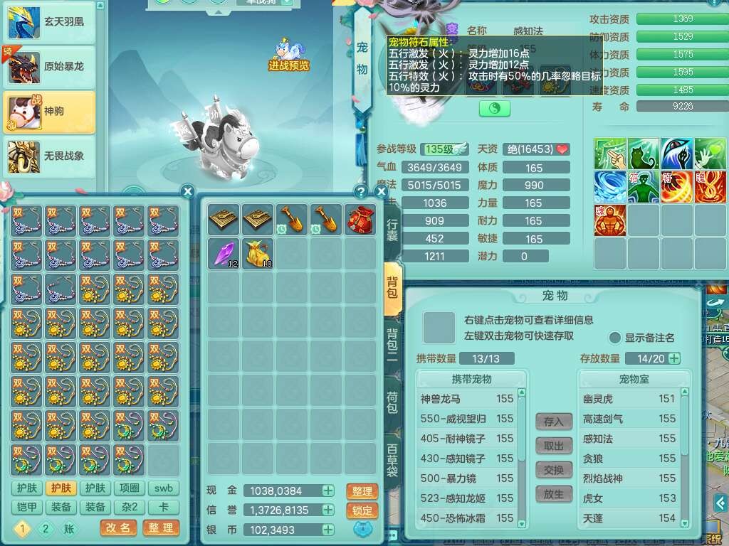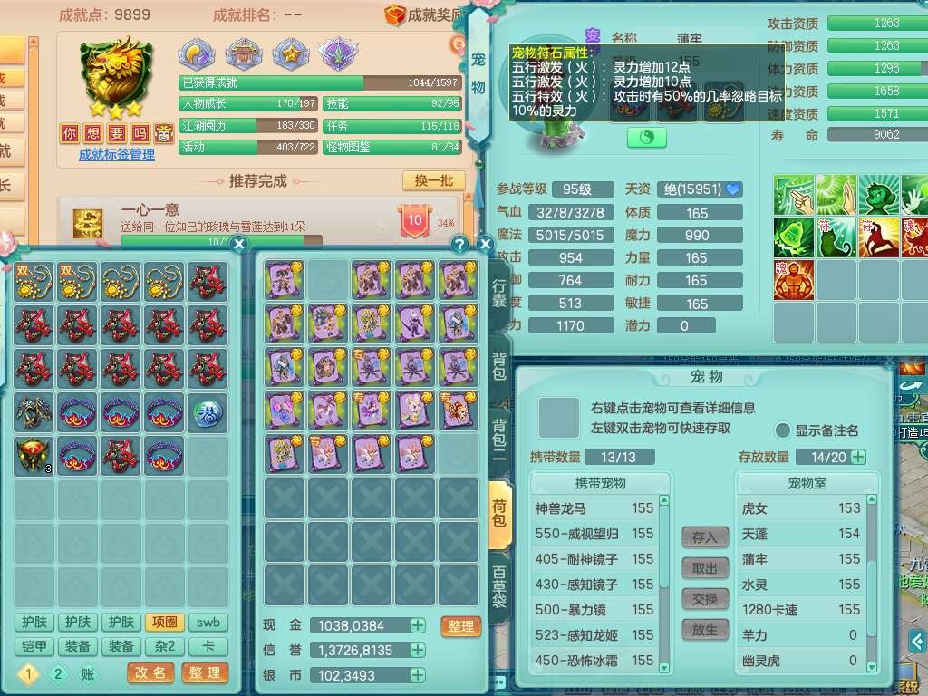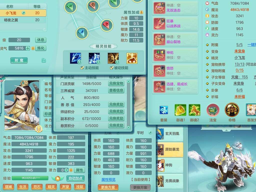 a22004今年勇159男天策,精灵歌,1内胆神,4只觉醒,3只6技能镜花灵,迅捷易单加51鞋子,934狂暴单加51武器,崩山衣服,愤怒单加腰带,4.5基础鼎,4只坐骑,暴龙洪荒+西瓜冰武器+神驹马到成功,带8787金币。➕159男方寸,精灵舞,1神兽(仓库48神兽内丹碎片),3只觉醒,3只觉醒,3特殊(影袭,藕断,流星),1只6技能镜花灵,封印精通愈心诀头,双红封锁武器,愤怒单加腰带,5特,5.0基础鼎,神驹马到成功+火焰之力。➕159女普陀,精灵歌,4.5基础鼎,带一百多万银币。