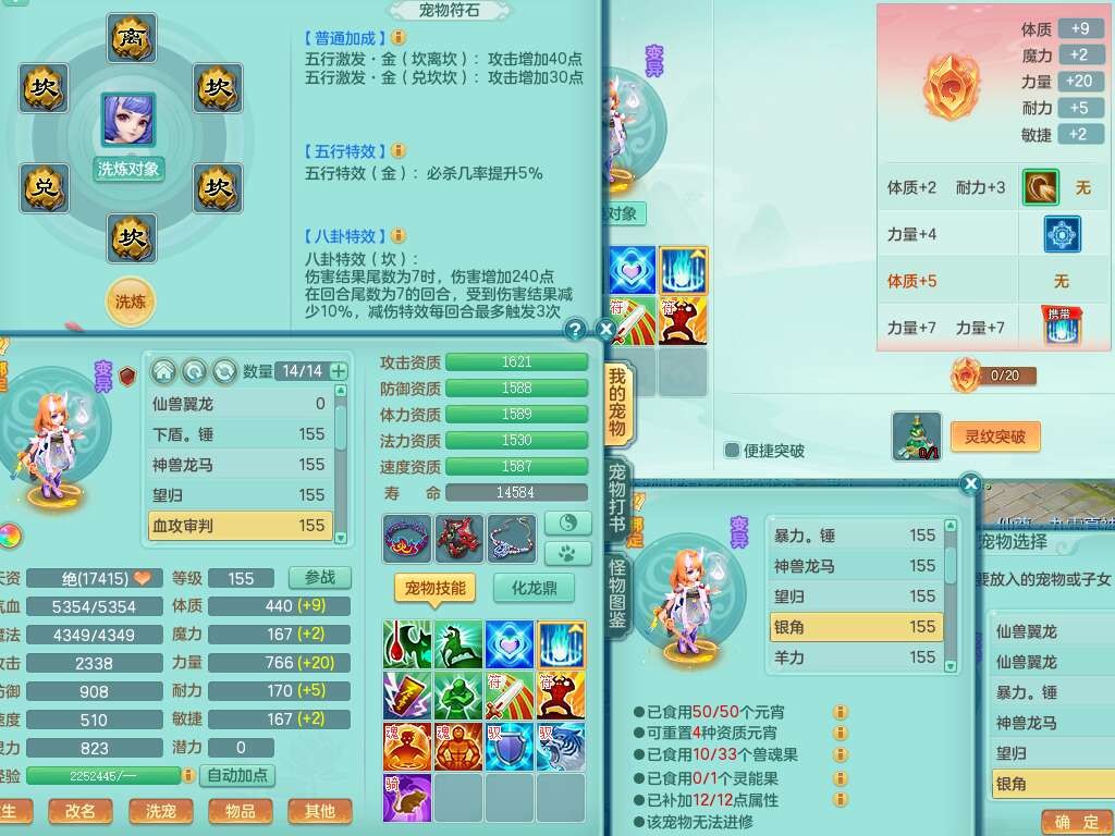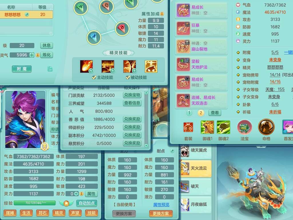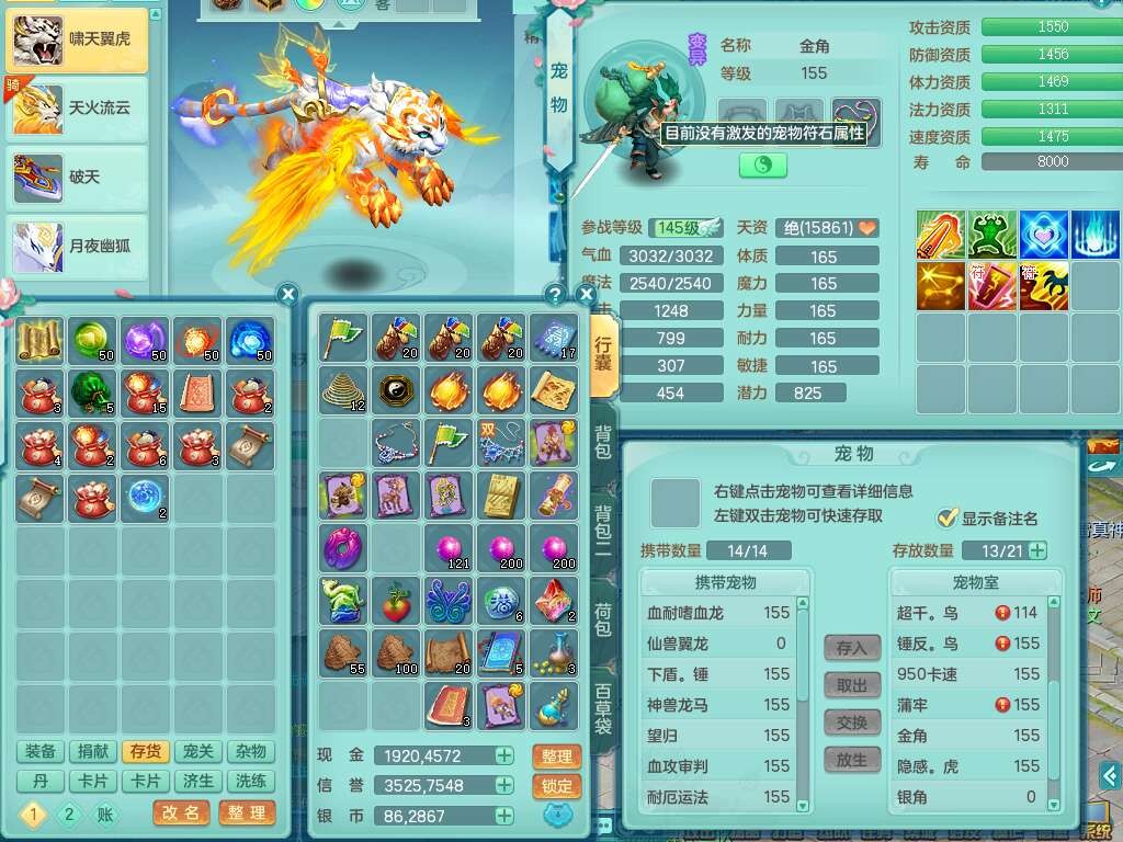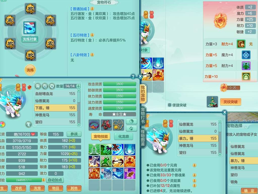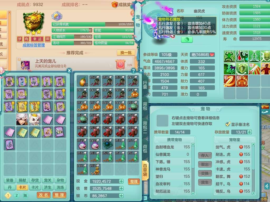 p21984阳春白雪159男万兽,精灵歌,2龙(1龙无内),2内胆神,1破镜,4只觉醒,1只6技能镜花灵,901狂暴单加武器,崩山衣服,坚毅罗汉链子,三红追捕易成长破血单加鞋子,4.5基础鼎,身上7只满果子,4只坐骑。