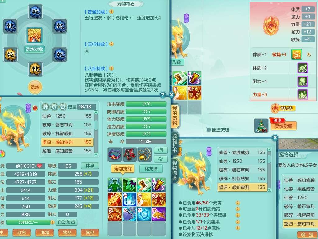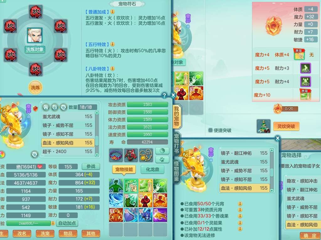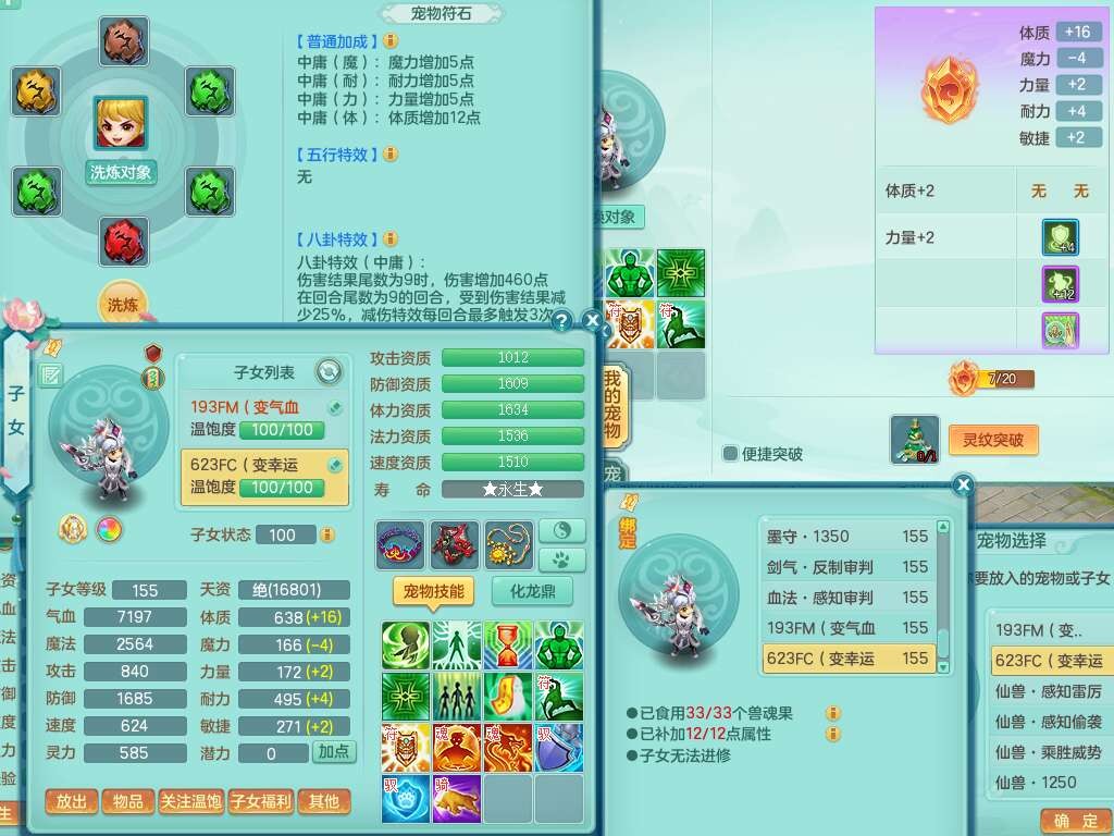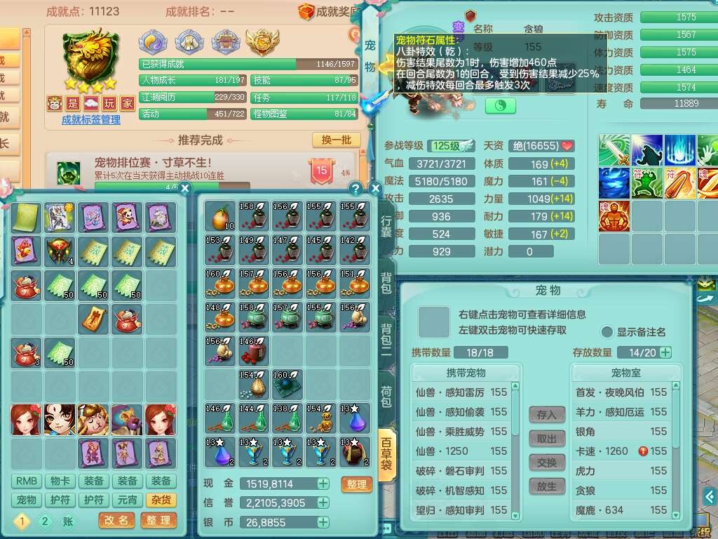 J21979扬名立万159男灵月山,精灵舞,4龙2内胆神,【12只觉醒,已潜龙】,6宠皮,4位靓号不含4,3只六技能镜花灵,2只6技能龙姬,3特殊(墨守,守护,翻江),愤怒六特,5.5基础鼎+70攻、280血,15个格子,11个纯六字,2个五字,23只满果子,宠排在榜,3只坐骑,神驹马到成功+火焰之力,月卡还有179天。带2个159奶粉。