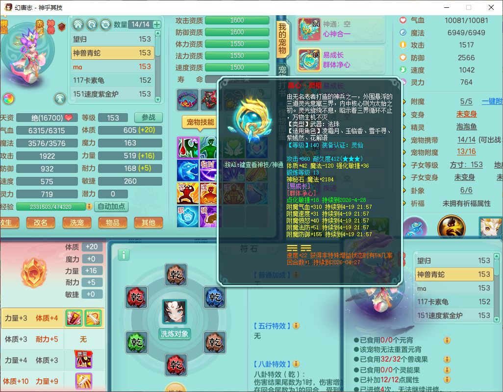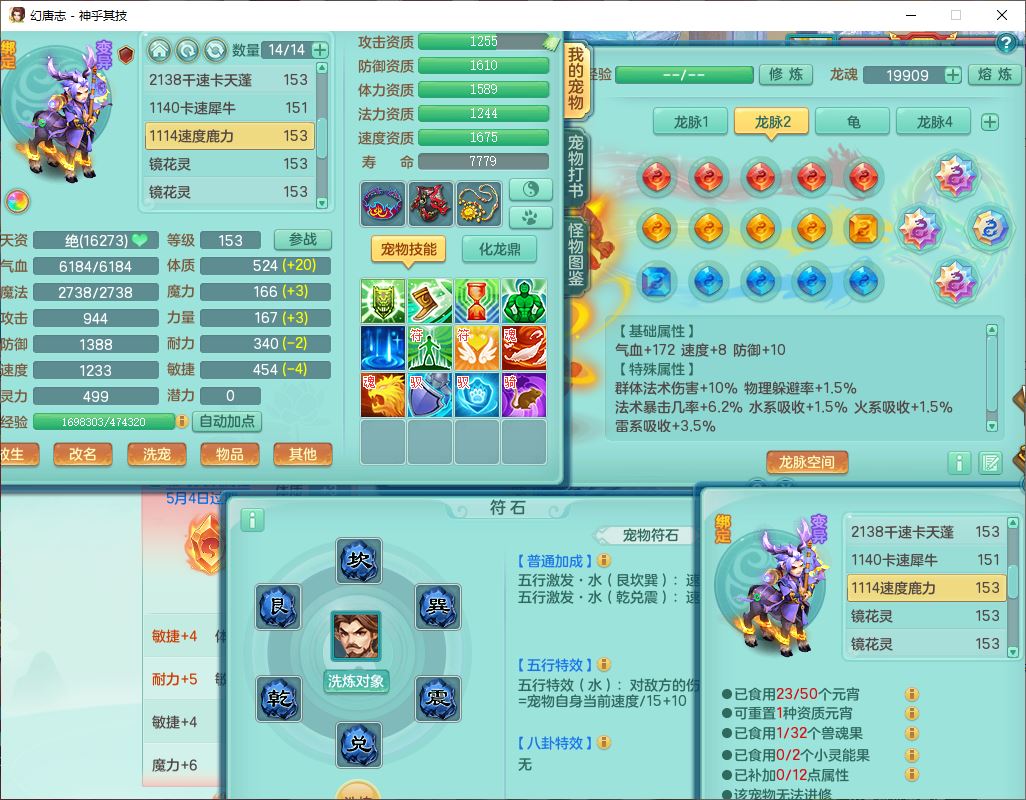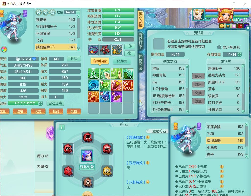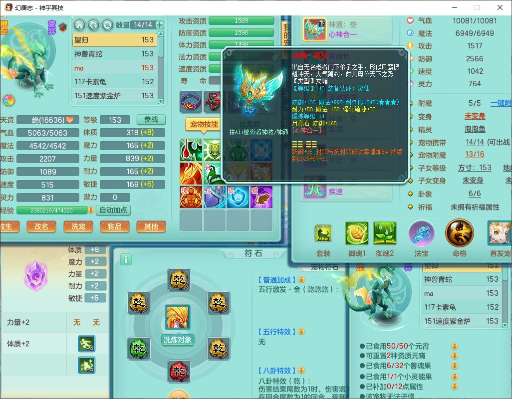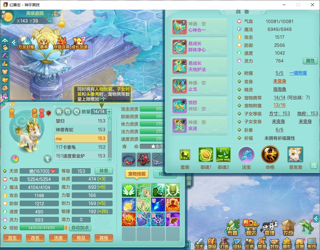 62437神乎其技148女普陀【马上发财】准精灵舞,2内(1青蛇1龙马)1望归1金炉2镜花1飞羽1童子,2宠皮2孩子(地府+方寸),8红装备,Y晶清武器,Y罗汉衣服,133天月卡,冰晶庭院195房屋186,永久背饰、精灵皮肤,经验、宠排在榜,1双人飞行坐骑,带双重