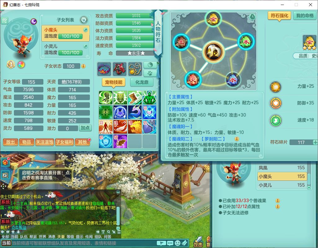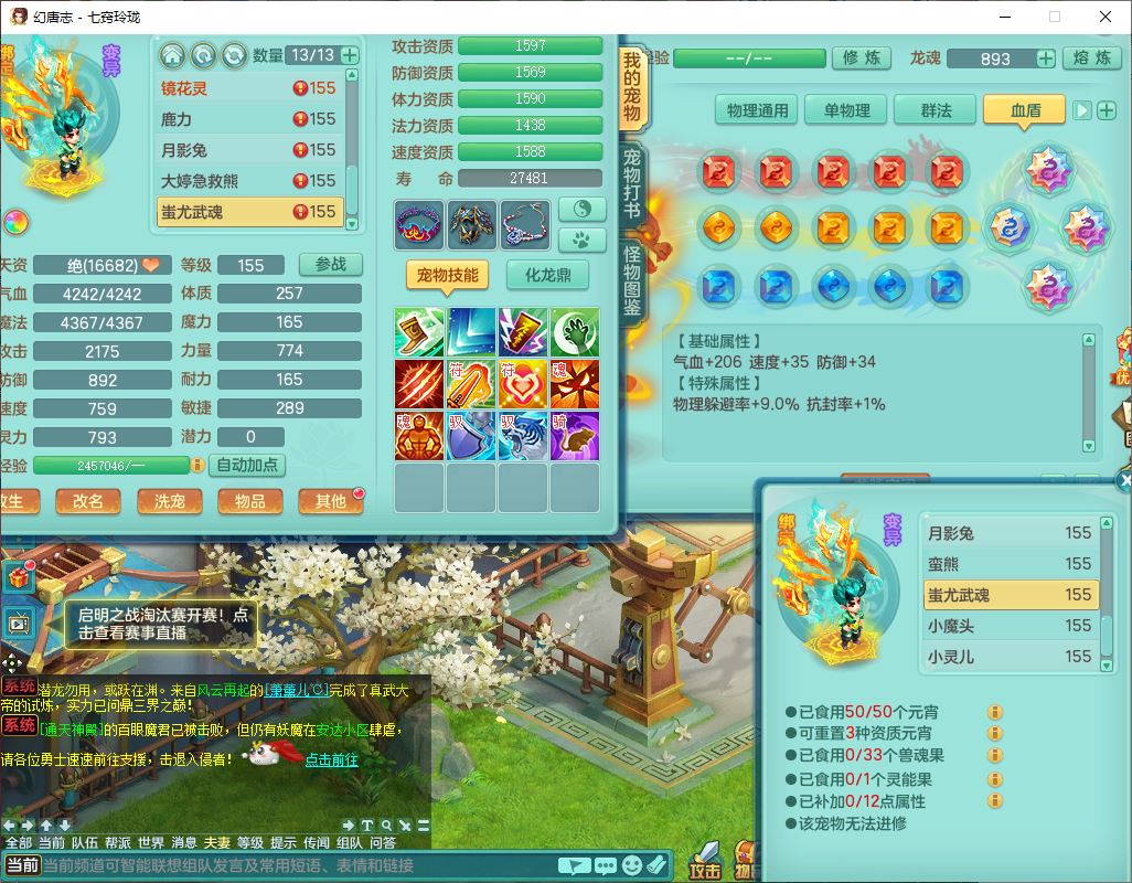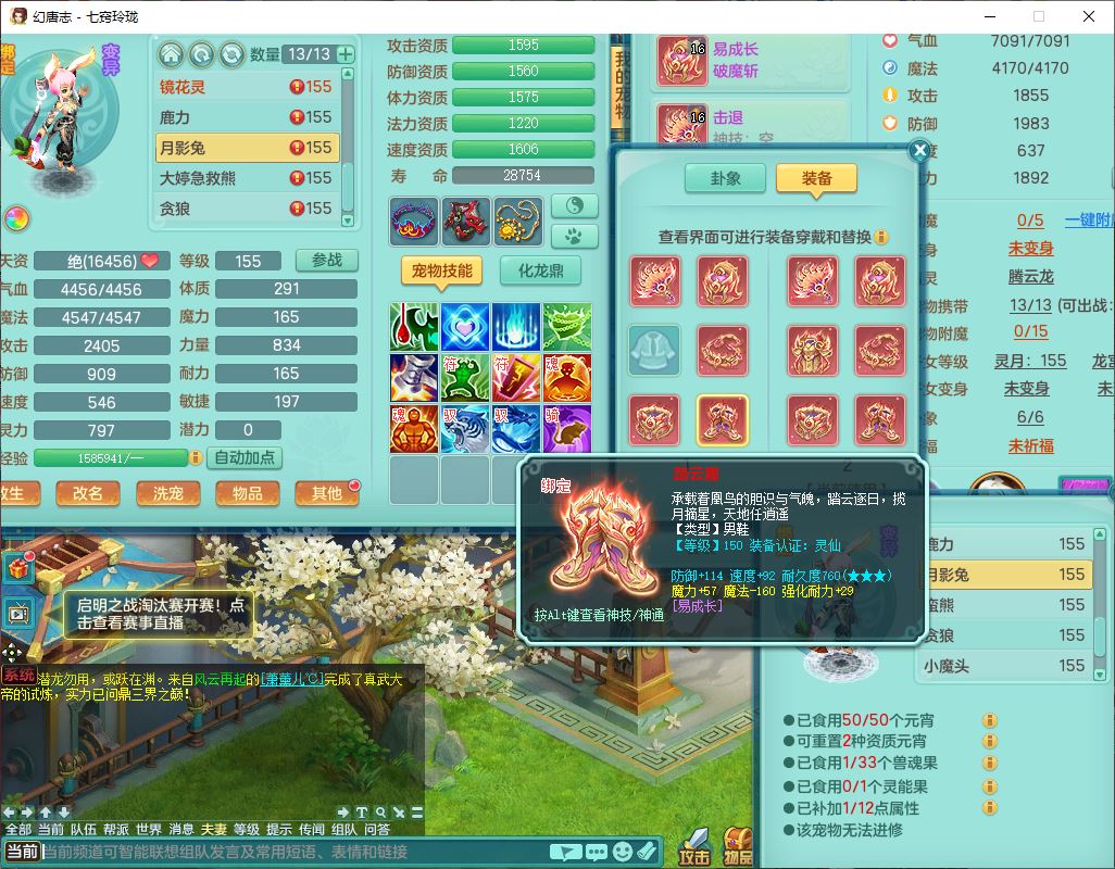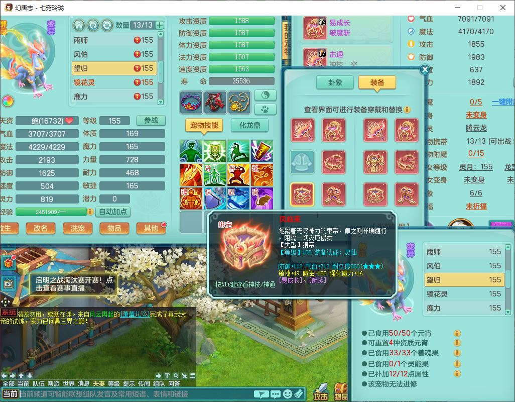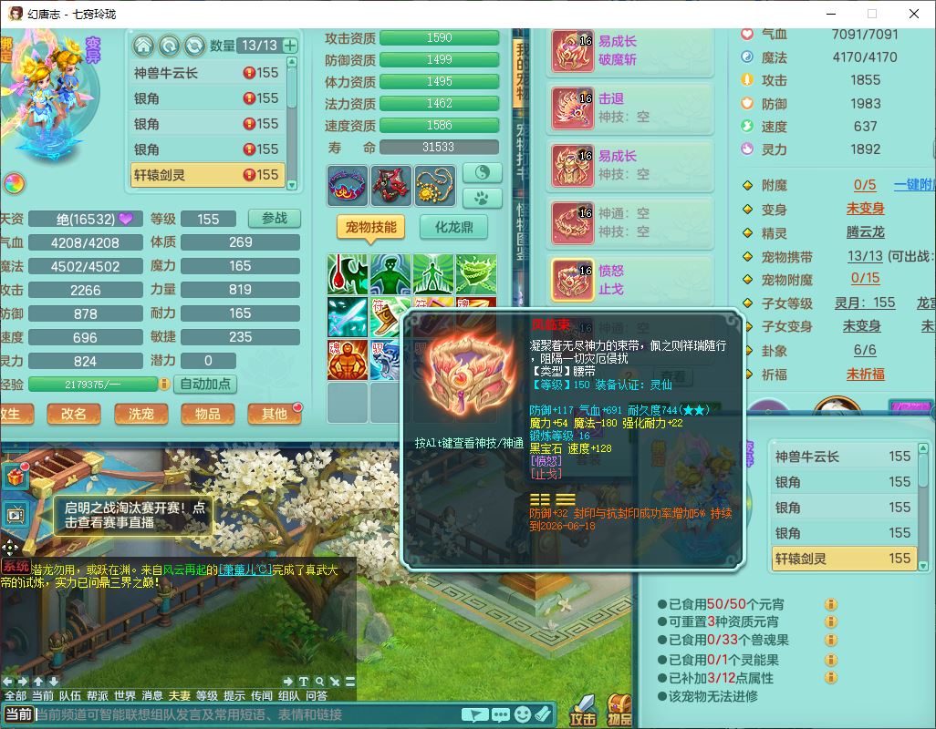24307七窍玲珑159男天宫精灵舞,1内5特殊(影袭、琴音,兽决登云、焚心、剑胆)1镜花,8只满果子,宝宝种类齐全,7红全单加装备,Y破魔帽子,愤怒止戈腰带,五雷鞋子,一套物理装备,狂暴破魔武器,神佑项链,鼎5.5,400多w神武币,2坐骑
