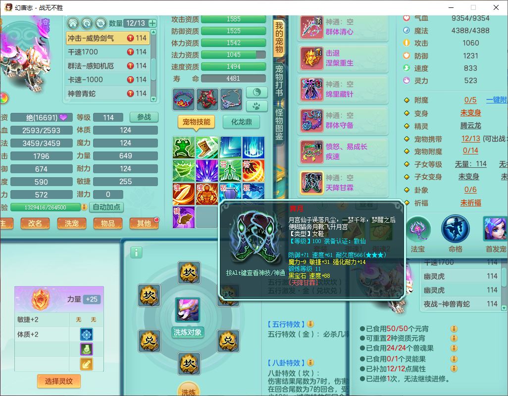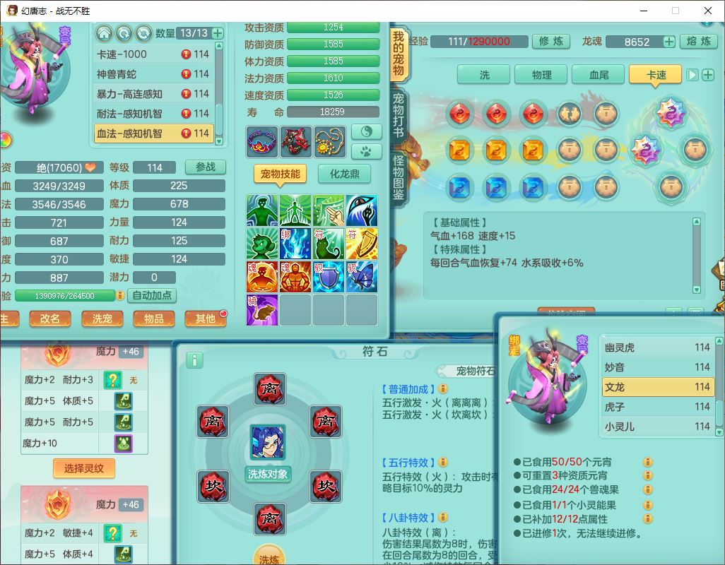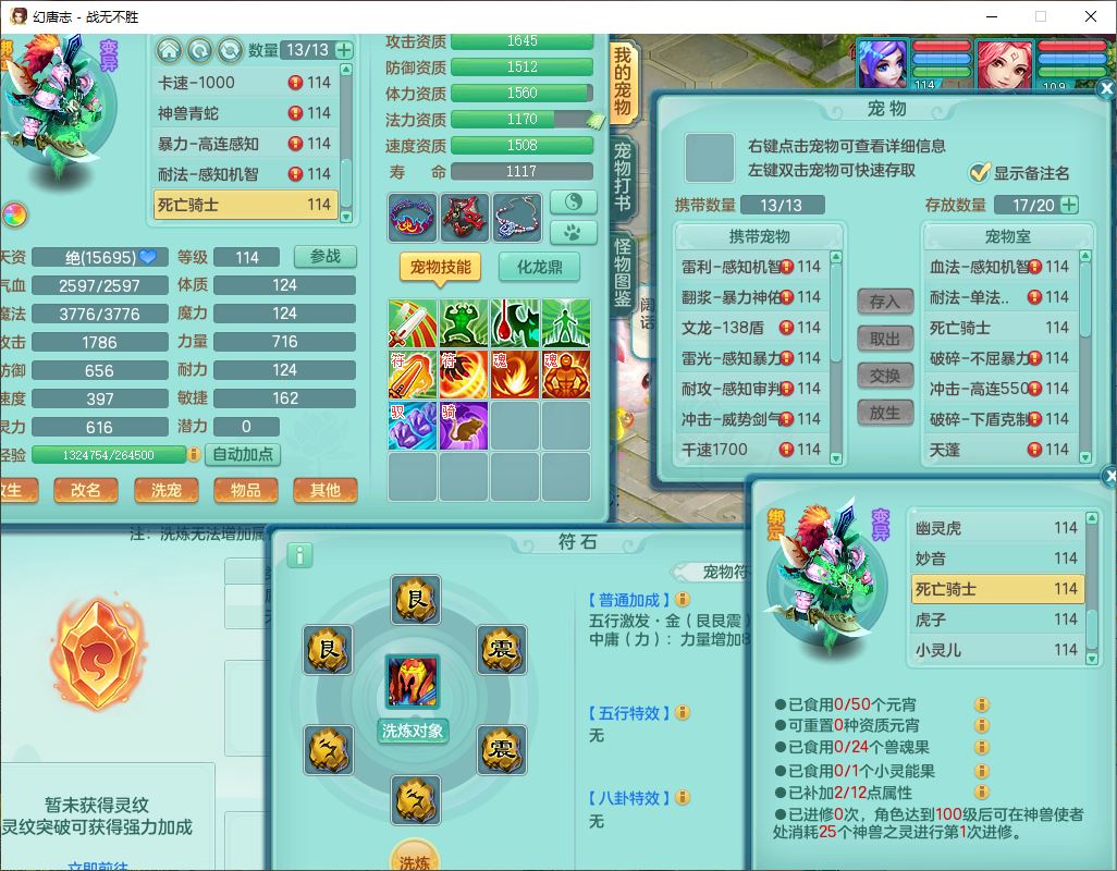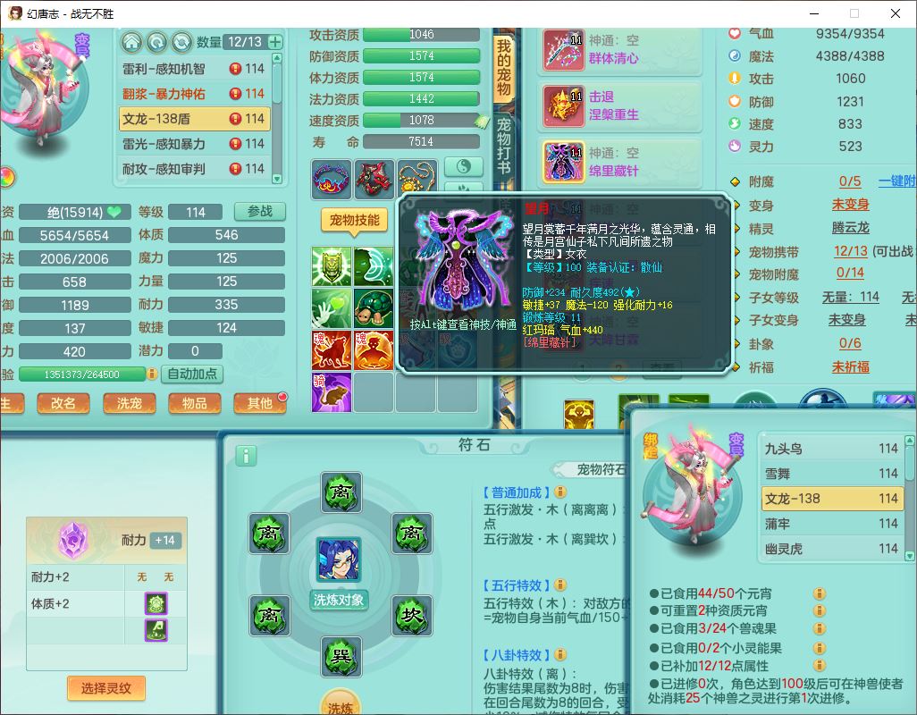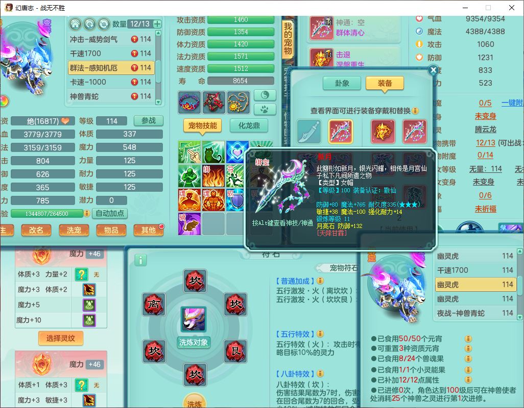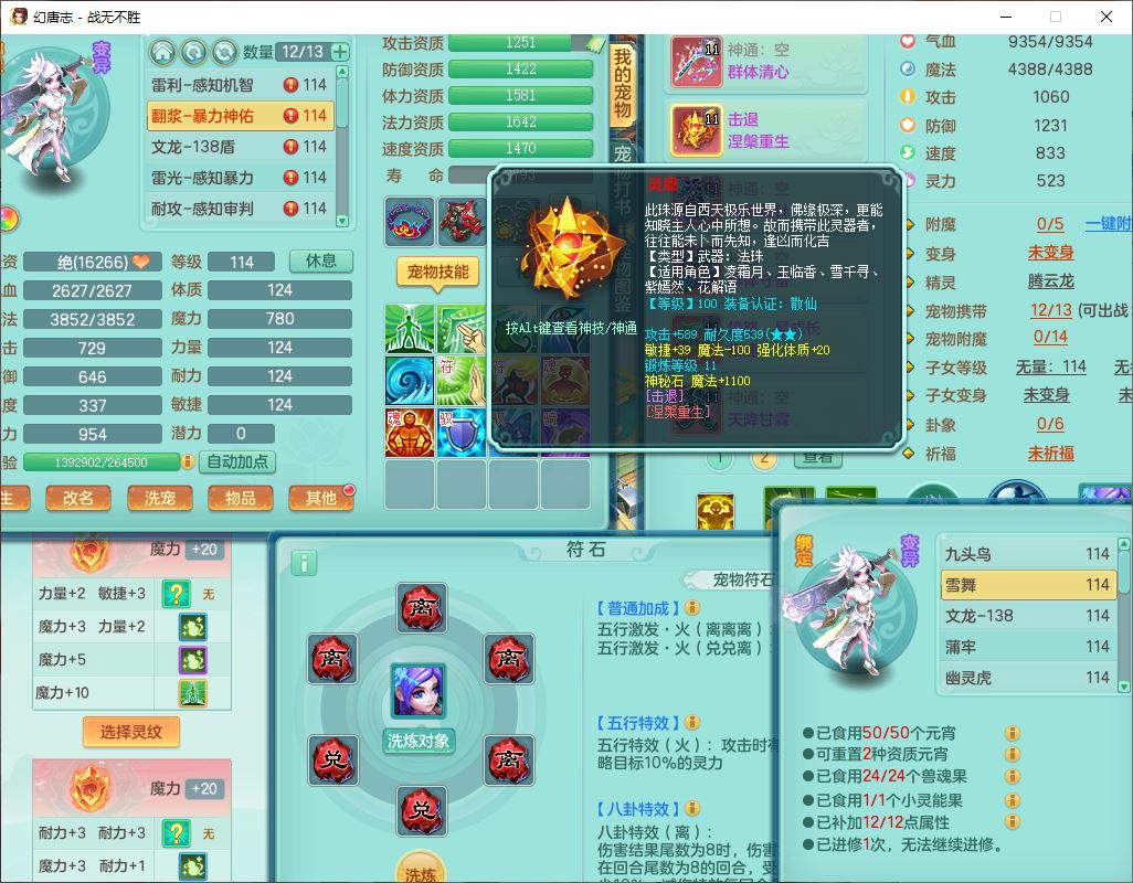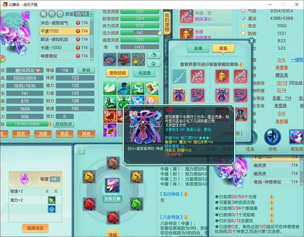 24305战无不胜109女方寸【潜龙过半】精灵舞,1内丹青蛇2羽袭1翻江1雷利8幽灵虎,4觉醒1宠皮3六字13四字(1洗练珠)13只满果子,9红全单加装备,击退慈航武器,愤怒Y疾速腰带,鼎2.5+42+168,100多w神武币,60个仙兽灵,1双人坐骑,带158奶粉
