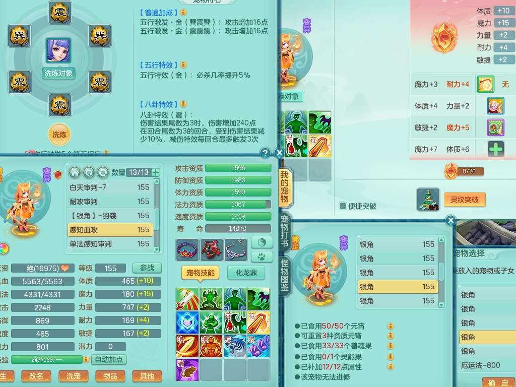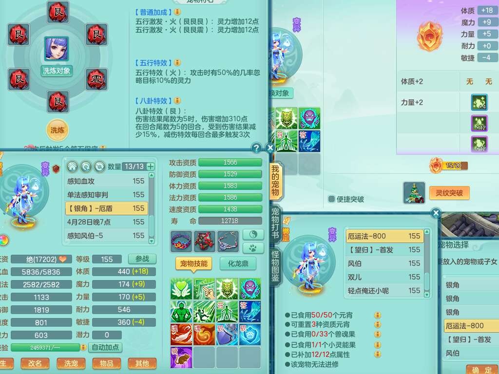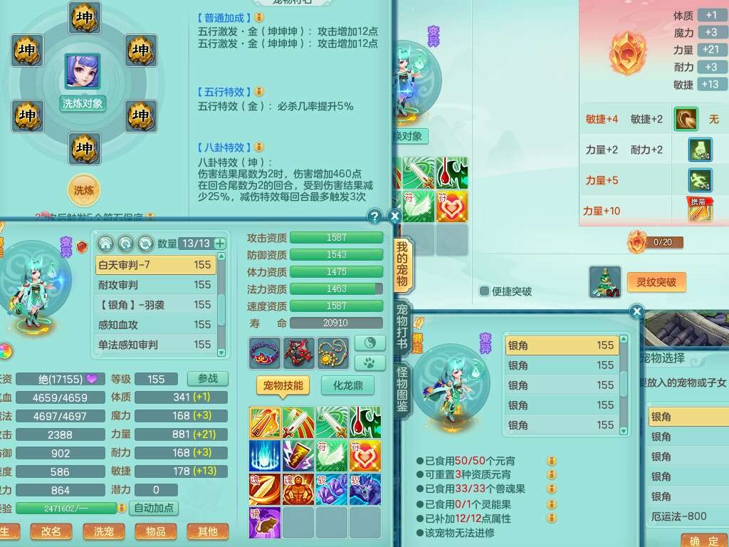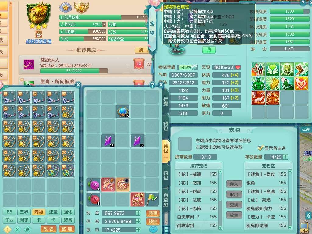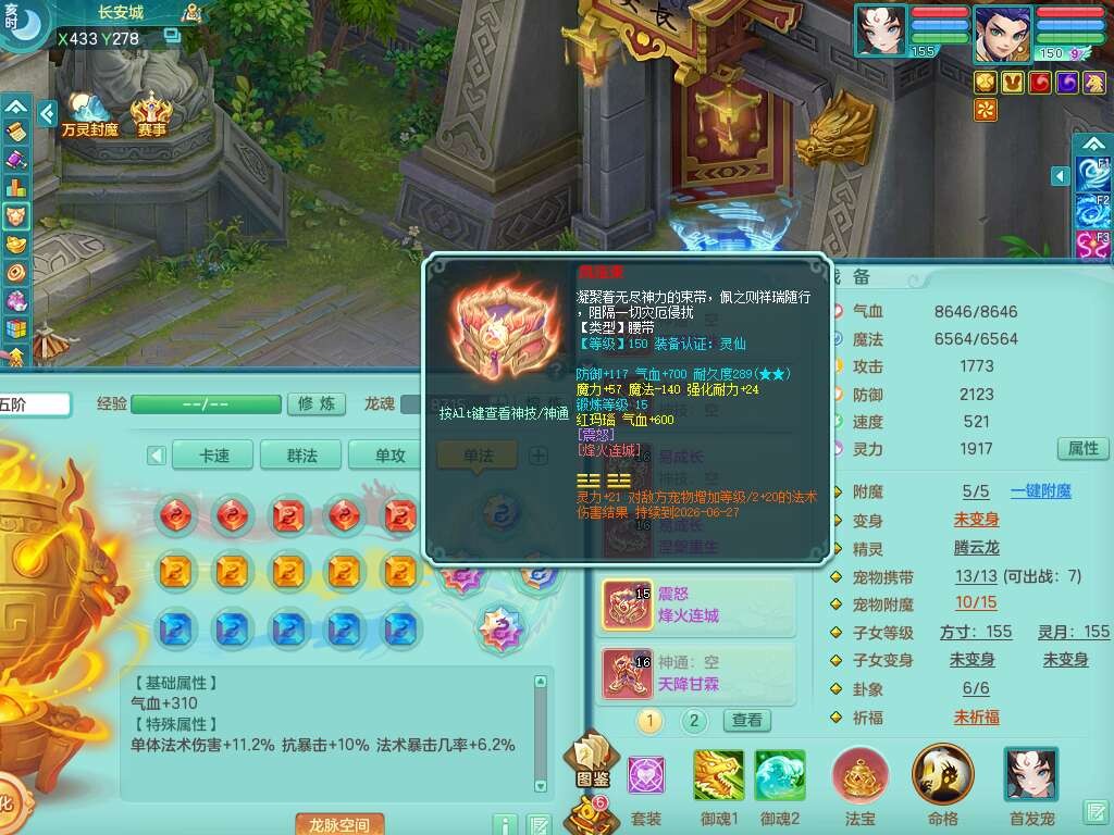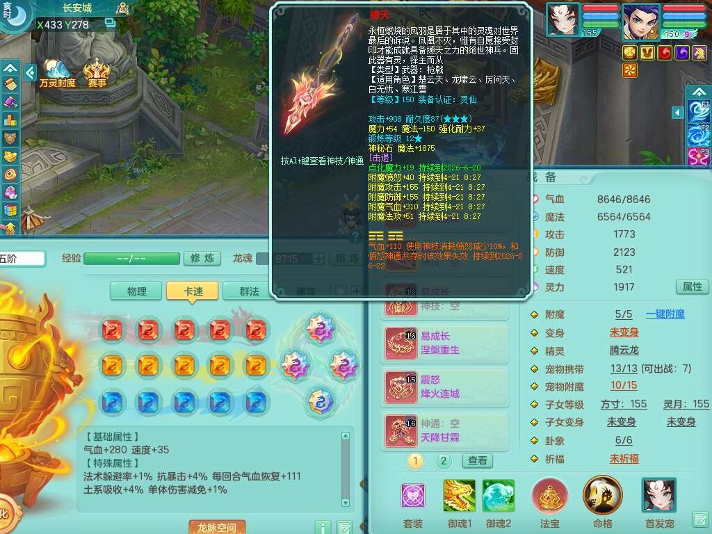 A22274七窍玲珑159男龙宫,精灵歌,1内胆神,【13觉醒,已潜龙】,3特殊(羽袭,琴音,上善),4只六技能镜花灵,五雷头,击退单加54武器,易成长单加50衣服,271易成长慈航链子,震怒烽火单加57腰带,5.5基础鼎+70攻+280血,7个纯六字,1个五字,13只满果子,宠排在榜,有63个神兽内丹碎片。➕159女灵月山奶粉,双红躲避玉清单加衣服,双红愤怒烽火腰带,六特,4.5基础鼎。
