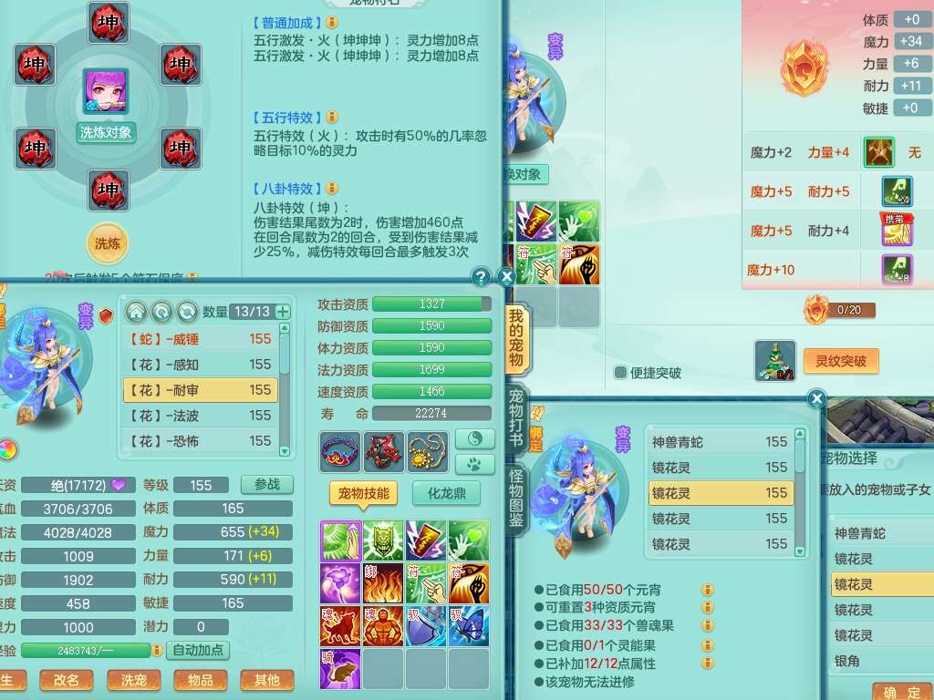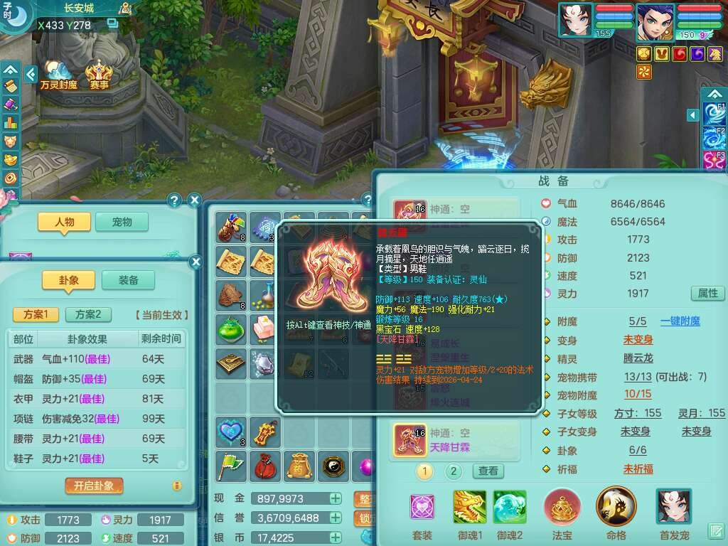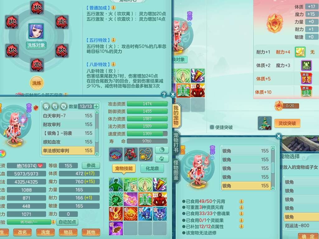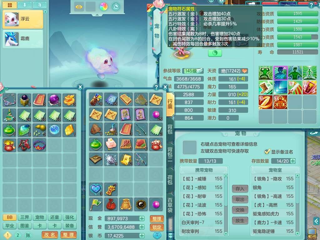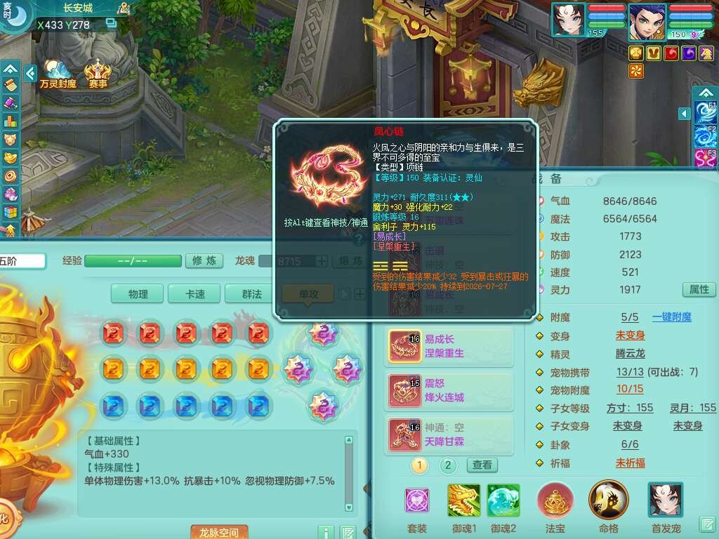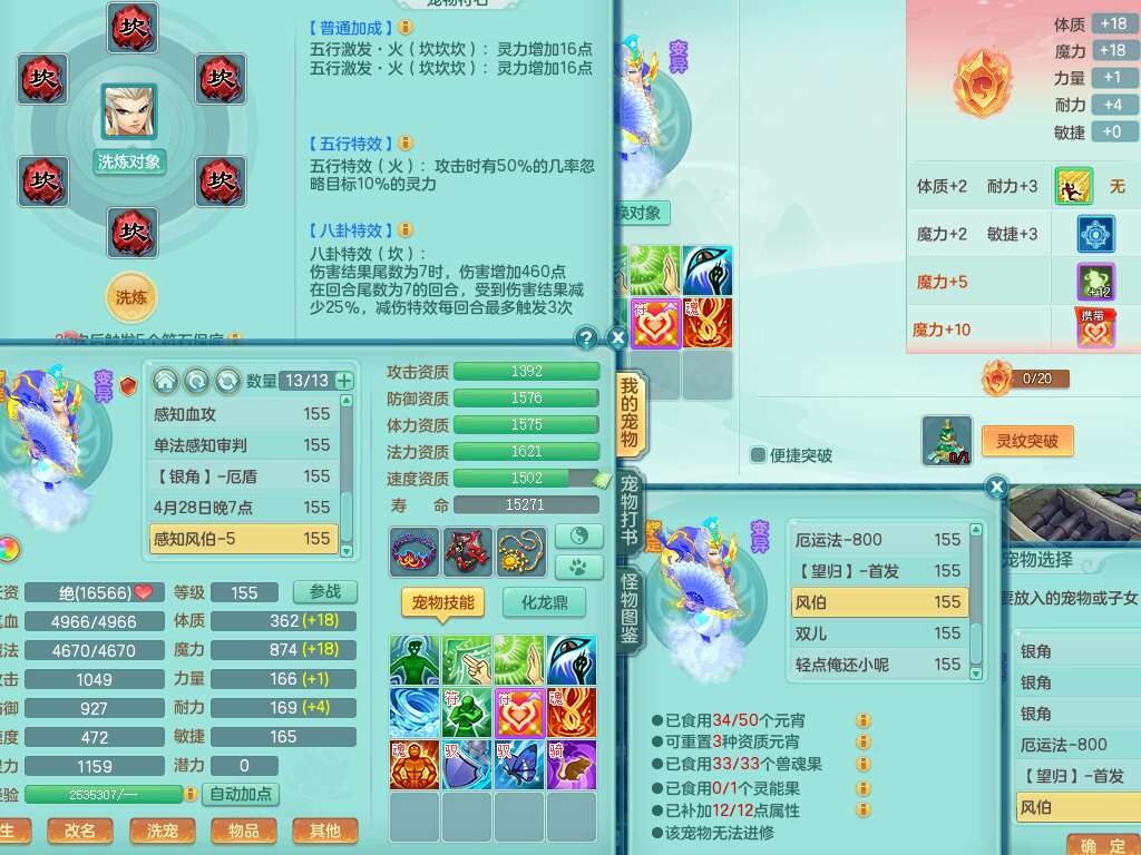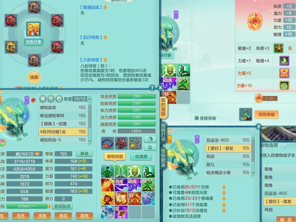 A22274七窍玲珑159男龙宫,精灵歌,1内胆神,【13觉醒,已潜龙】,3特殊(羽袭,琴音,上善),4只六技能镜花灵,五雷头,击退单加54武器,易成长单加50衣服,271易成长慈航链子,震怒烽火单加57腰带,5.5基础鼎+70攻+280血,7个纯六字,1个五字,13只满果子,宠排在榜,有63个神兽内丹碎片。➕159女灵月山奶粉,双红躲避玉清单加衣服,双红愤怒烽火腰带,六特,4.5基础鼎。