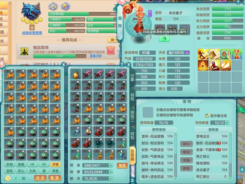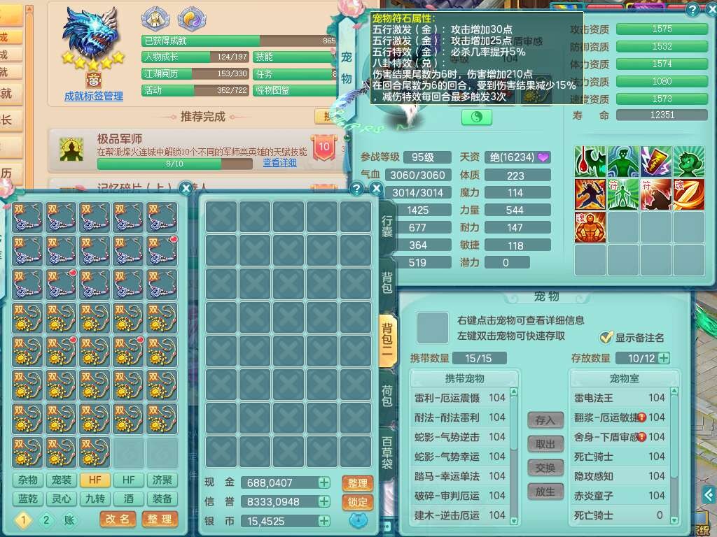 p22272,2024区99男无名谷,2龙4内胆神,3破镜,10觉醒,4宠皮,易成长单加32头,556易成长武器,神佑破血链子,崩山单加34腰带,易成长单加34鞋子,3个纯六字,1个五字,16只满果子,宠排在榜,双人坐骑,西瓜冰武器,81天月卡。